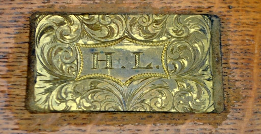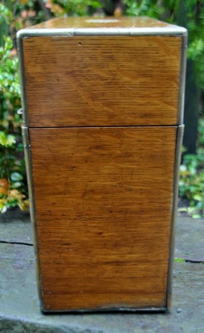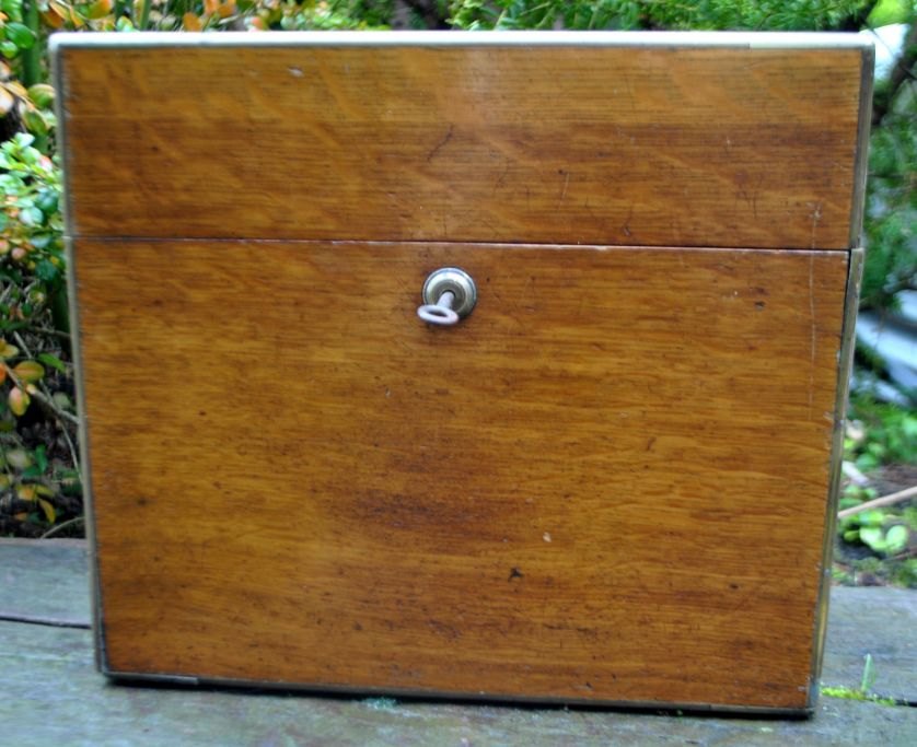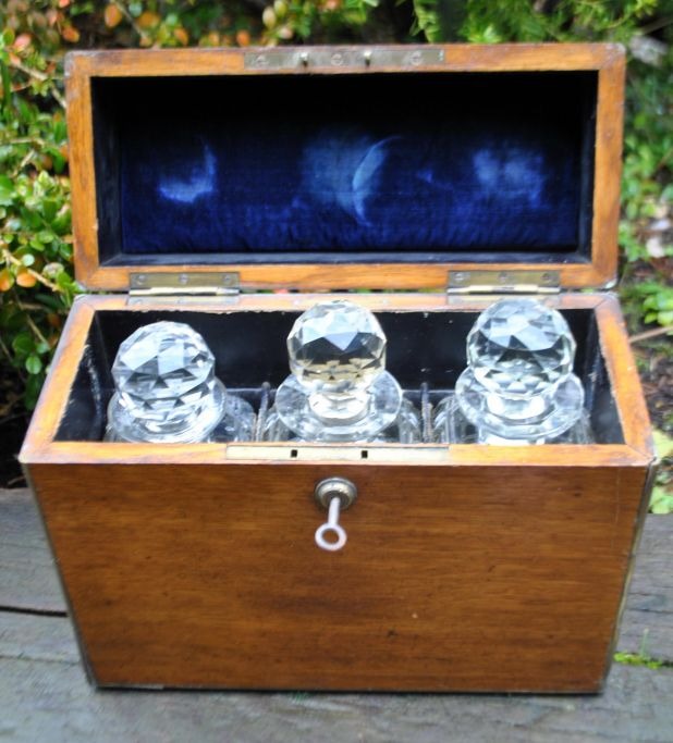 English tantalus with three crystal decanters, 19th century. Polished oak box with lock and key plate. Containing three decanters with stopper. Stamped. H: 27 cm. L: 30 cm.