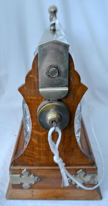 English tantalus with three decanters, 19th century. Polished oak. With silver-plated fittings and lock with key. H: 32 cm. L: 41 cm.