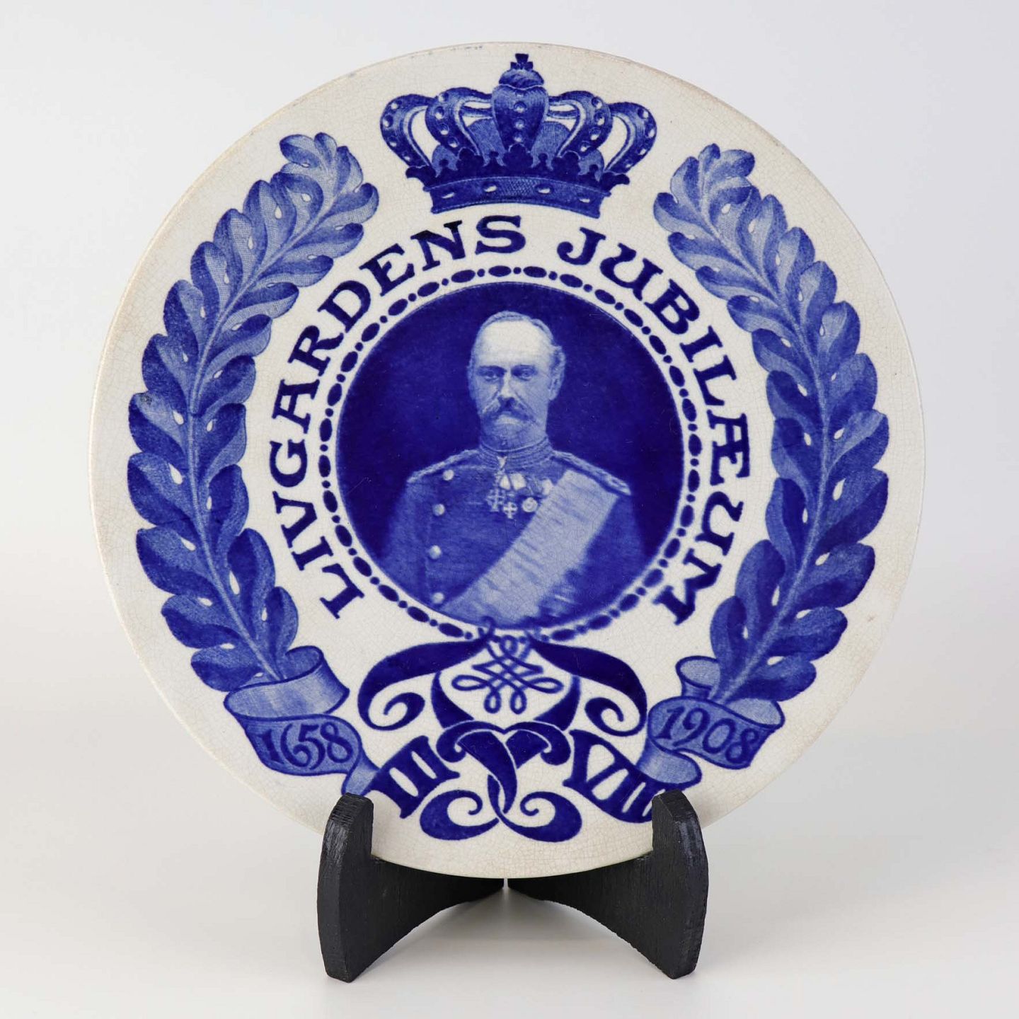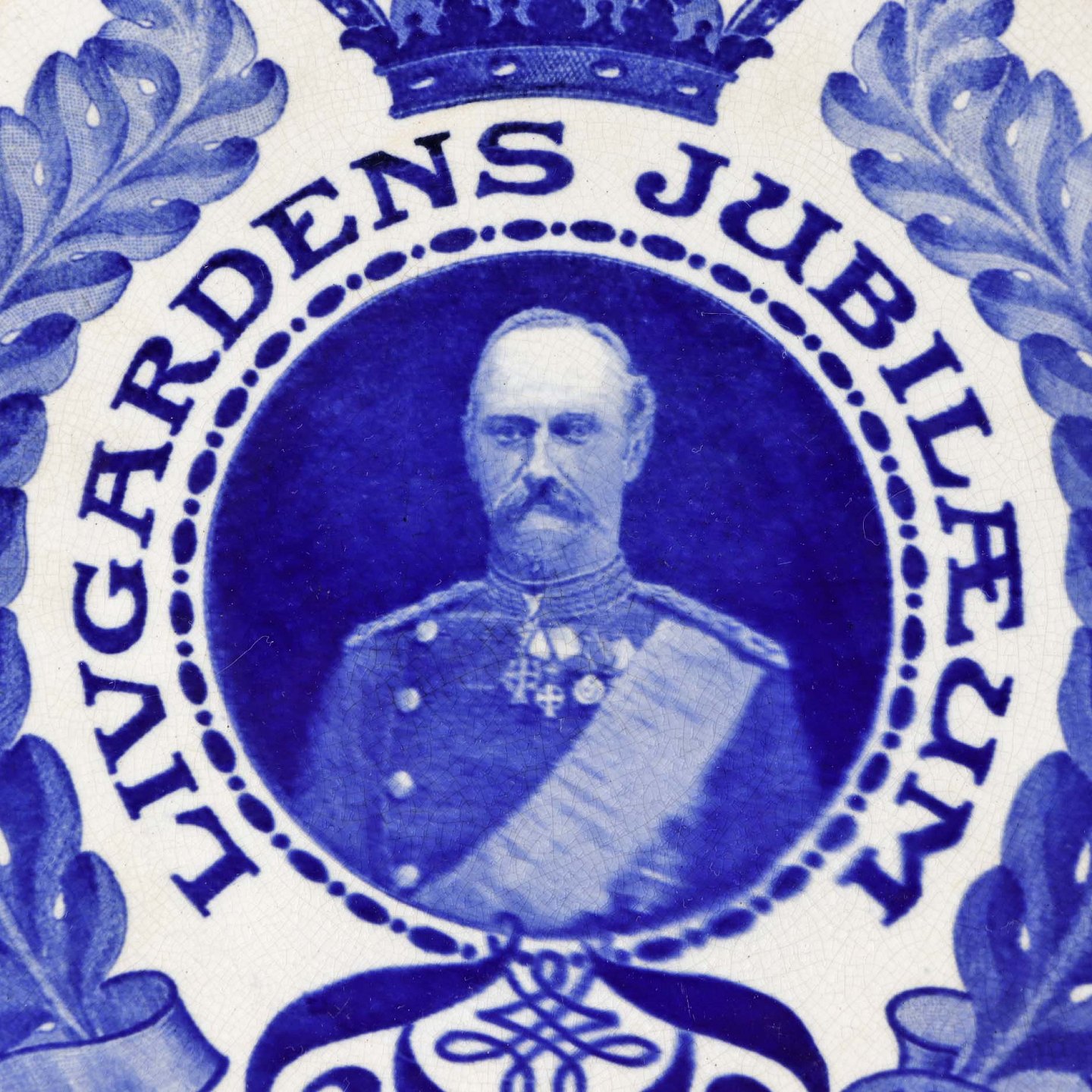 Text available in Danish: Platte i fajance, som blev udgivet i forbindelse med Livgardens 250 års jubilæum med teksten Livgardens jubilæum år 1658-1908 og motiv af Kong Frederik VIII