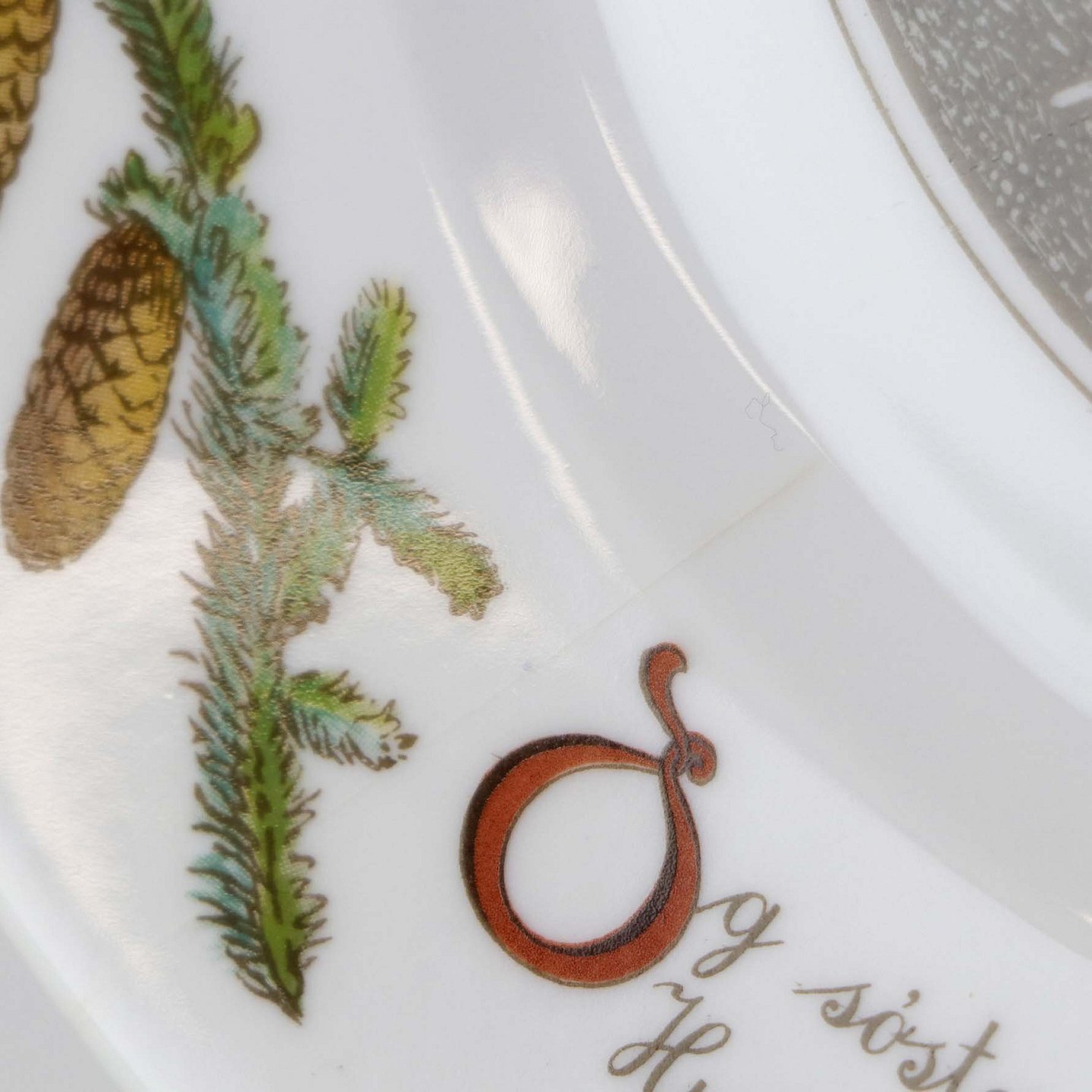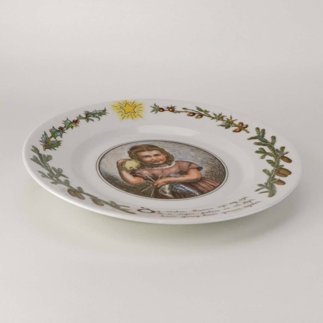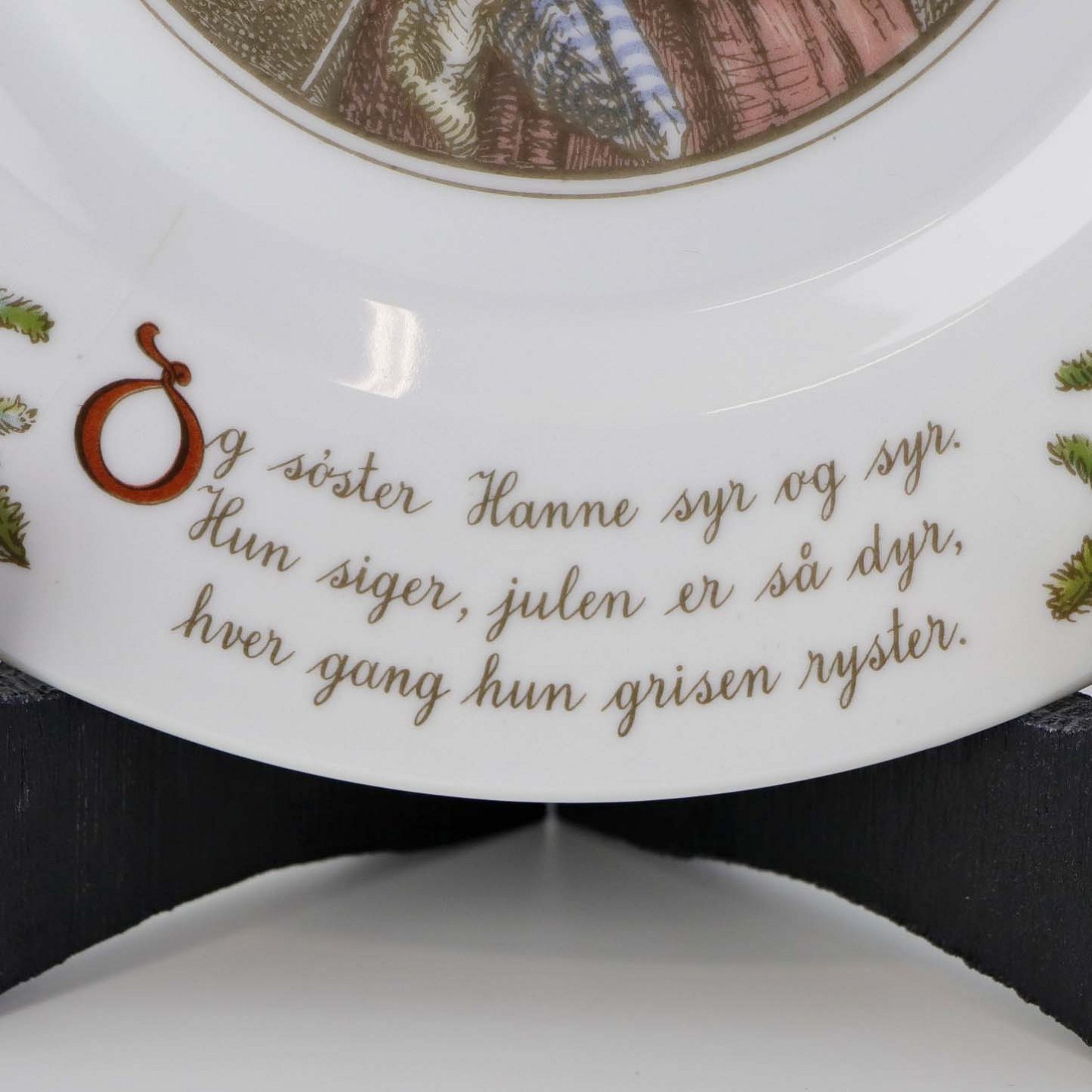 Teksten på tallerknen lyder - Og søster Hanne syr og syr. Hun siger, julen er så dyr, hver gang hun grisen ryster.