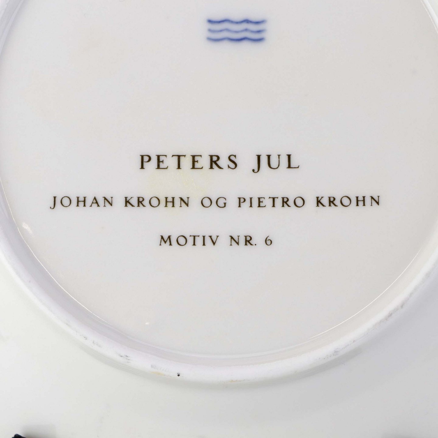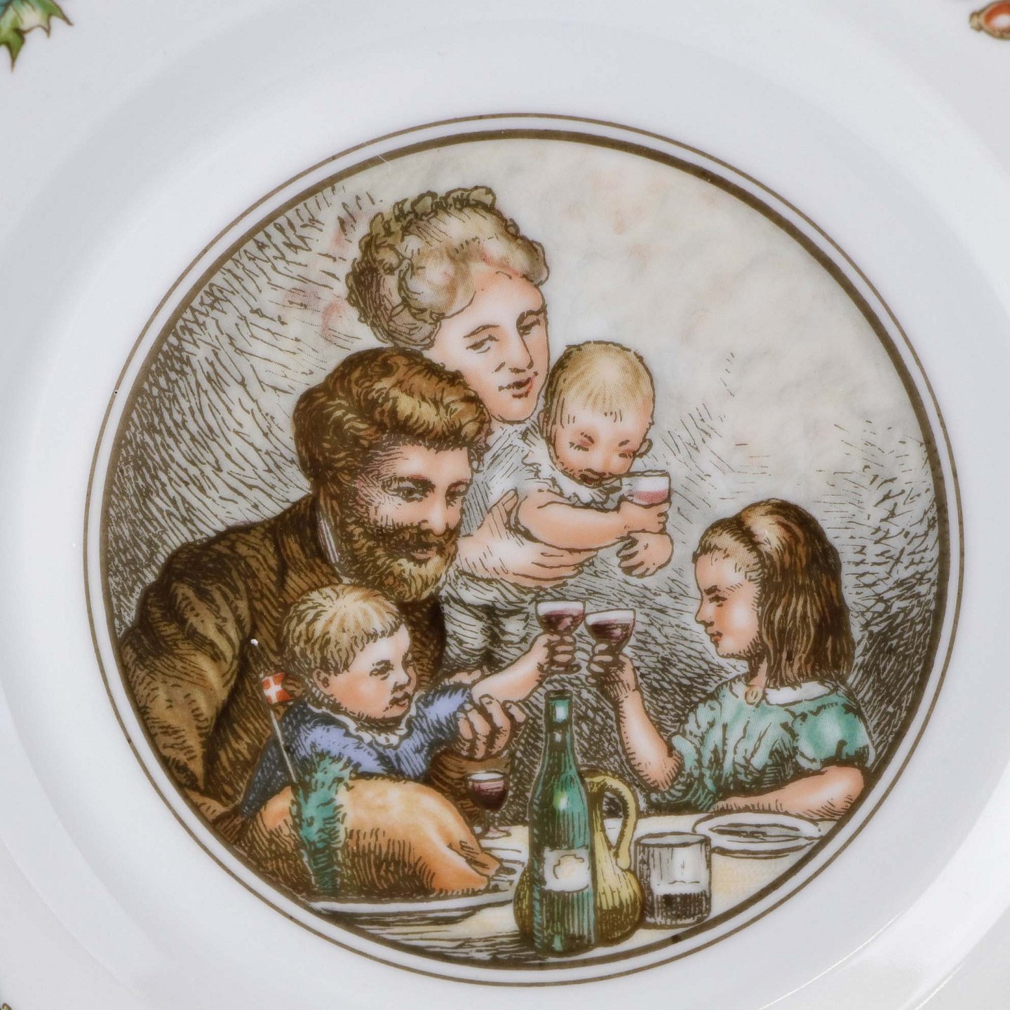 Flad desserttallerken i kongeligt porcelæn fra serien Peters Jul med motiv af julebordet med familien. Nr. 6