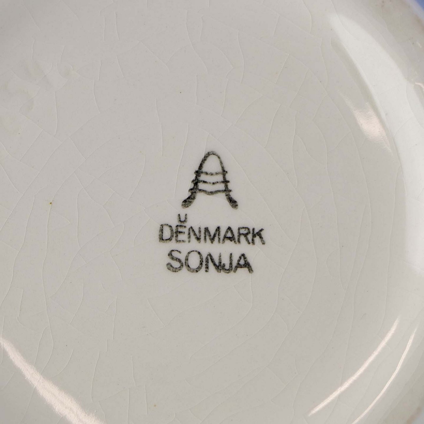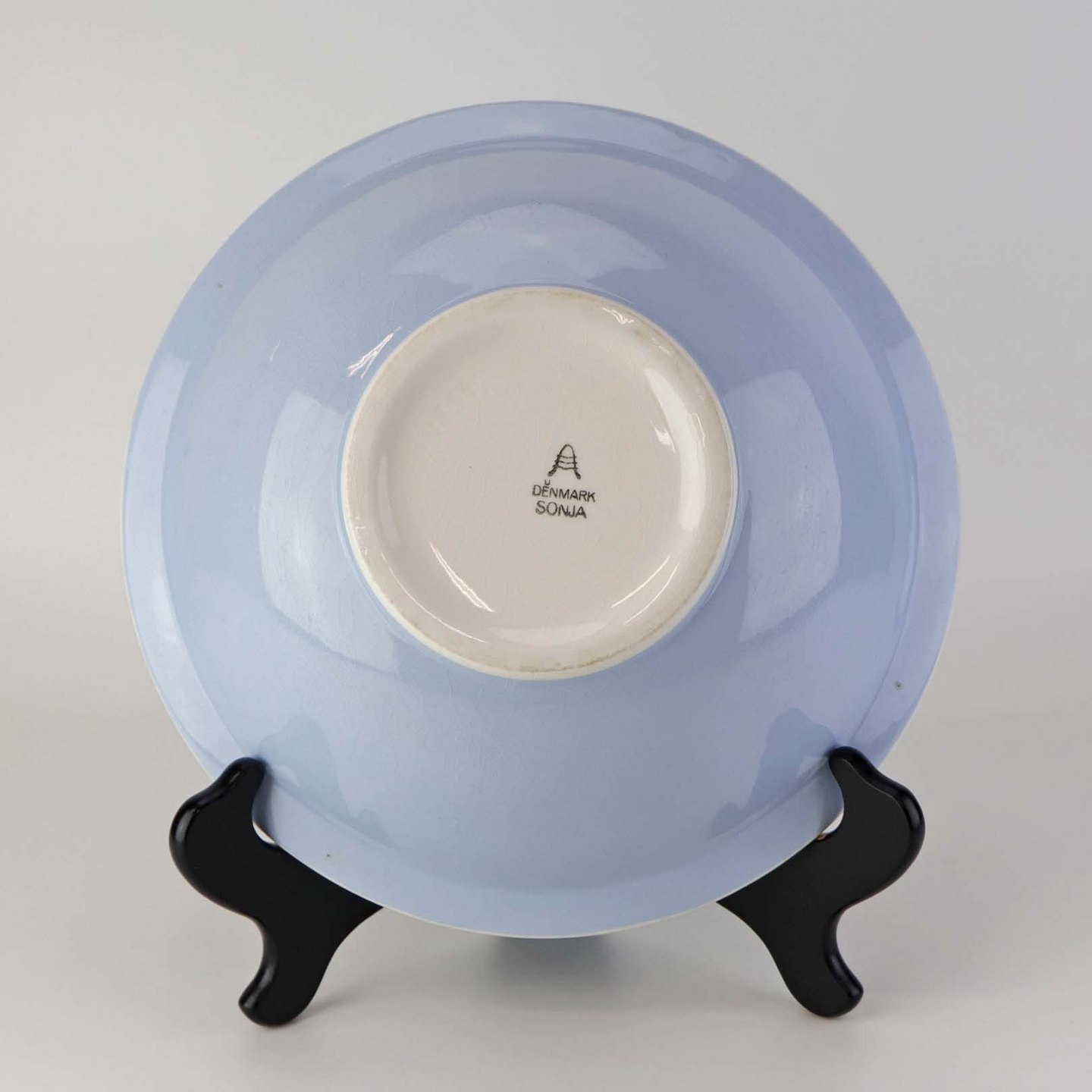 Service i lyseblå fajance dekoreret med tynd hvid kant.