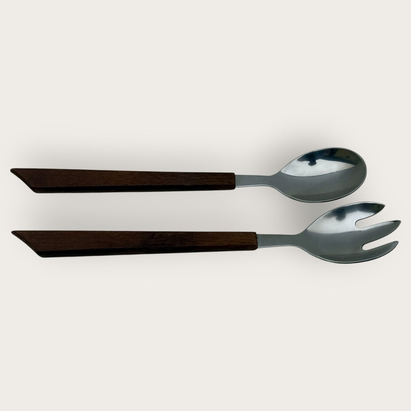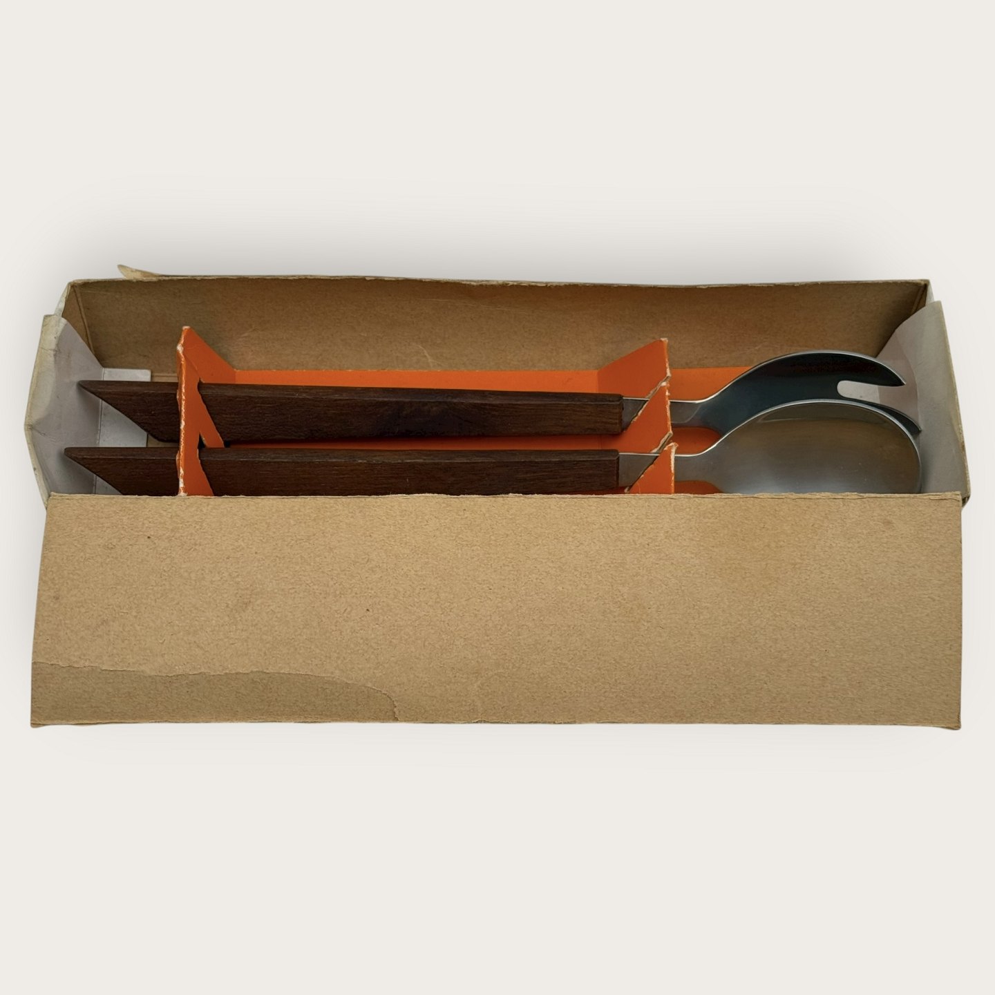 Con Form, Salad set in teak and steel from the 1960s, in original box, 26.5cm long *Box somewhat worn otherwise in good condition*