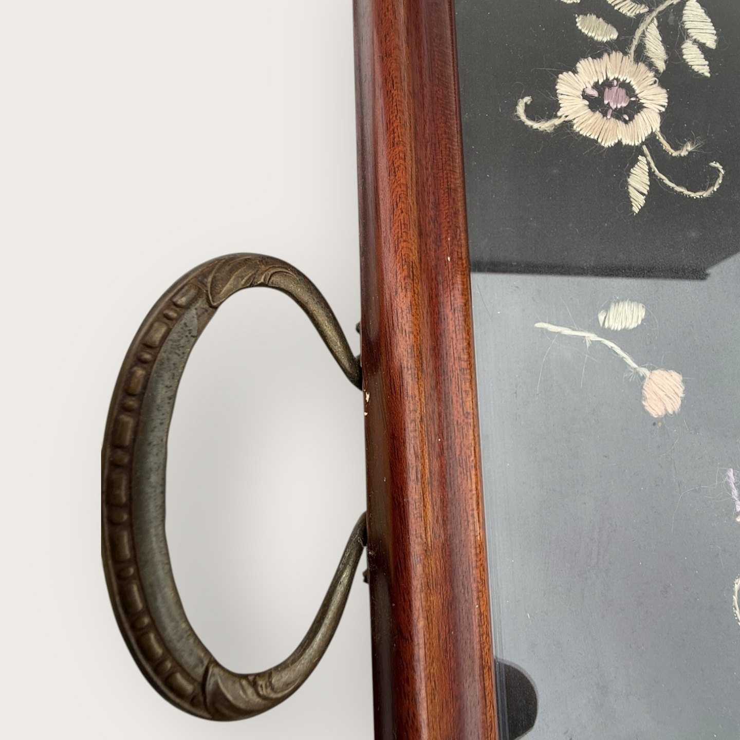 Tray with metal handle and embroidery under glass plate, 35x47cm (without handle) *nice condition*