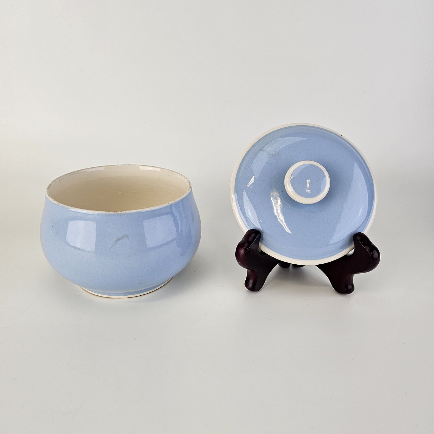 Fremstår med krakeleringer i glasuren og reparation af en overfladisk revne i låget