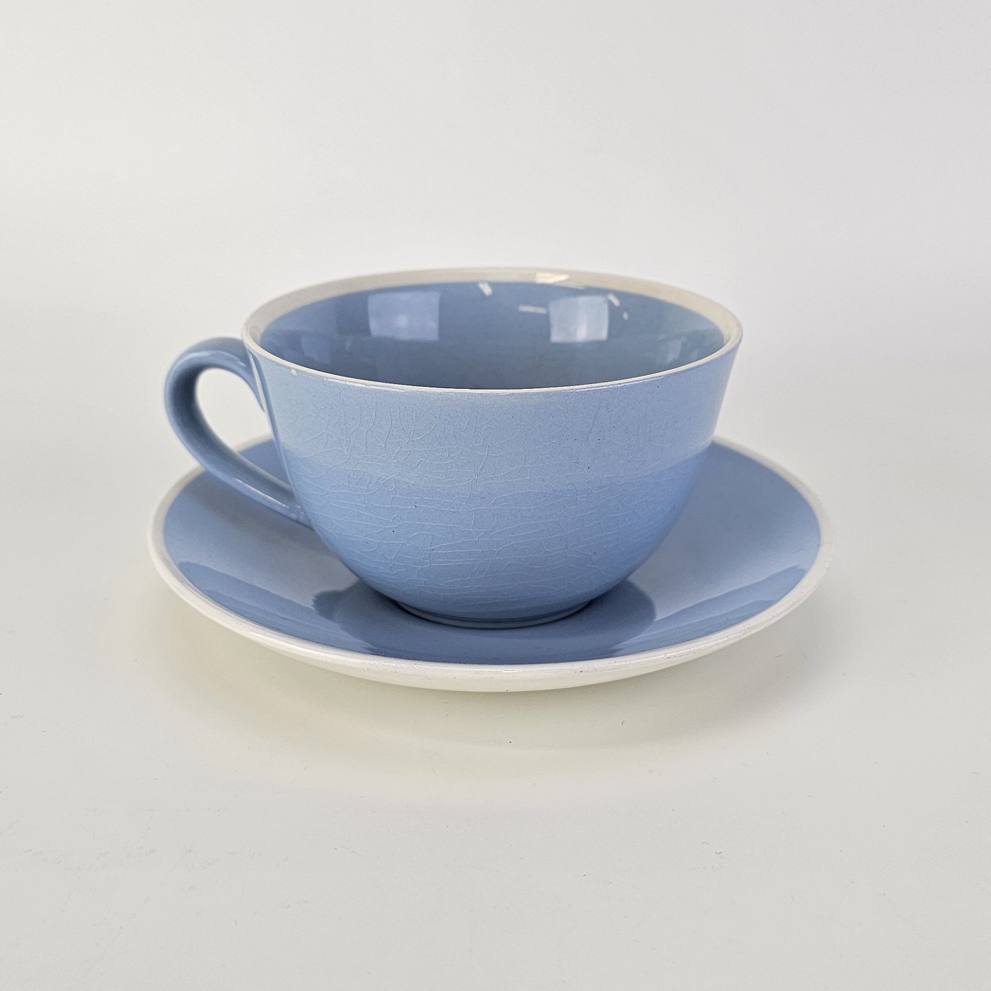Fremstår med krakeleringer i glasuren og nister på underkoppen