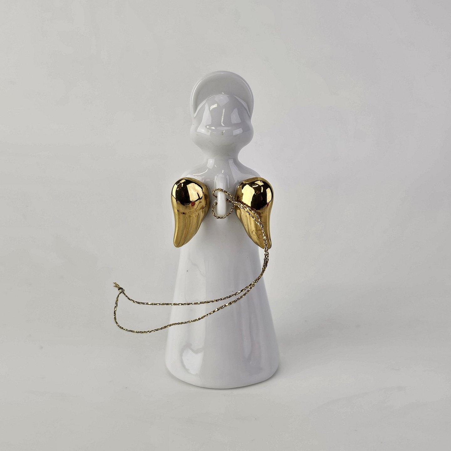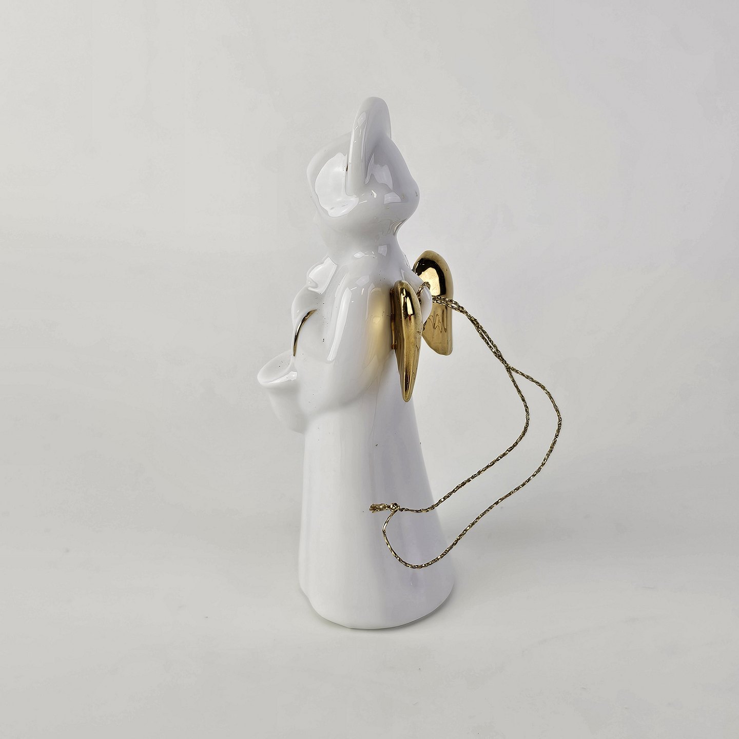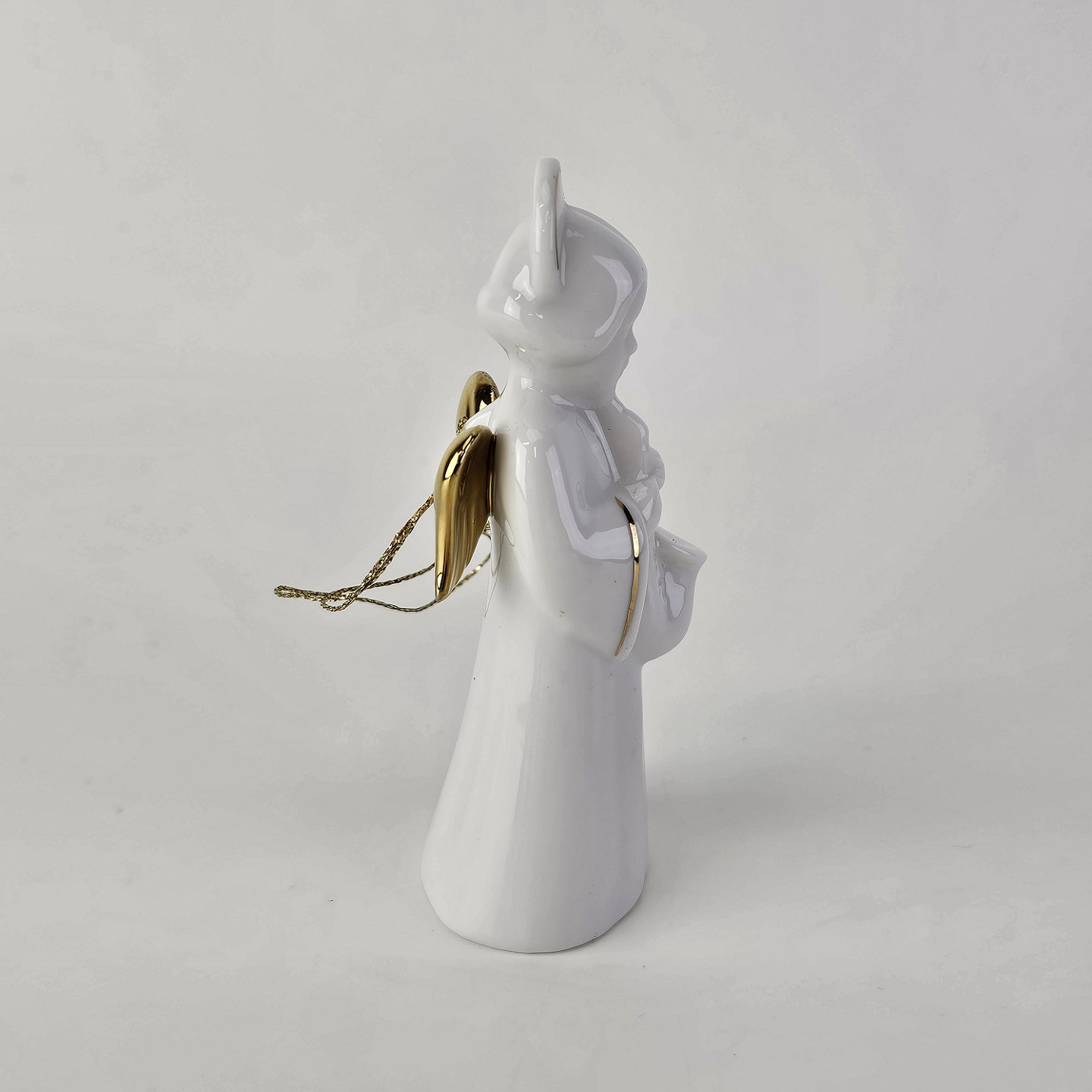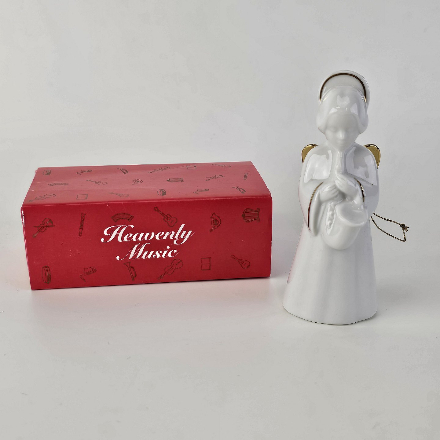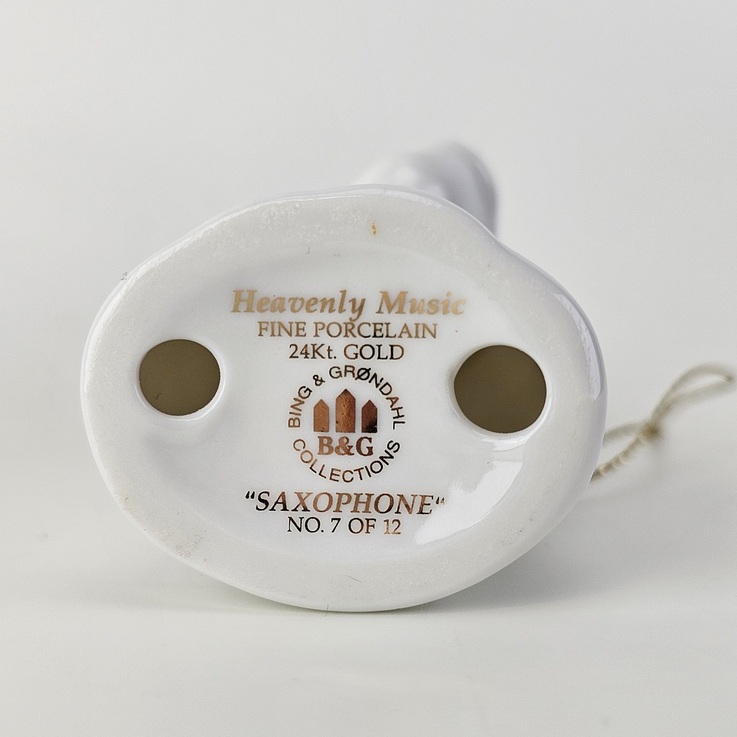 Text available in Danish: Figur med motiv af en engel som spiller på saxofon. Figuren er i hvidt porcelæn med forgyldte vinger og detaljer i 24 karat guld.