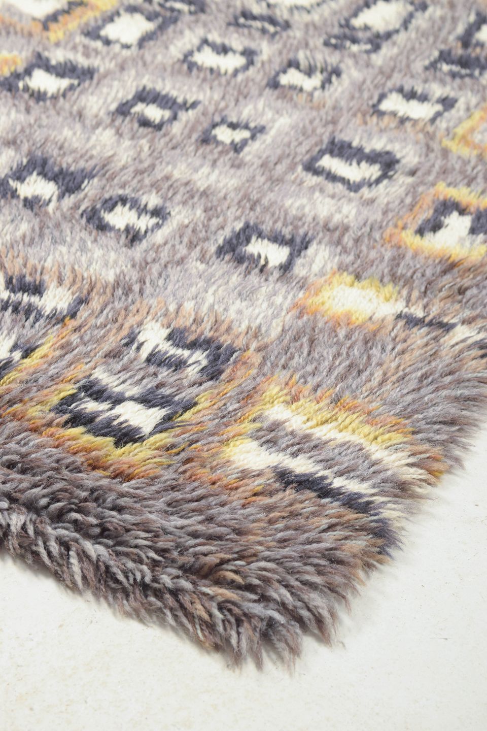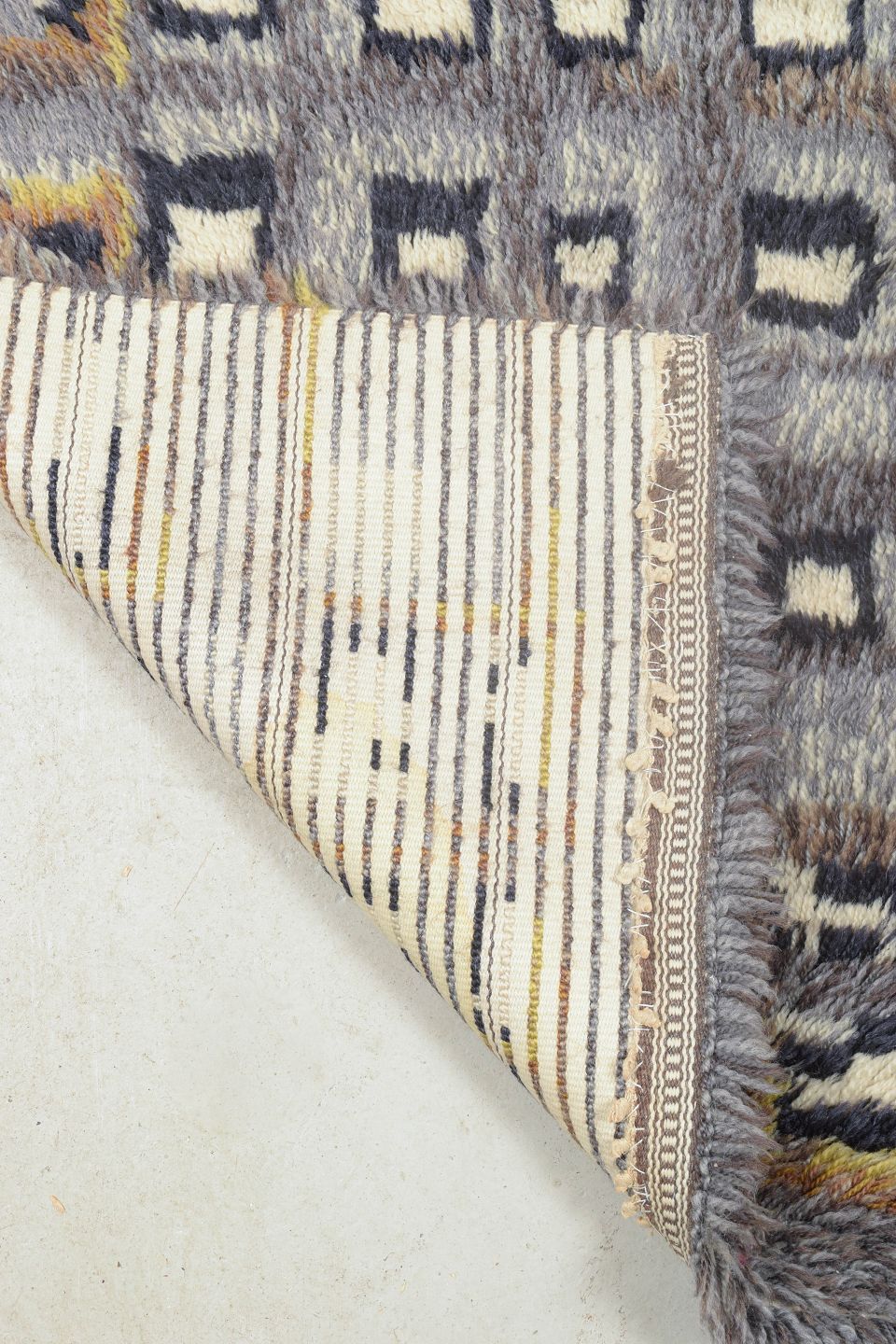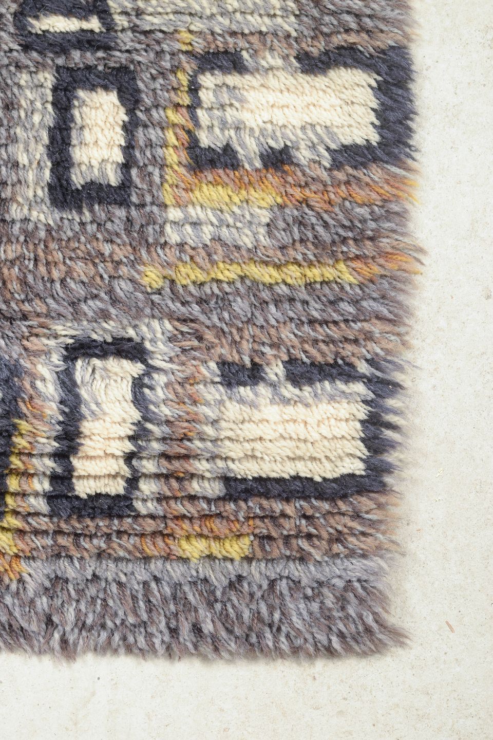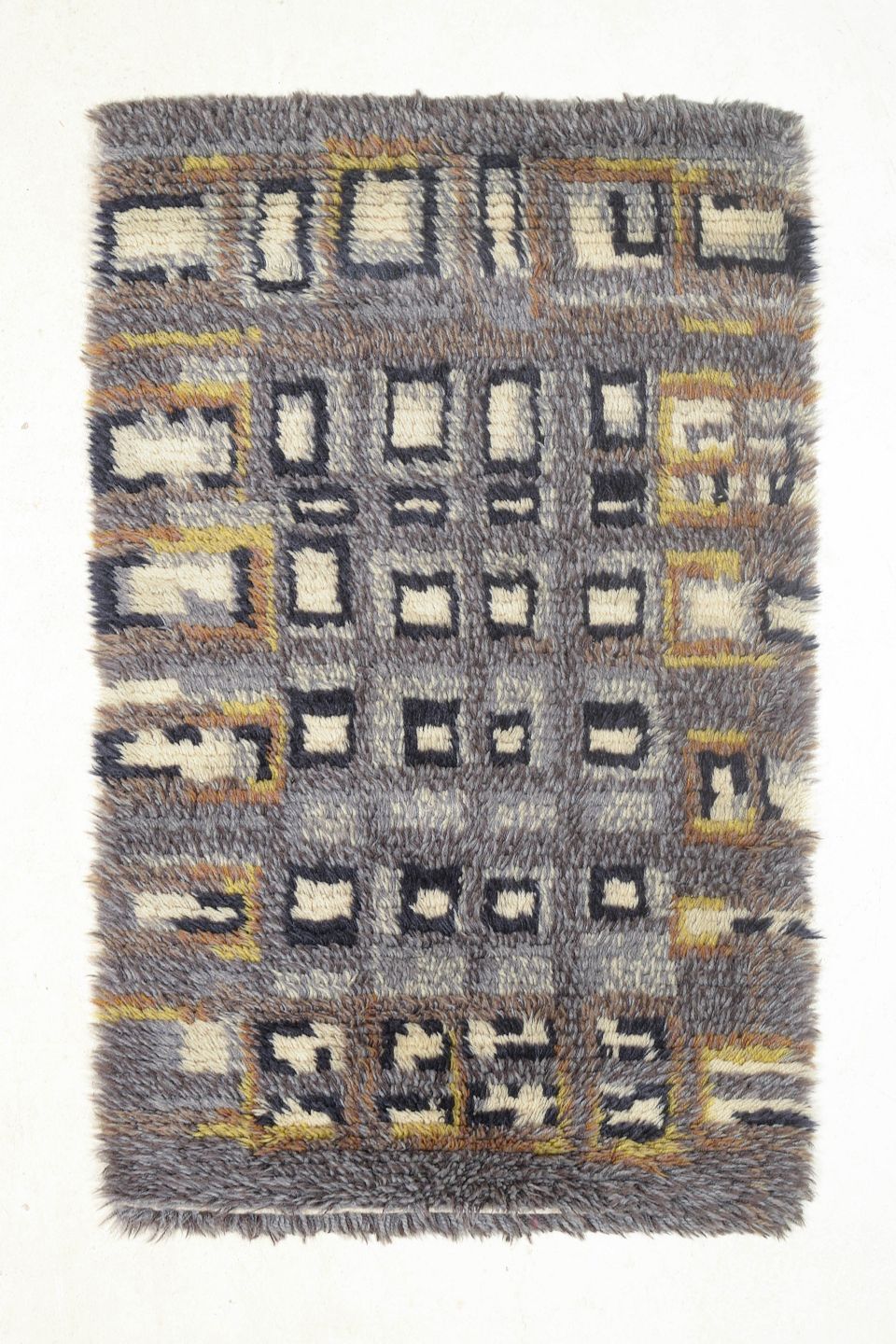 Hand-knotted rya carpet in wool with a geometric pattern in shades of grey, cream, yellow, and black. A graphic and balanced design typical of Scandinavian textile art from the period, translating modernist principles into decorative, handcrafted textiles.