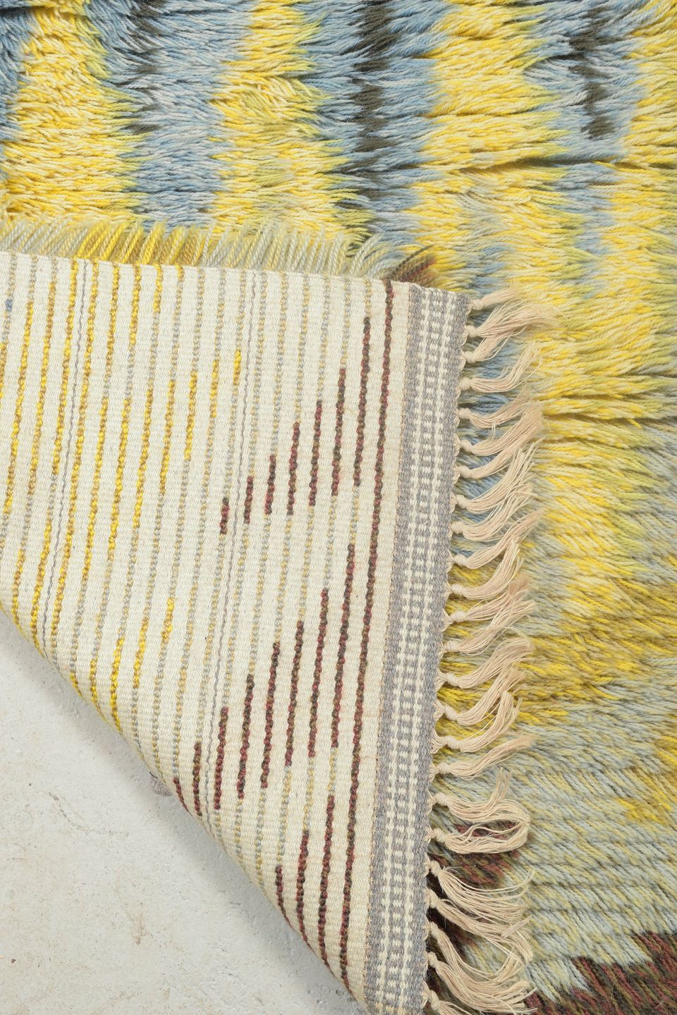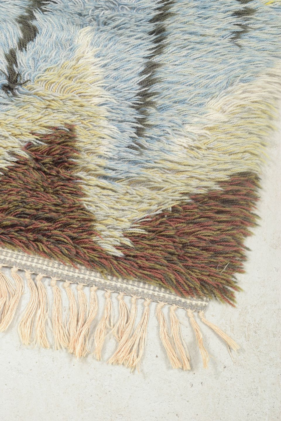 Hand-knotted rya carpet in wool with a zigzag-inspired pattern in shades of yellow, blue, brown, and grey. A distinctive design from the period, using strong contrasts and geometric forms to create vibrancy and movement within the Scandinavian textile tradition.