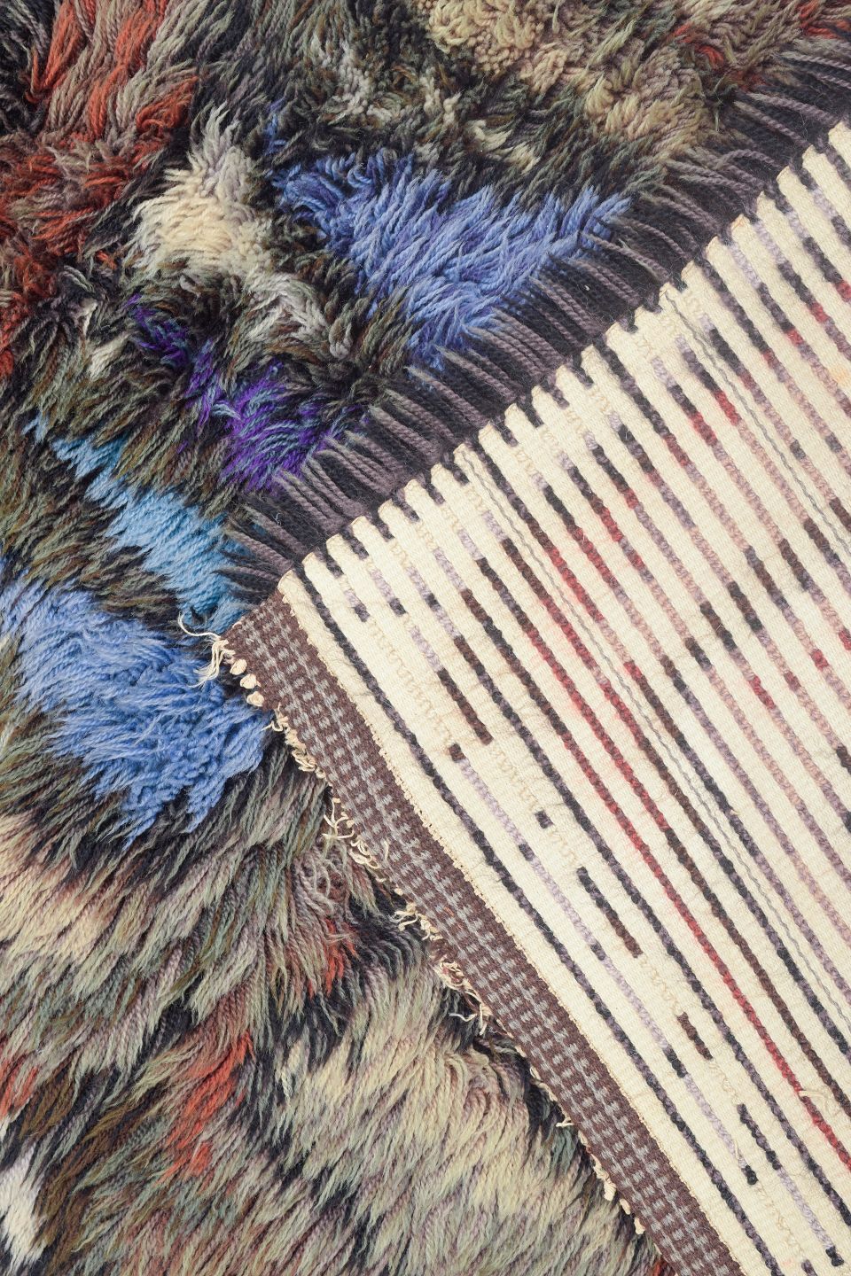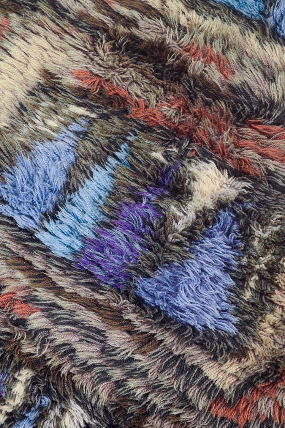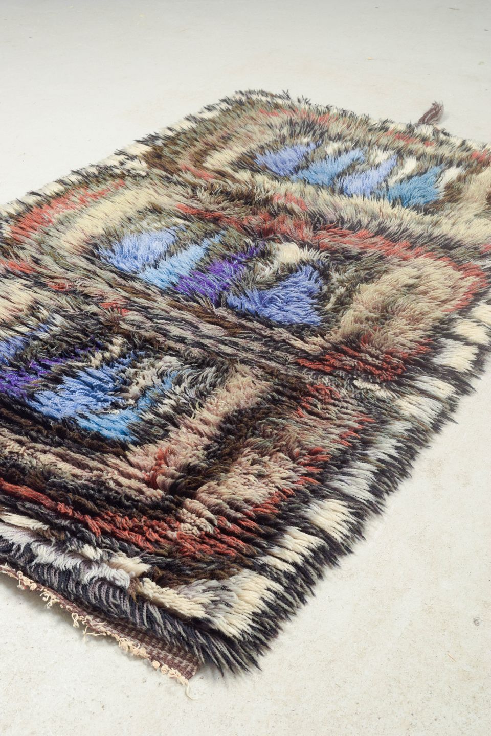 Hand-knotted rya wall hanging in wool with a geometric pattern in shades of blue, purple, beige, and brown. Featuring a hanging loop, this piece exemplifies the Scandinavian textile style of the period, when rya weaving evolved into a more decorative and artistic expression.