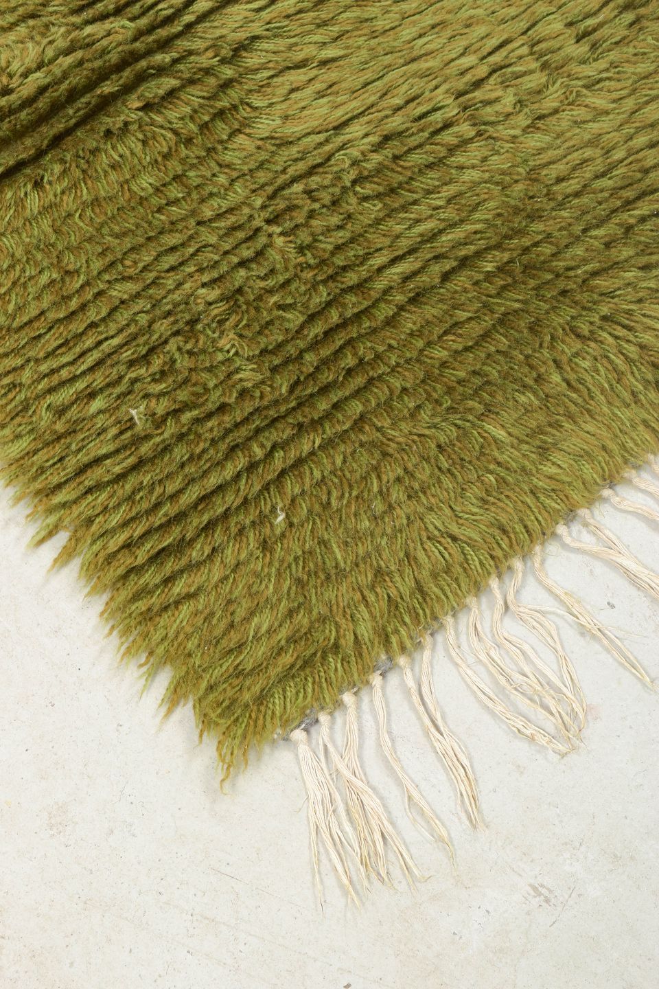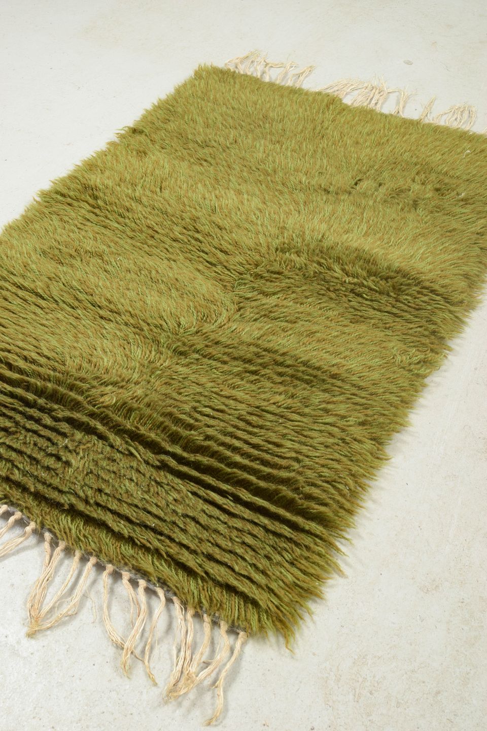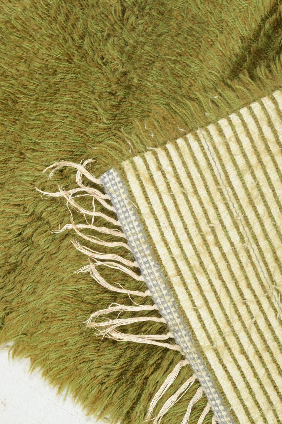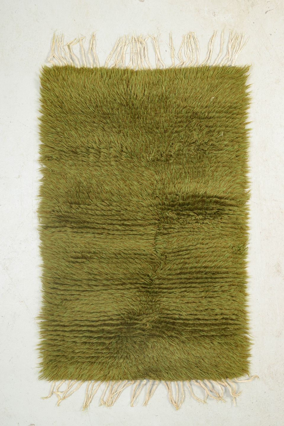 Hand-knotted rya carpet in pure wool in an olive-green tone with a uniform, textural surface. A simple and elegant example of Scandinavian textile design from the period, highlighting the natural qualities of the material through colour and texture.