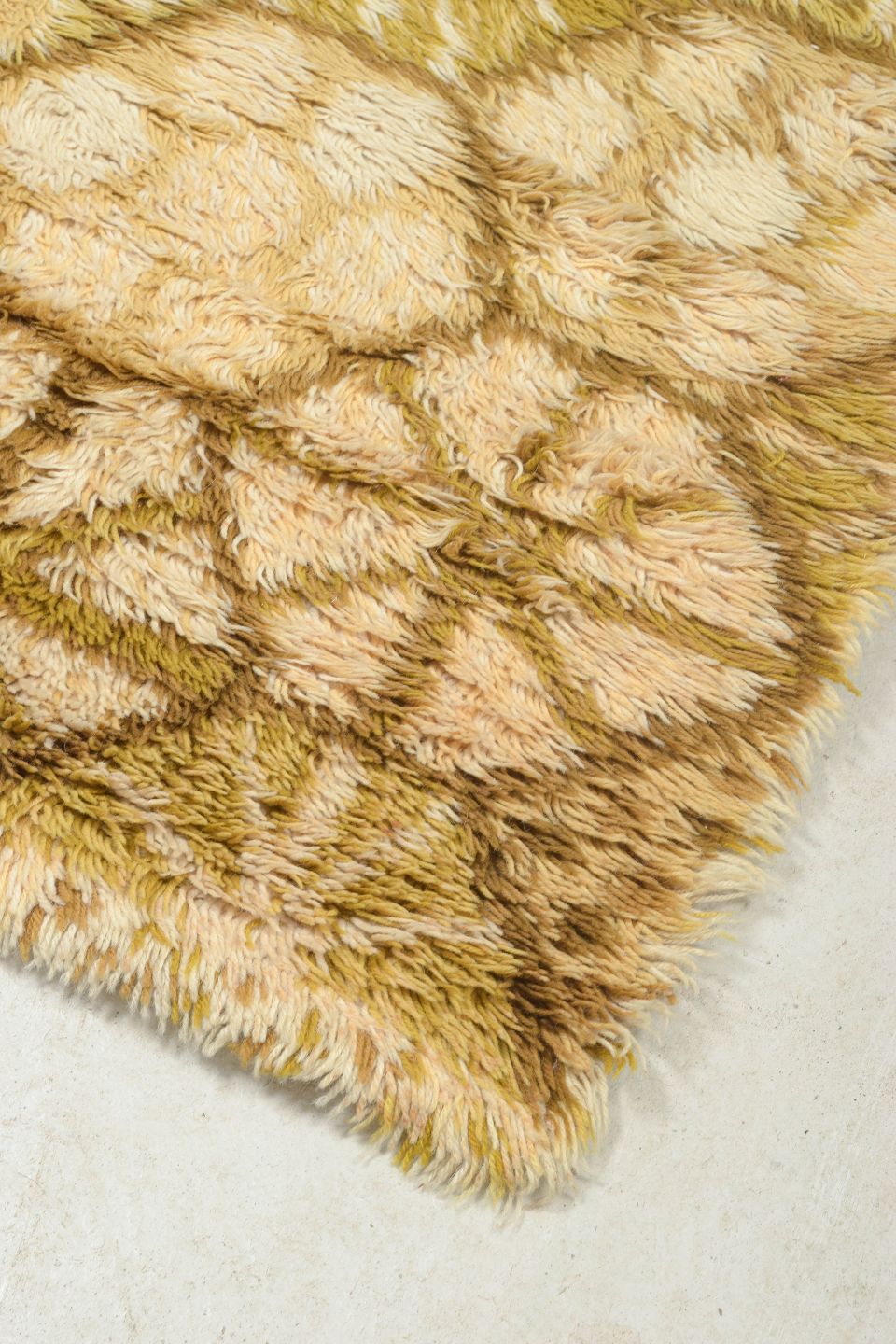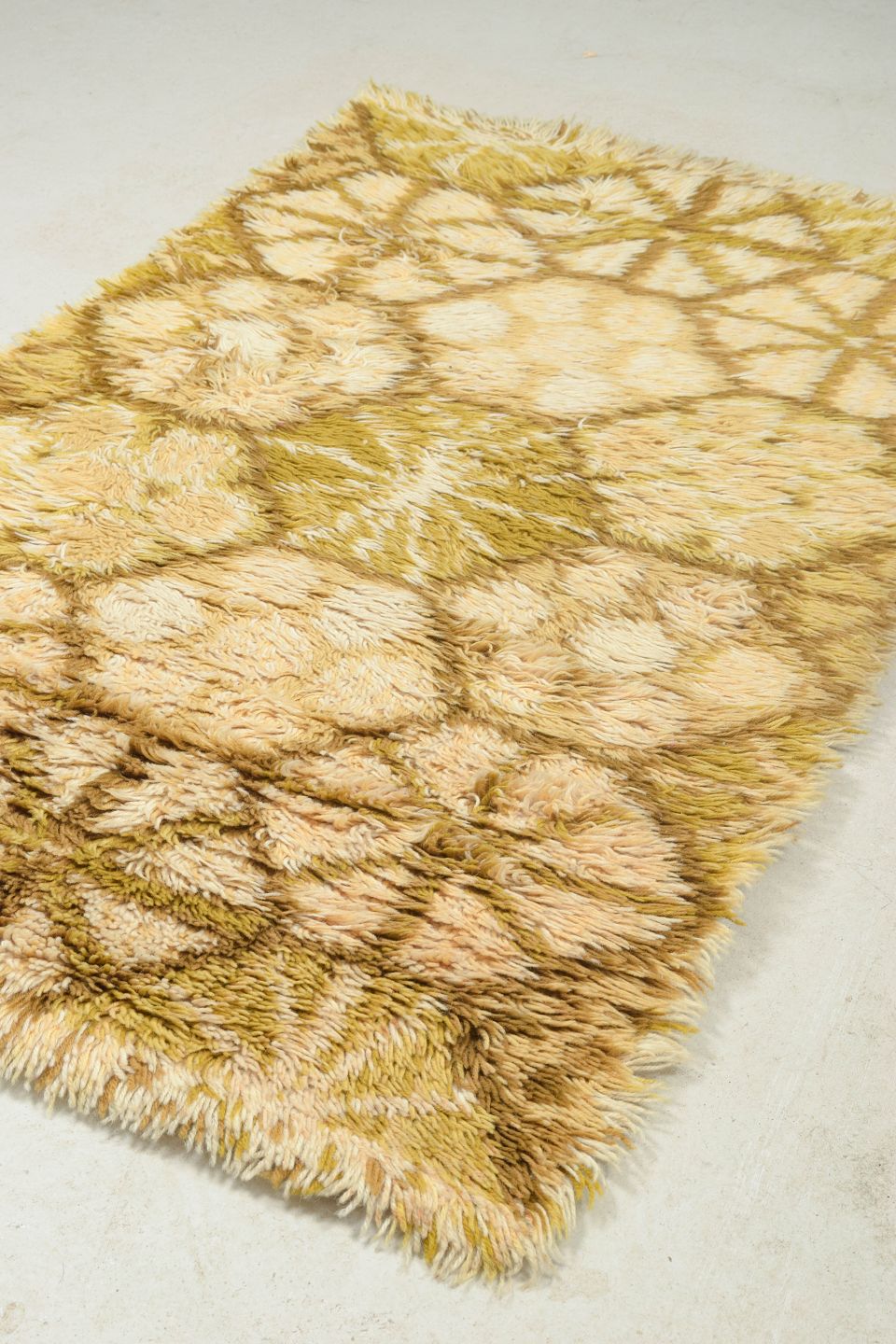 Hand-knotted rya carpet in wool designed by Marianne Richter, featuring a geometric pattern in golden, beige, and olive tones. A refined example of Swedish textile art, blending modernist forms with warm, natural colours.