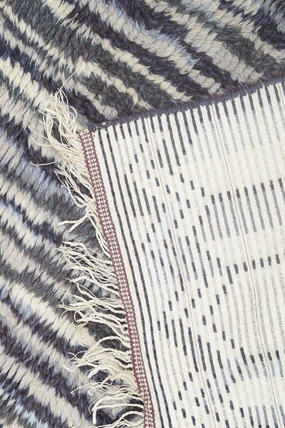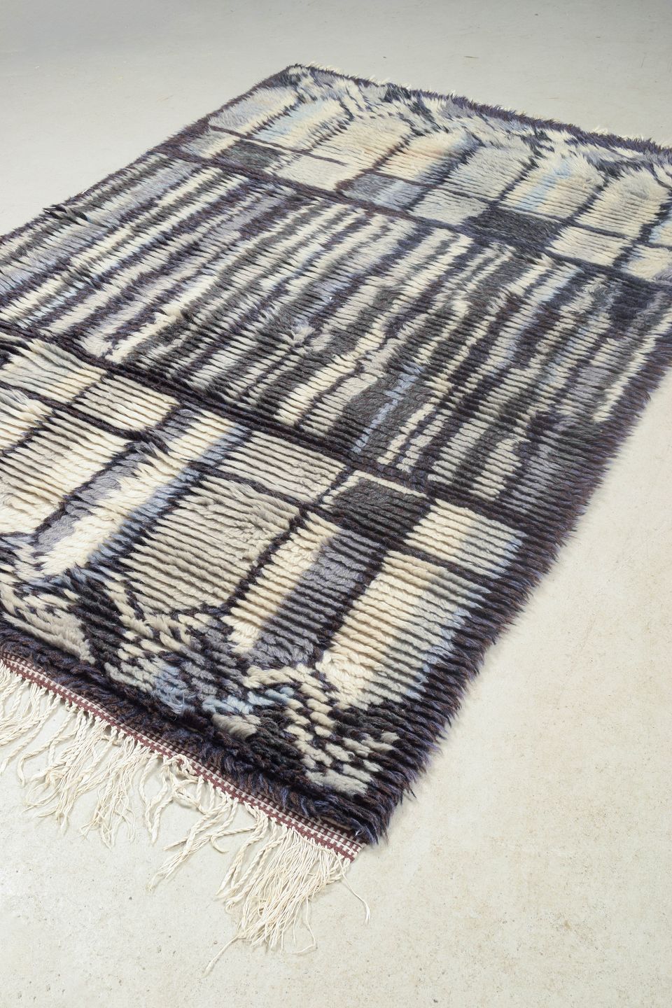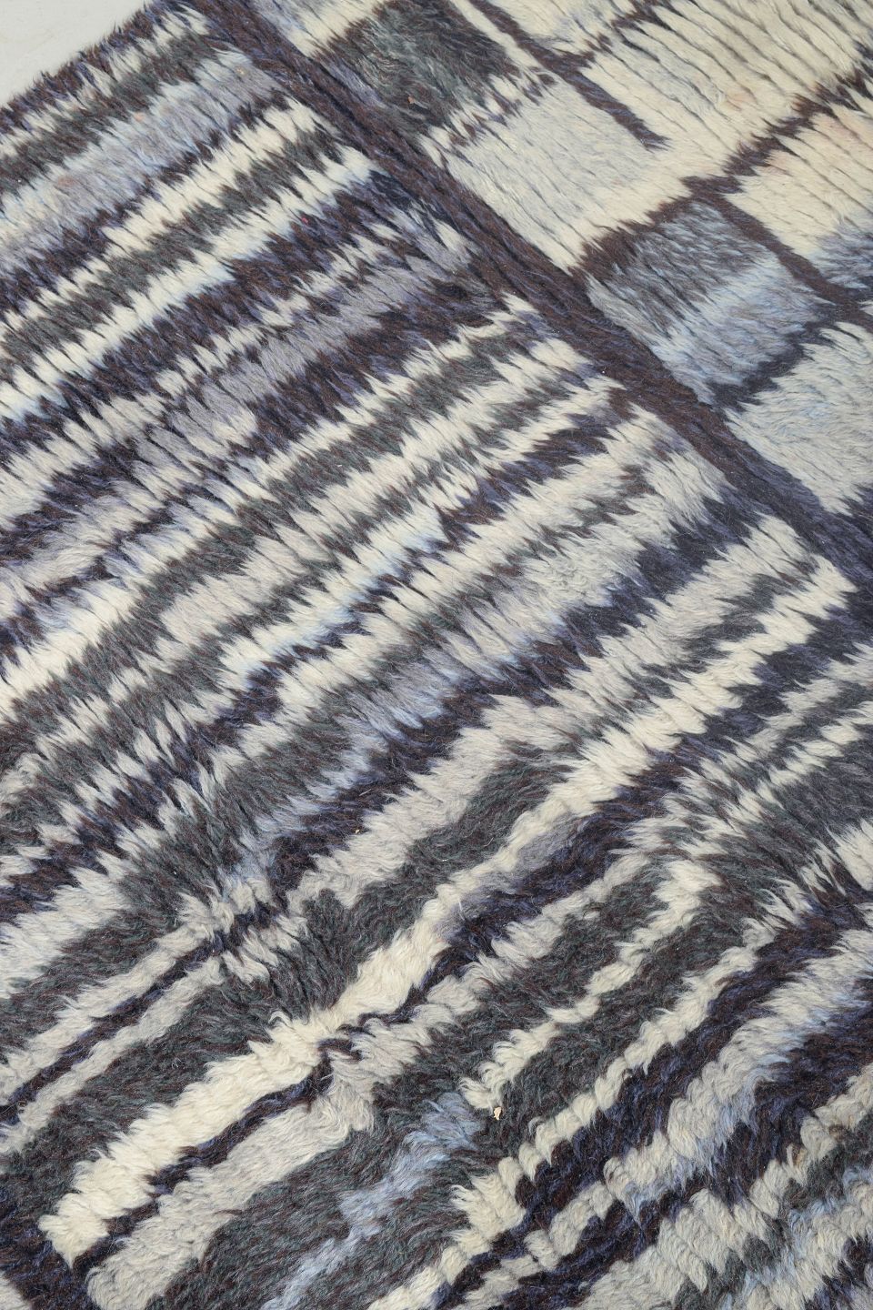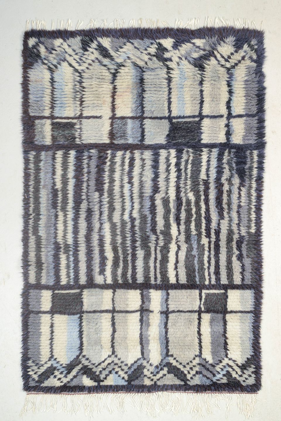 Hand-knotted rya carpet in wool with a graphic pattern in shades of blue, grey, and cream. The rhythmic composition and geometric design are typical of Scandinavian textile art from the period, where traditional craftsmanship was fused with modernist aesthetics.