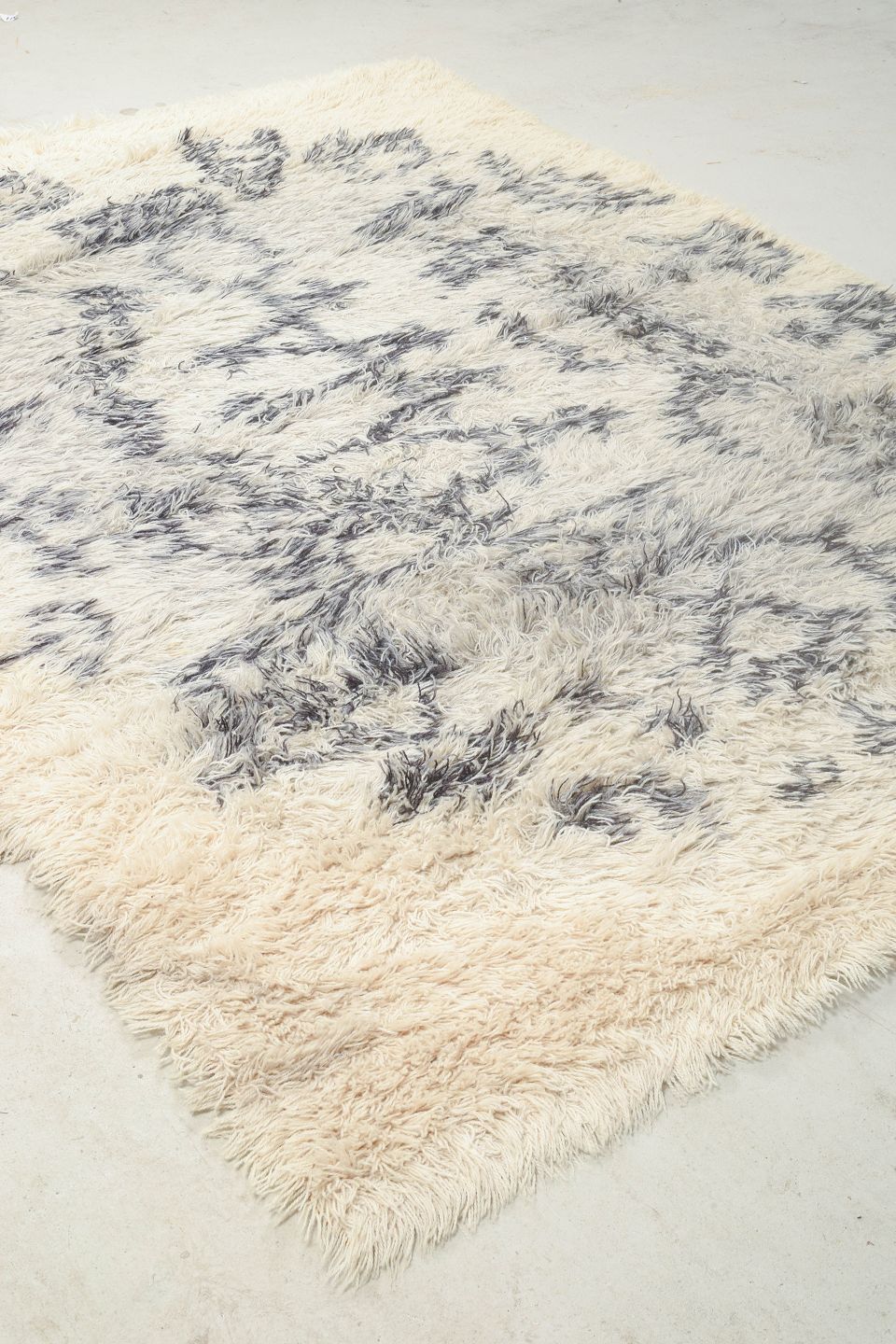 Large hand-knotted rya carpet in wool with an abstract pattern in black and grey on a light background. “Vikingstad” design by Clara Salander, a characteristic example of Swedish textile art from the period, combining craftsmanship, texture, and modernist form.