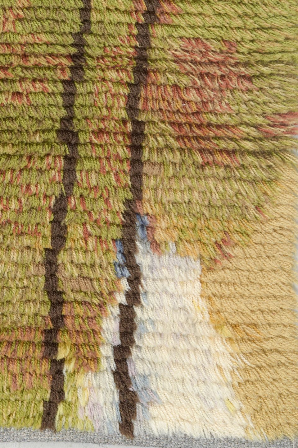 Hand-knotted rya carpet in pure wool with an abstract pattern in shades of green, yellow, brown, and cream. A decorative textile with distinctive texture and colour play, characteristic of Scandinavian design from the period.
