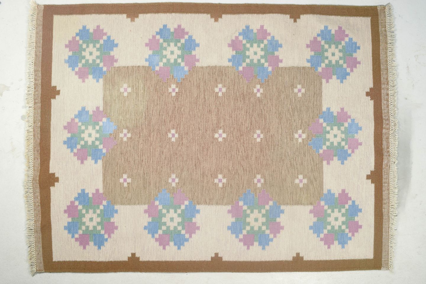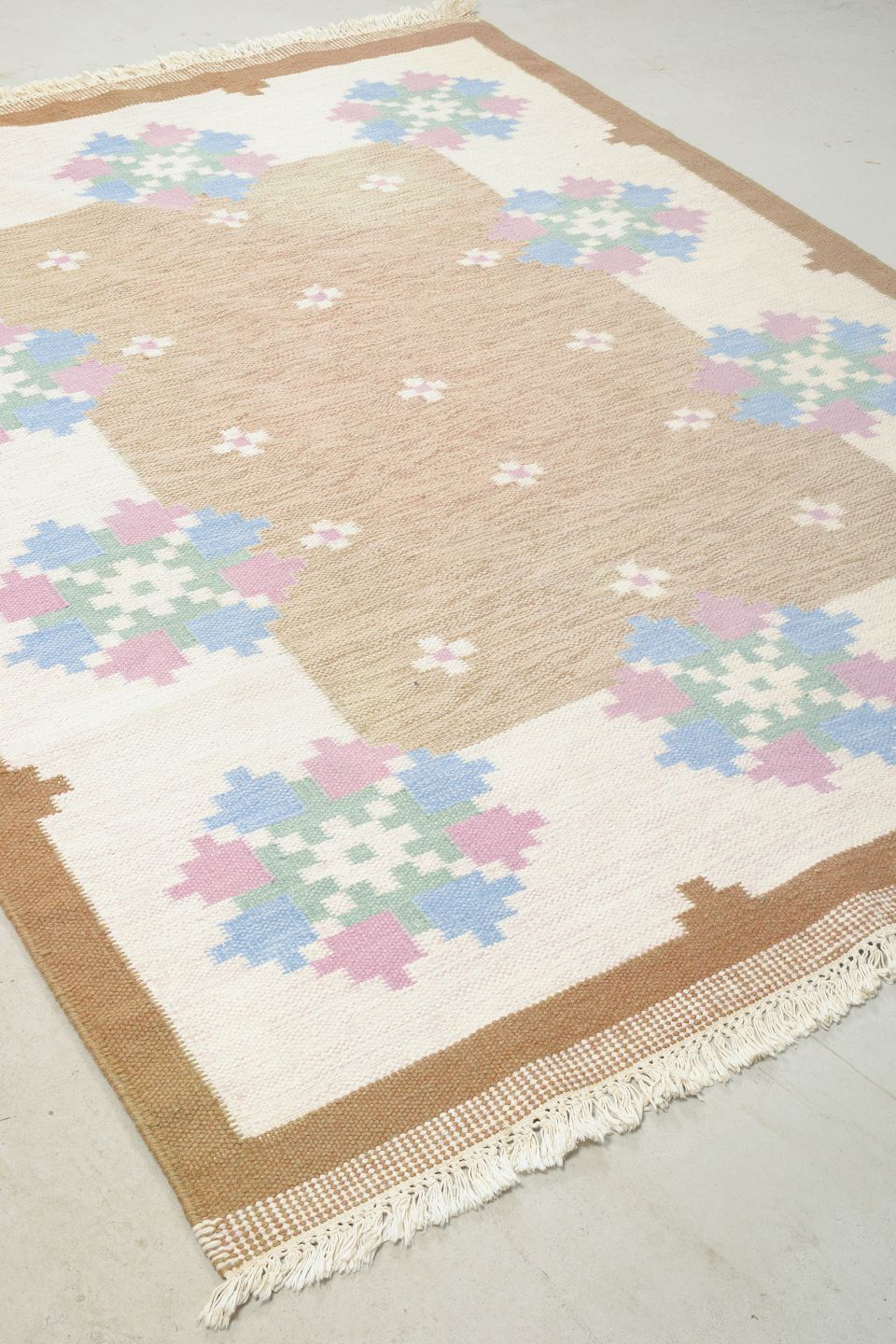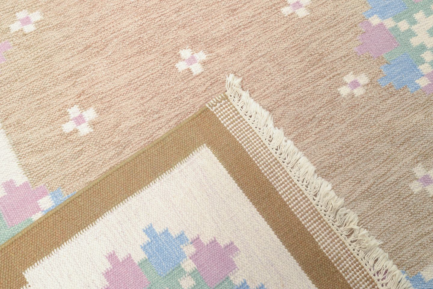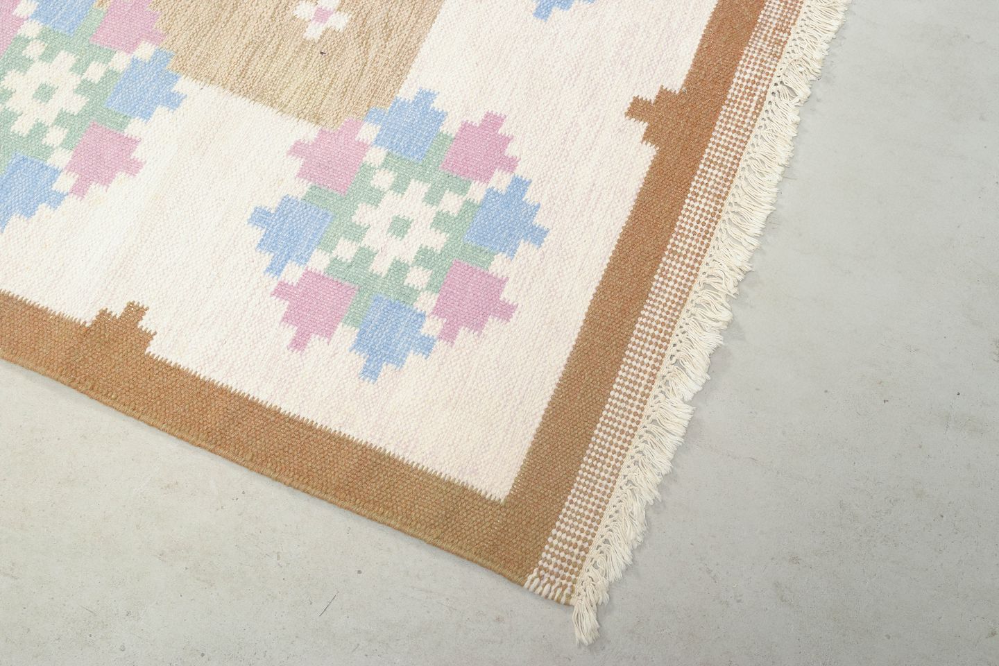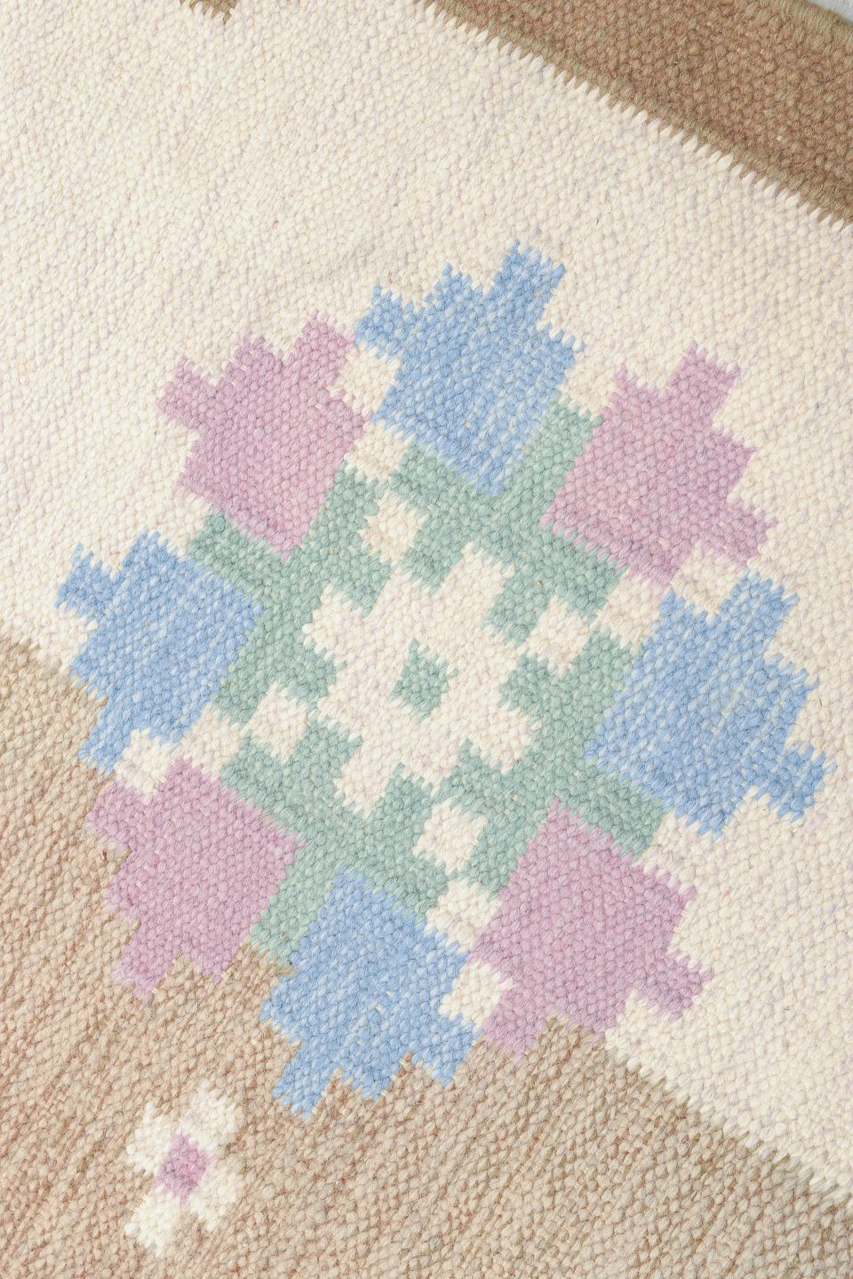 Handwoven rug in classic Swedish rölakan technique with a geometric pattern in muted tones of beige, blue, green, and pink. A fine example of Swedish textile artistry from the 1960s, combining craftsmanship with modern design sensibility.