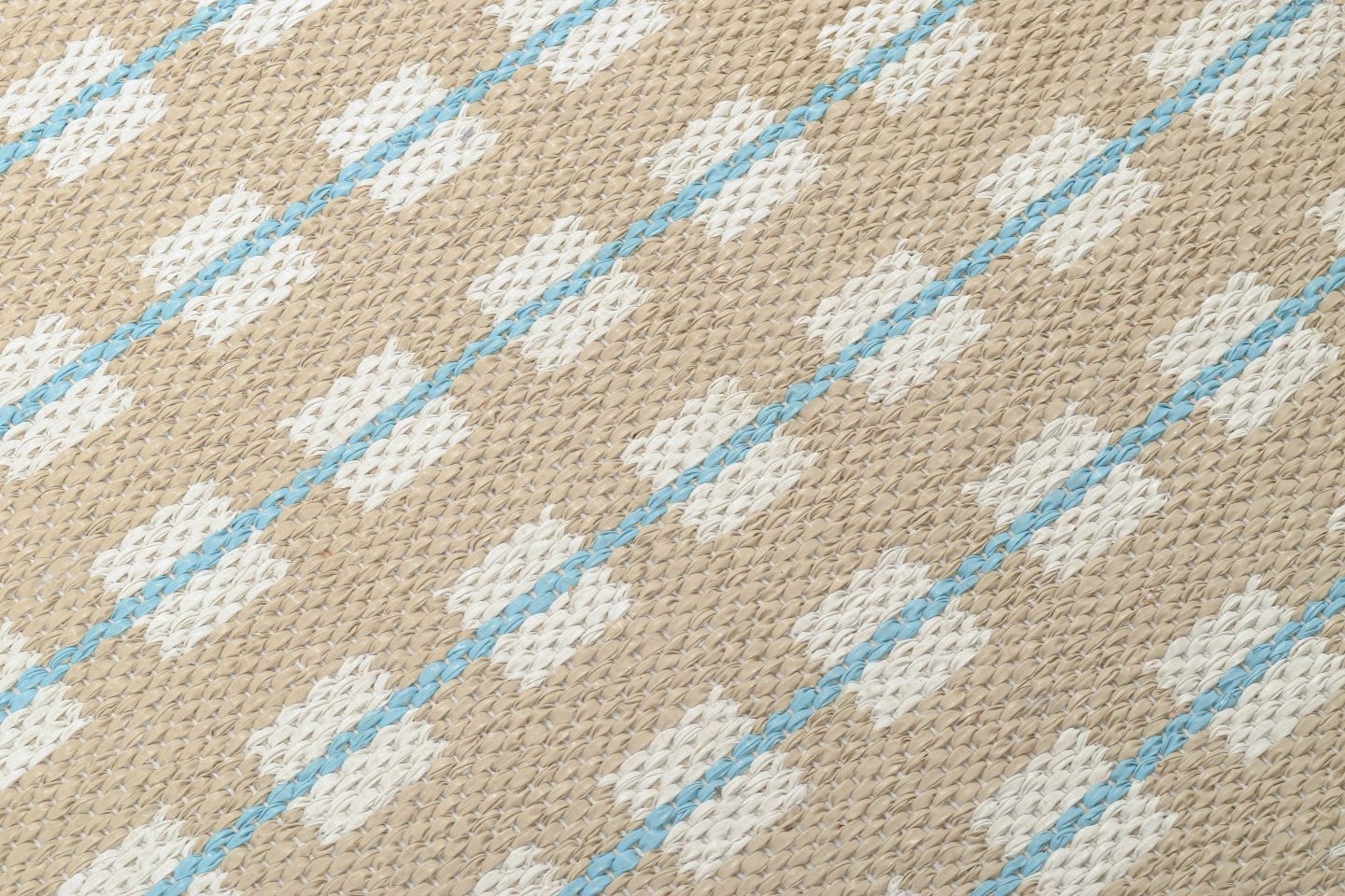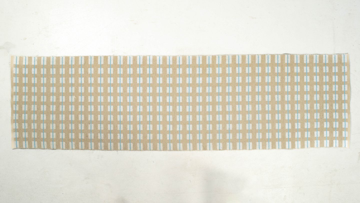 Rectangular table runner in woven plastic with a graphic pattern in beige and light blue tones, typical of the functional and colourful interior design of the 1970s.
