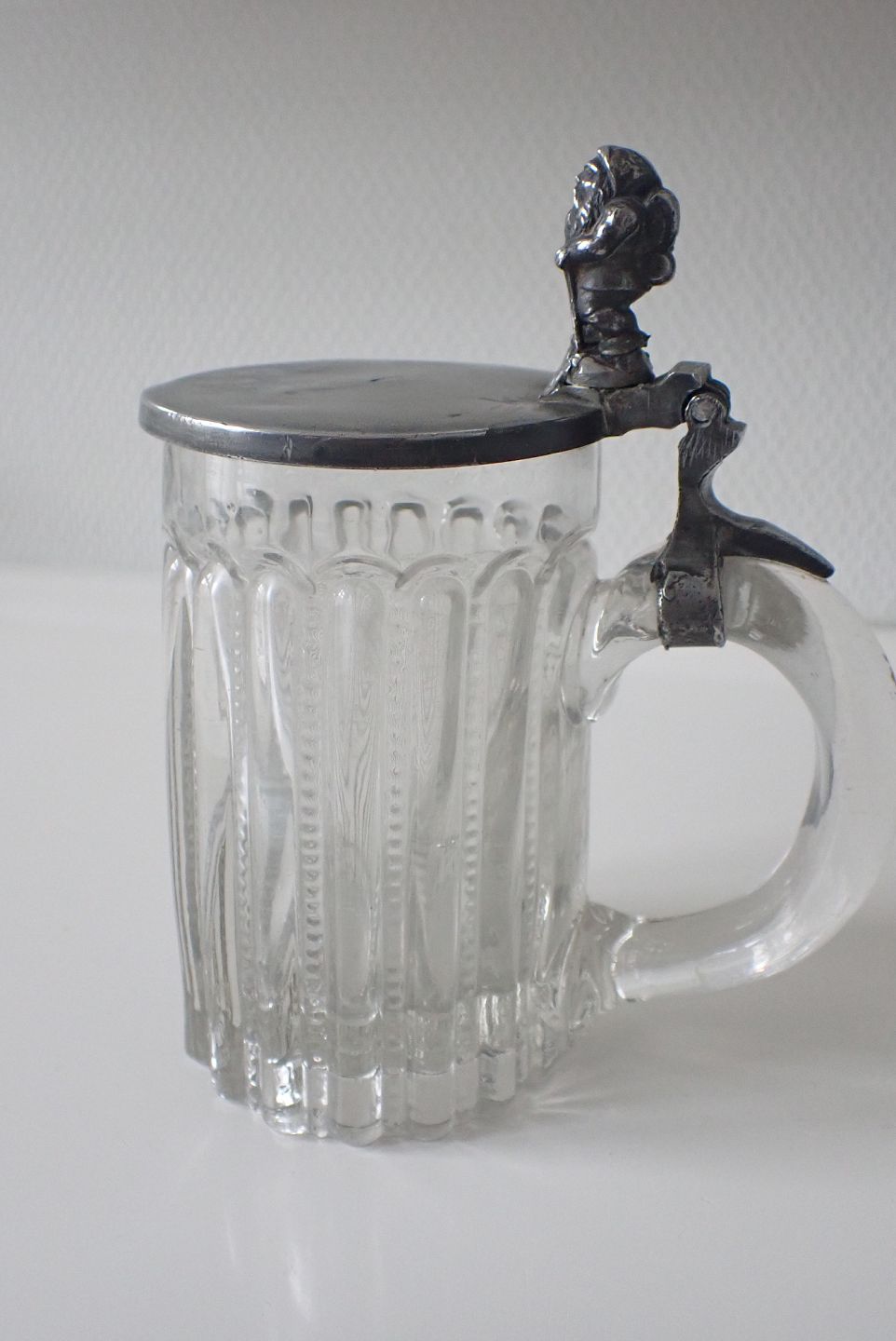 Text available in Danish: Nisse ølkrus i glas med låg af tin.