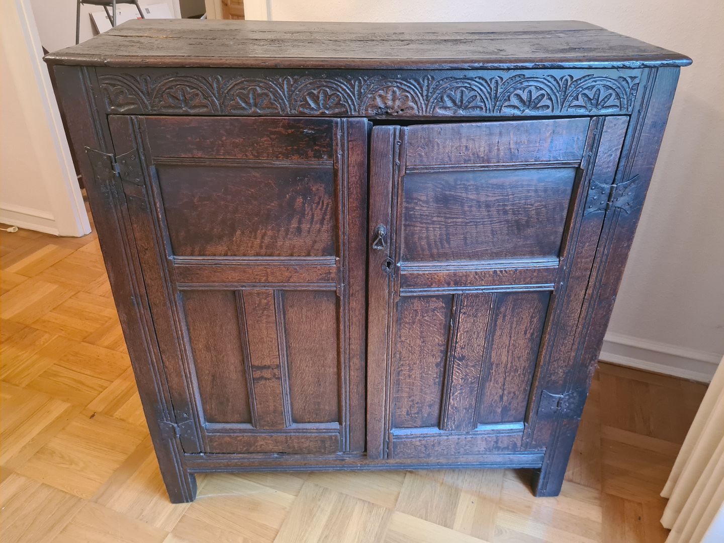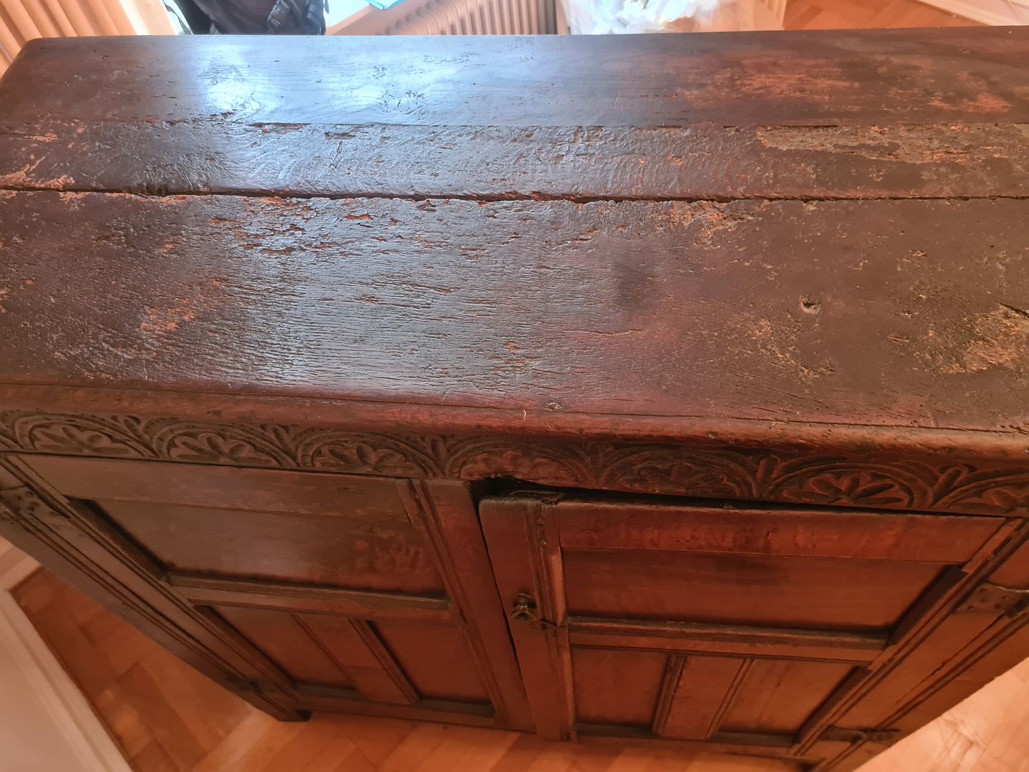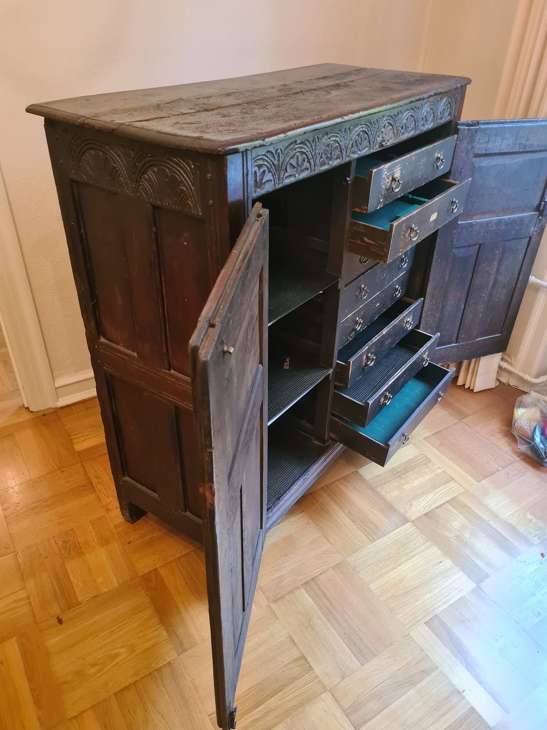 Text available in Danish: Antikt dækketøjsskab fra starten af 1800 tallet i eg. Fremstår godt og solidt med aldersrelaterede brugsspor på toppen.(billede) Umiddelbart uden nøgle.