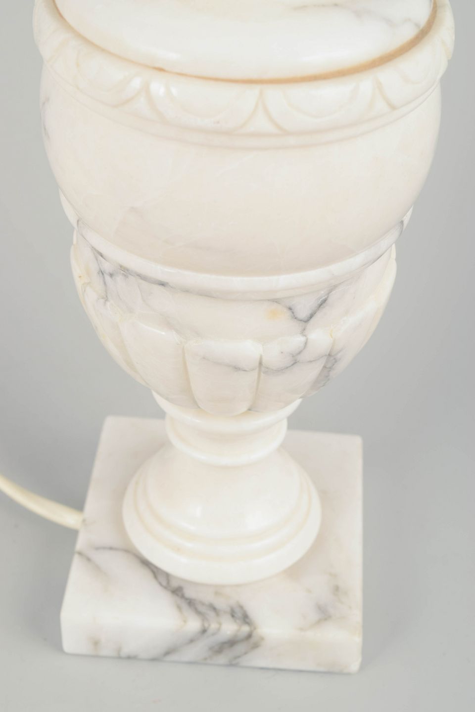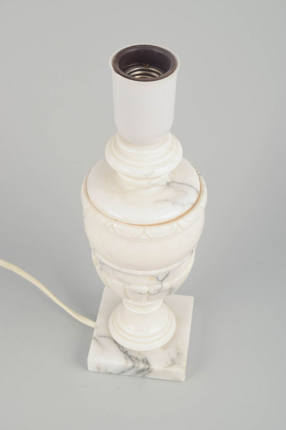 Classical urn-shaped table lamp in alabaster with a square base and decorative gilt ring detail. An elegant example of Italian craftsmanship, combining classical proportions with the natural translucency of alabaster.