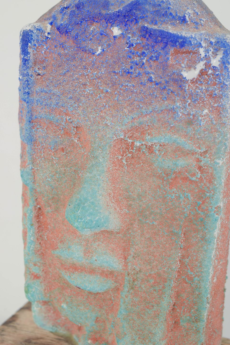 Unique handmade glass sculpture depicting a stylised face, executed in solid glass with an iridescent surface in blue, turquoise, and pink tones. Mounted on a wooden base. A characteristic example of Ekegren’s experimental approach to colour and texture in glass during the 1980s.