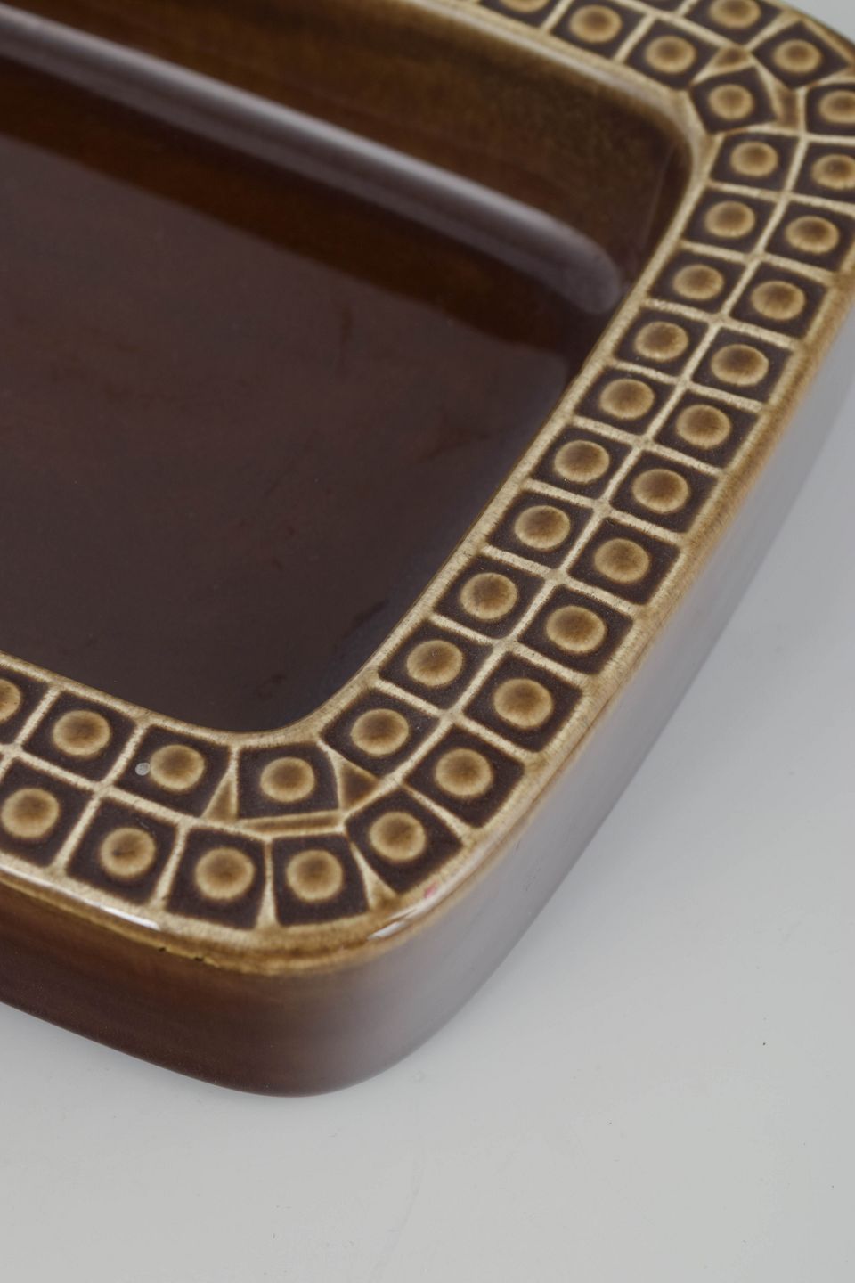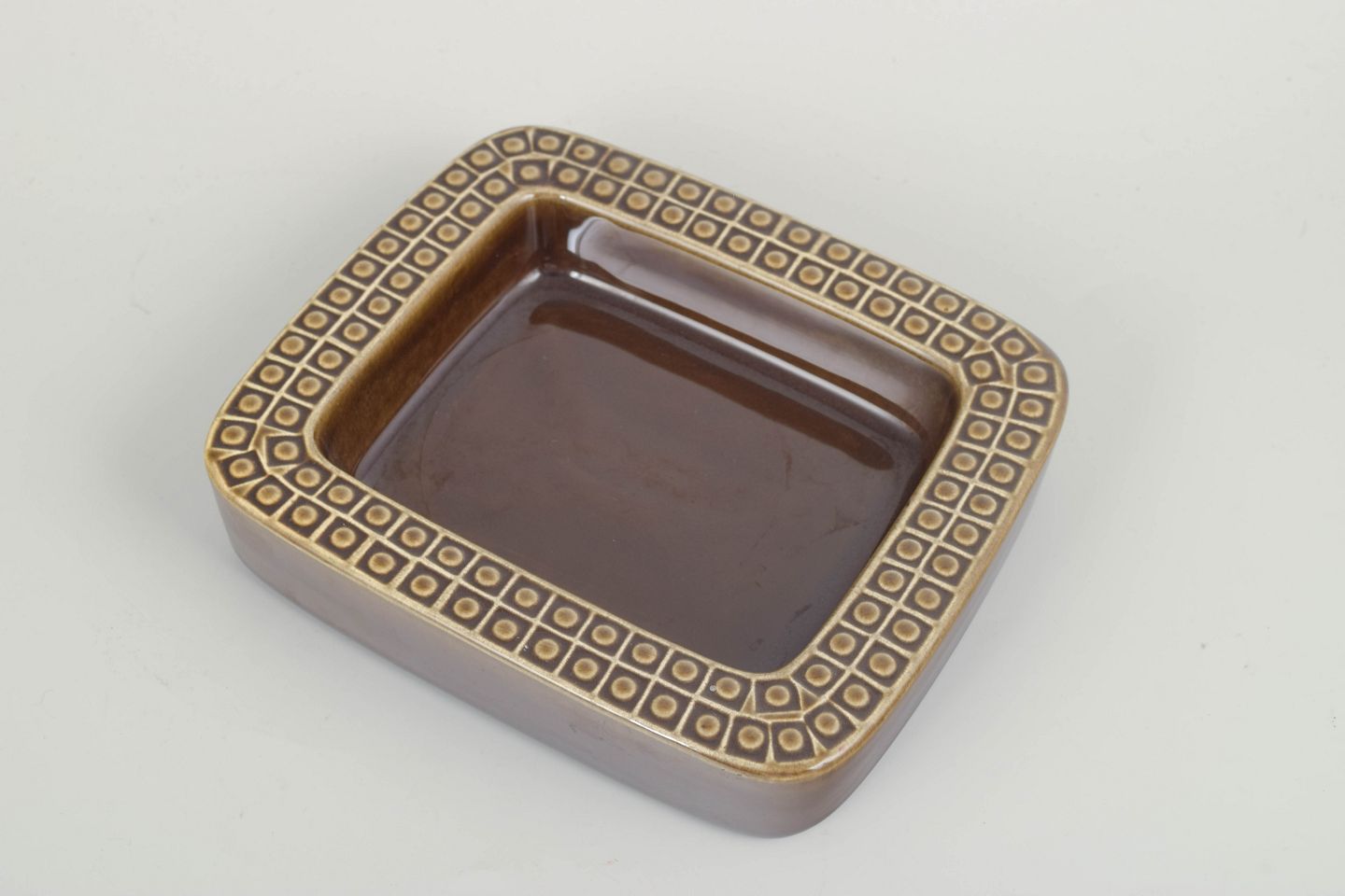 Ceramic dish in brown glaze with the characteristic geometric relief pattern along the rim. The Kub series combines functional design with modernist elegance, and this piece exemplifies Nylund’s refined sense of proportion and material.