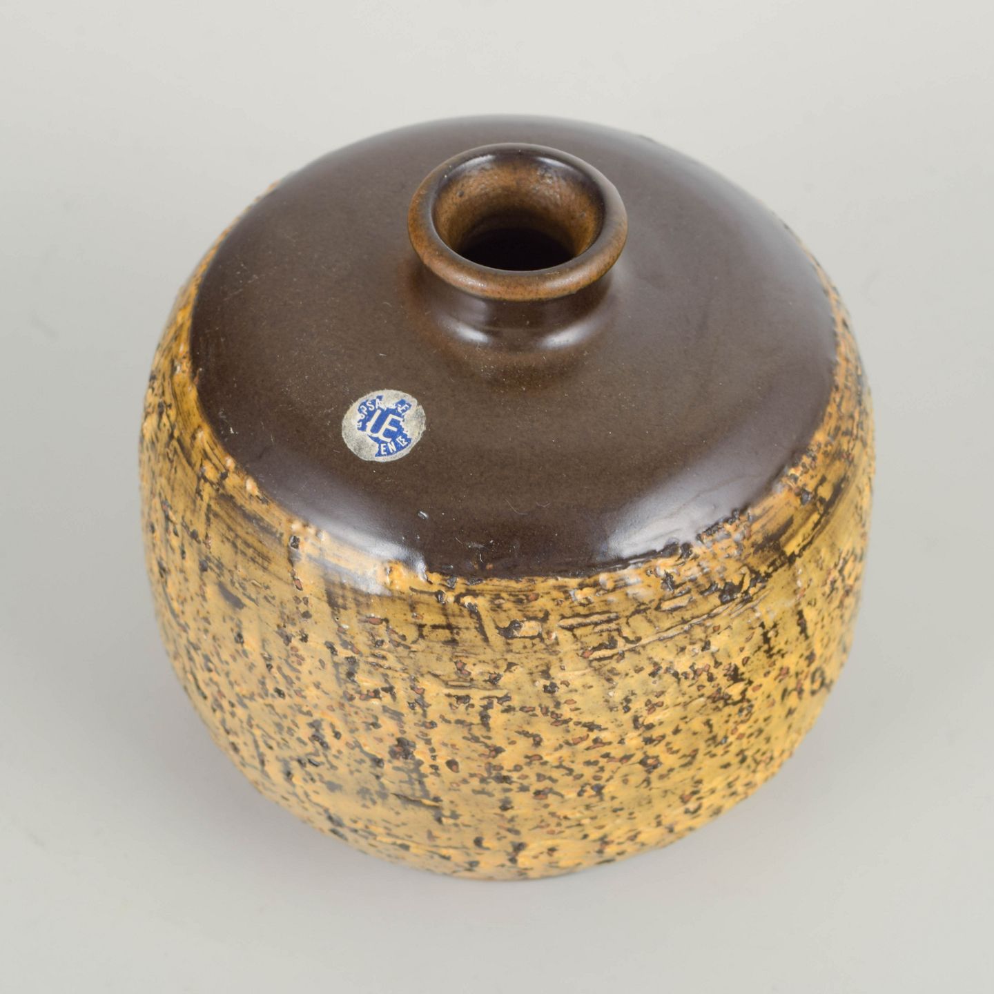 Hand-thrown stoneware vase with a cylindrical body and small neck, decorated in a vivid yellow-brown glaze with dark textured markings giving the surface a striking rustic character. A fine example of Andersson’s craftsmanship and the experimental glazing aesthetics of Upsala Ekeby during the 1960s.