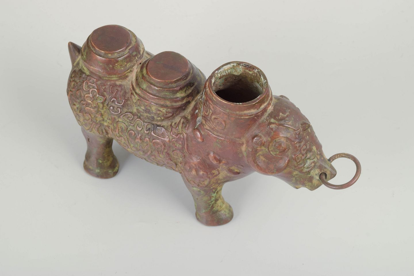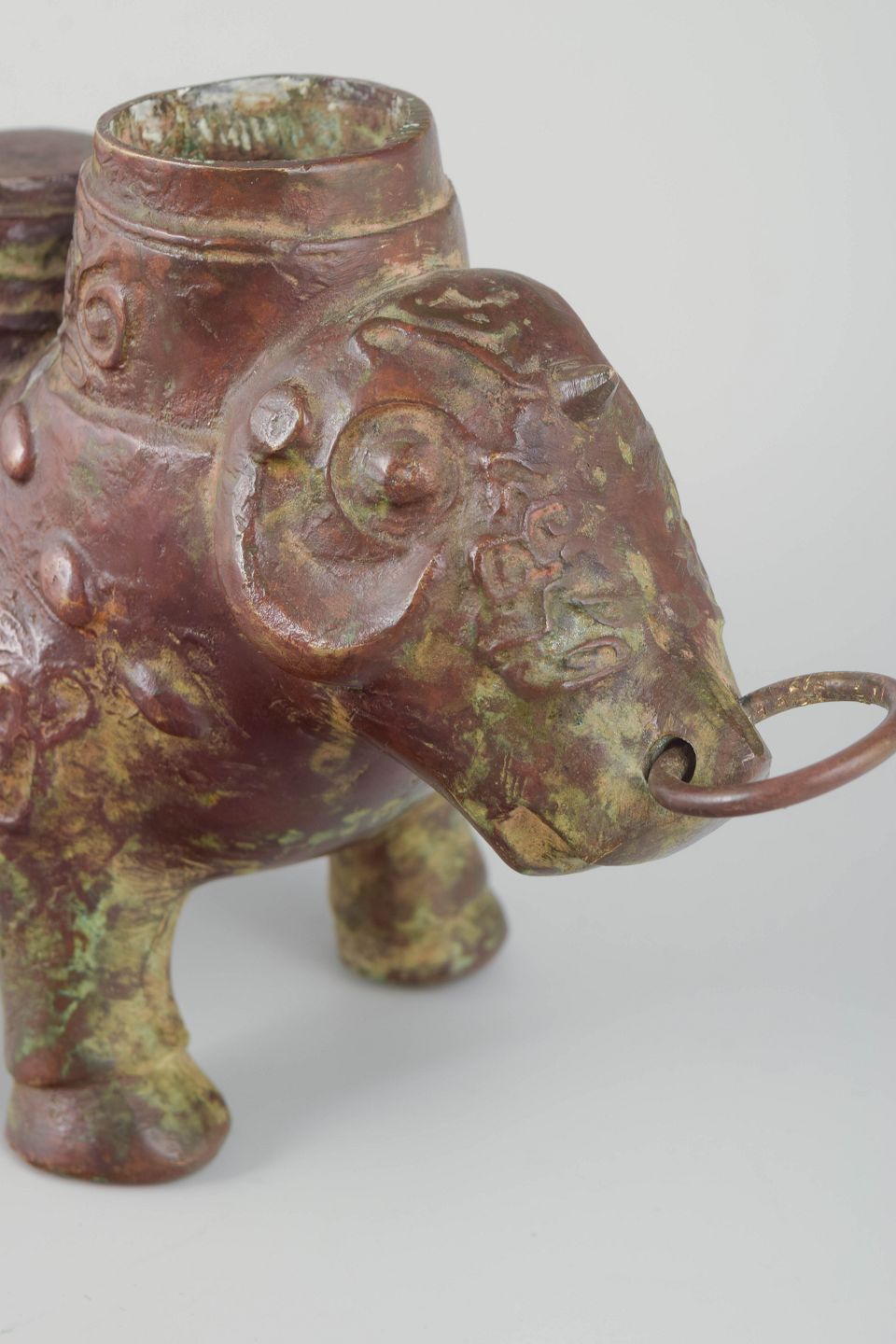 Bronze sculpture shaped as an animal, richly ornamented with intricate surface decorations and a fine patina in green and reddish tones. This type of “zun” was traditionally used for wine in ritual ceremonies in ancient China. A fine example of classical bronze artistry with a distinctive form and historical presence.