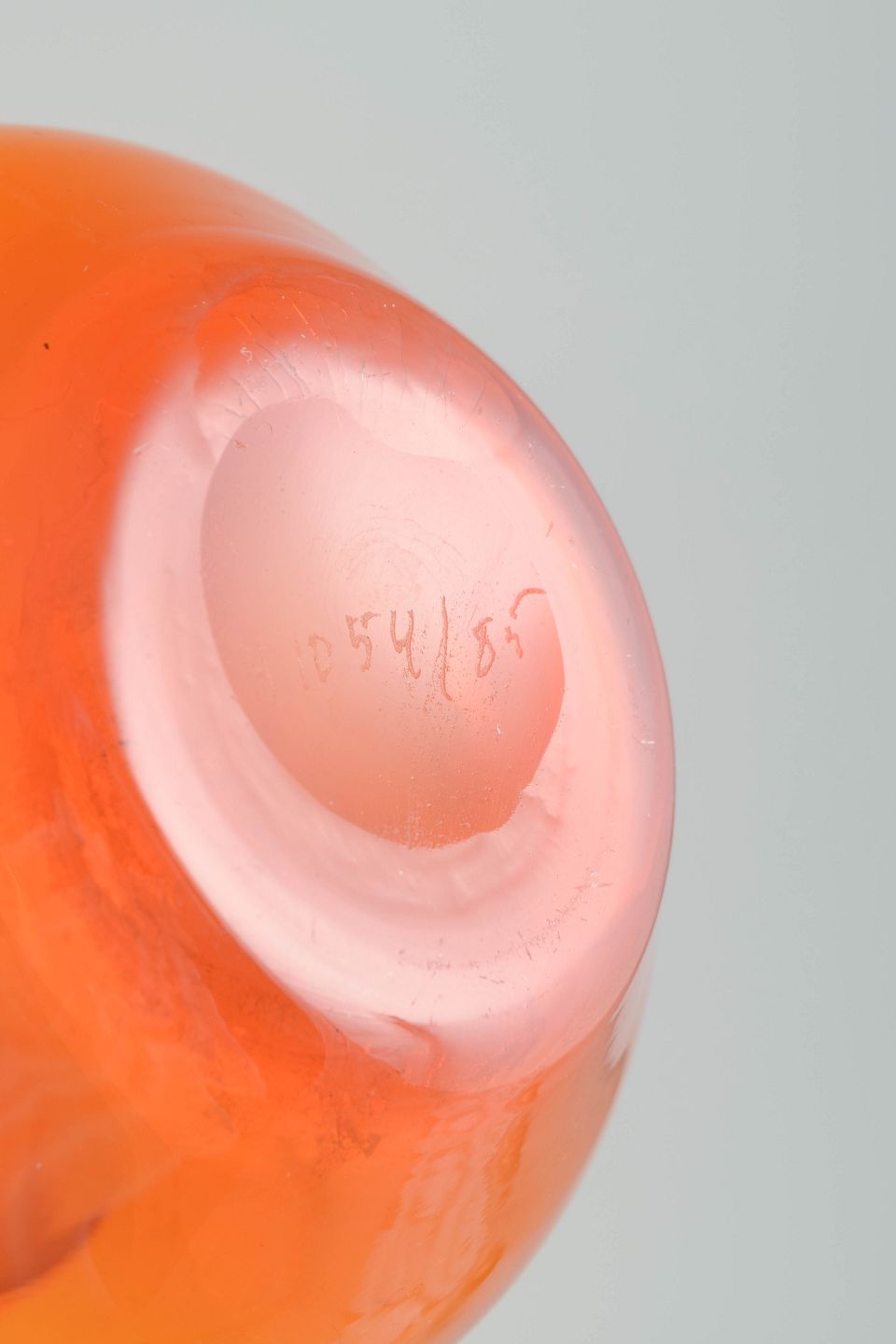 Two mouth-blown vases in vibrant orange glass with softly rounded forms and slightly flared necks. Classic Scandinavian glass design with expressive 1970s colour tones and fine craftsmanship.