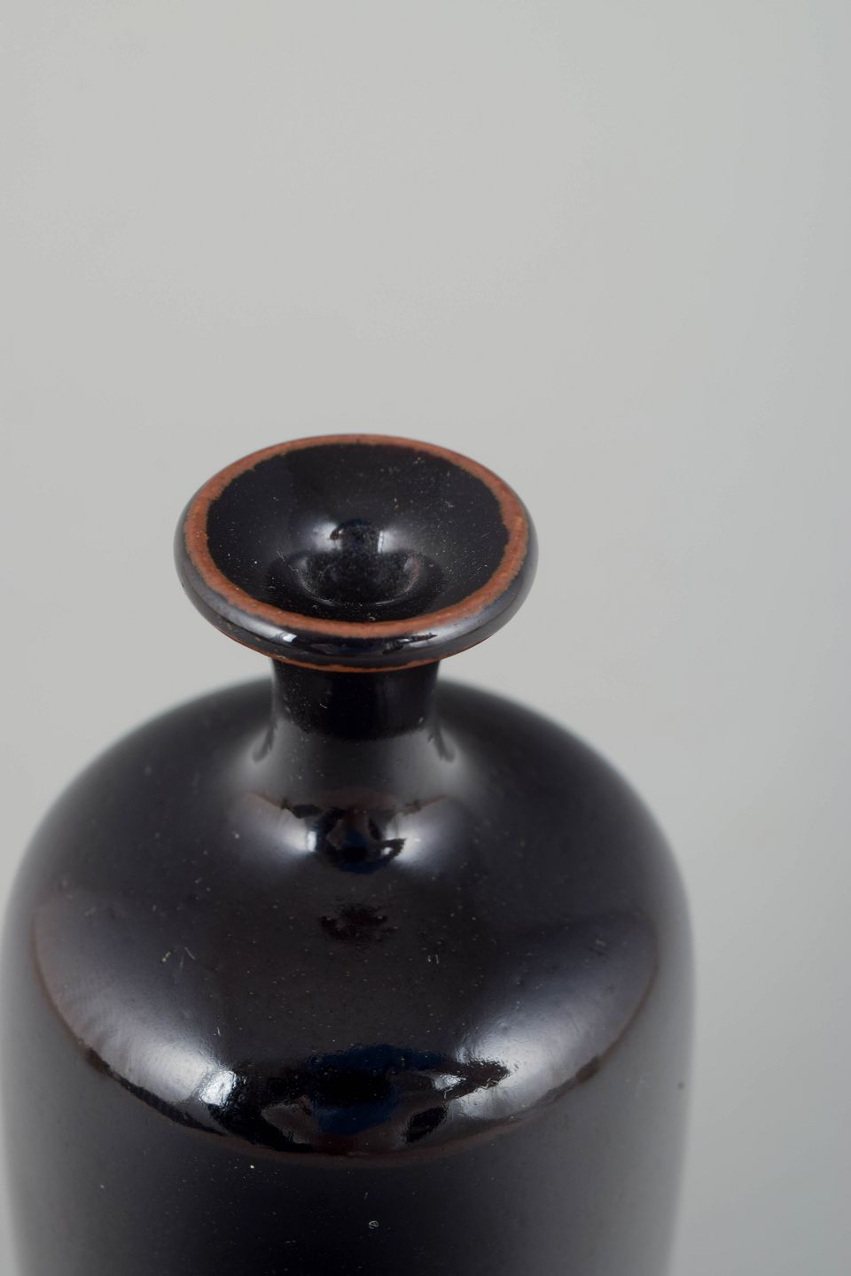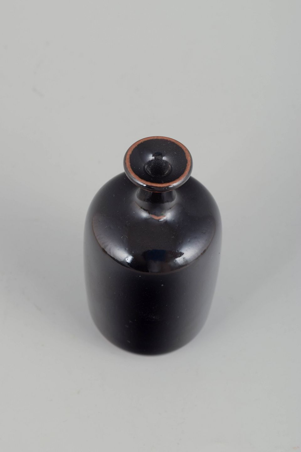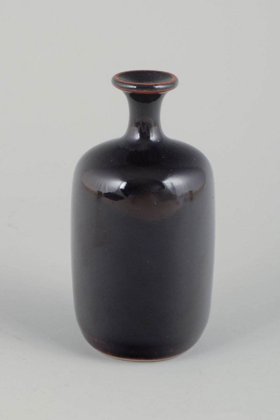 Unique hand-thrown miniature vase in stoneware with a dark glossy glaze in deep brown-black tones.
