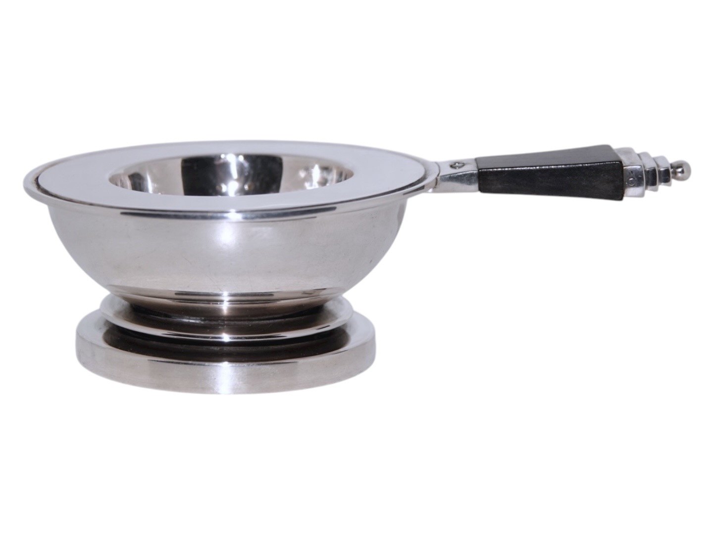 Georg Jensen sterling silver and ebony, Pyramid tea strainer on stand bowl.