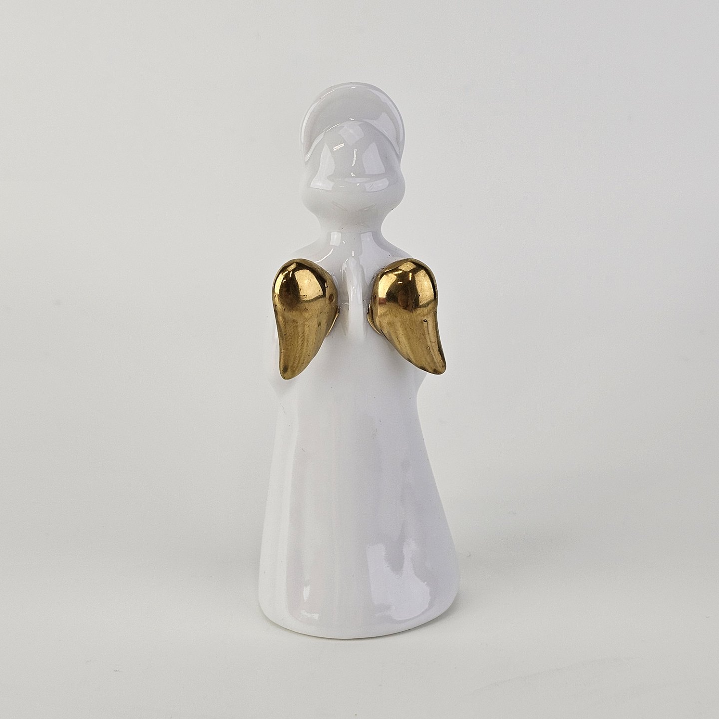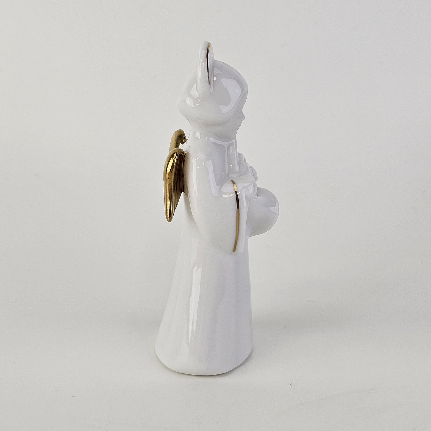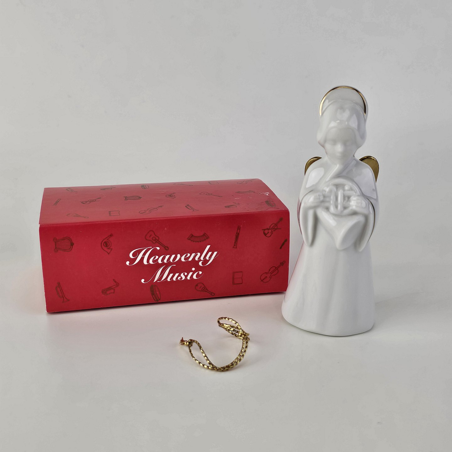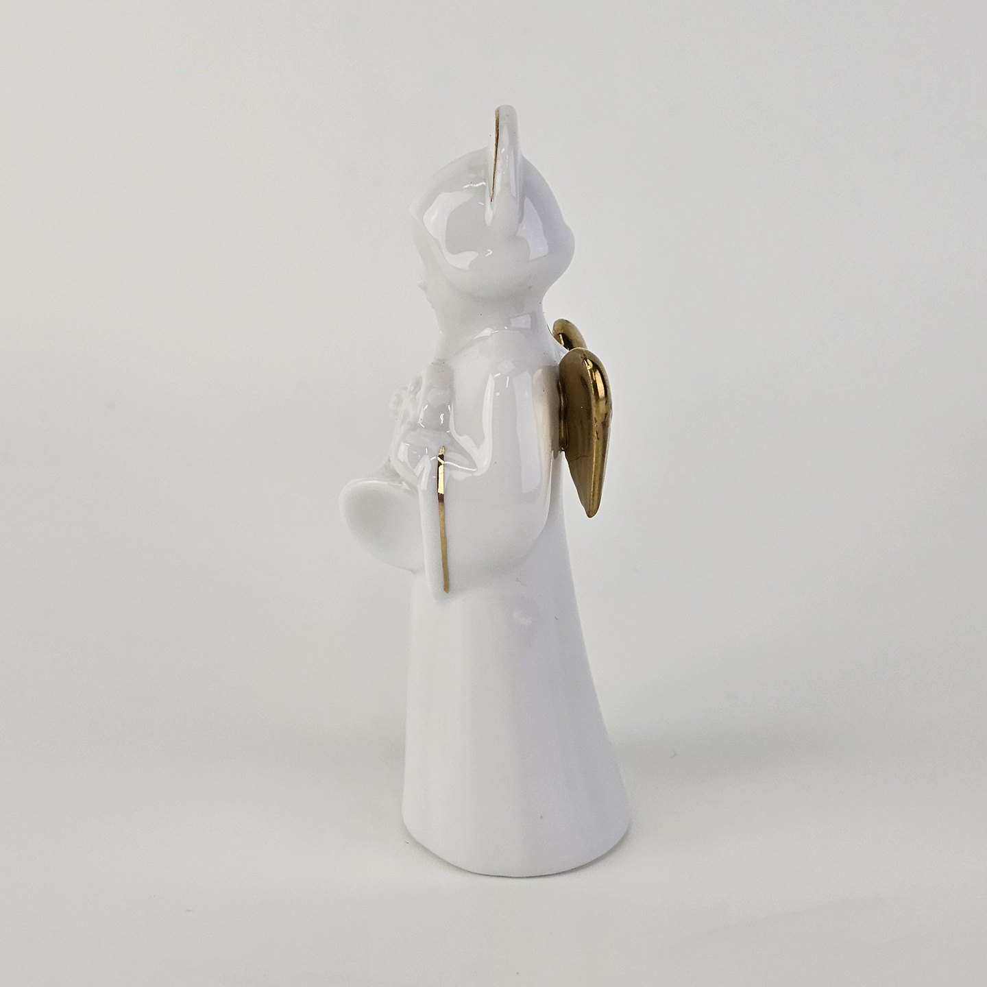 Text available in Danish: Figur med motiv af en engel som spiller på valdhorn. Figuren er i hvidt porcelæn med forgyldte vinger og detaljer i 24 karat guld.