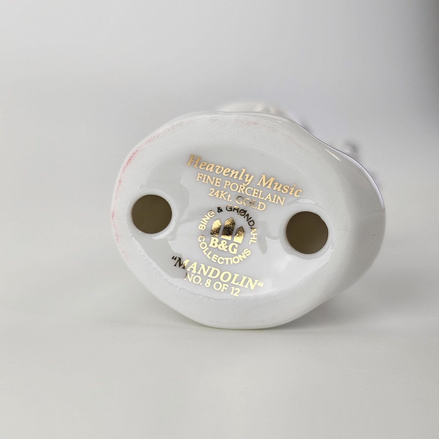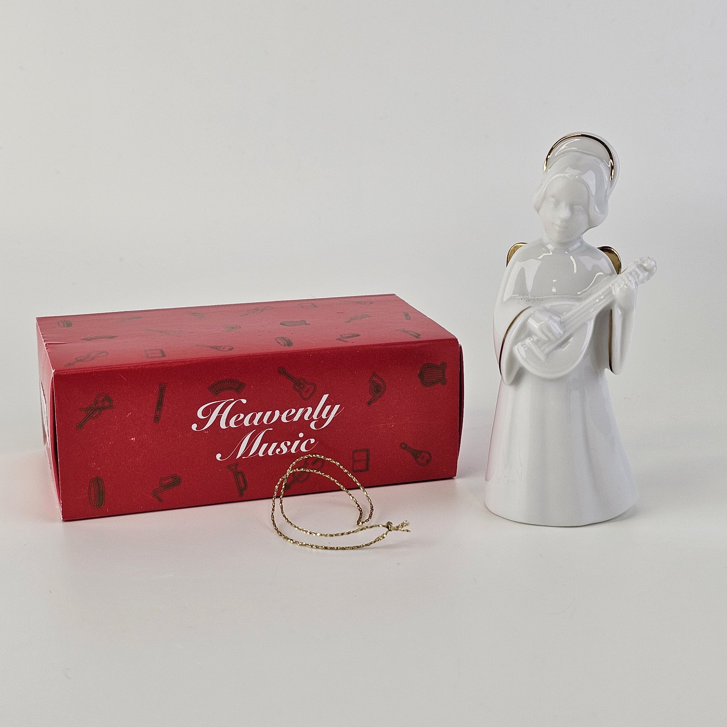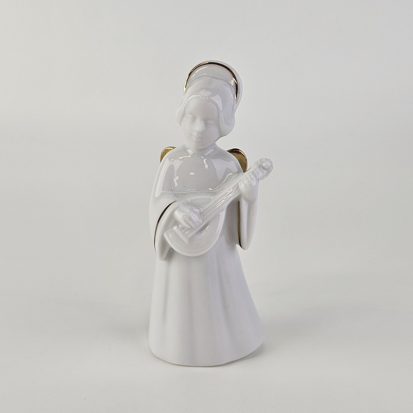 Text available in Danish: Figur med motiv af en engel som spiller på mandolin. Figuren er i hvidt porcelæn med forgyldte vinger og detaljer i 24 karat guld.