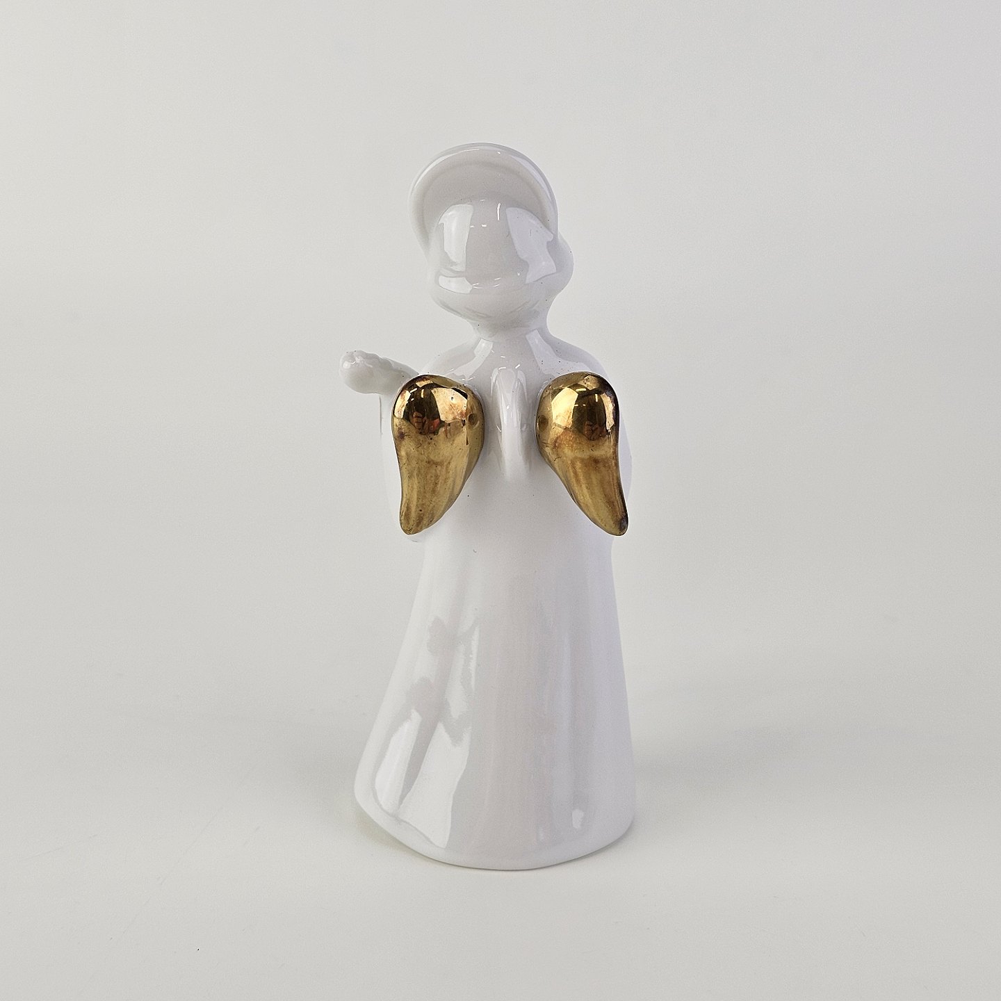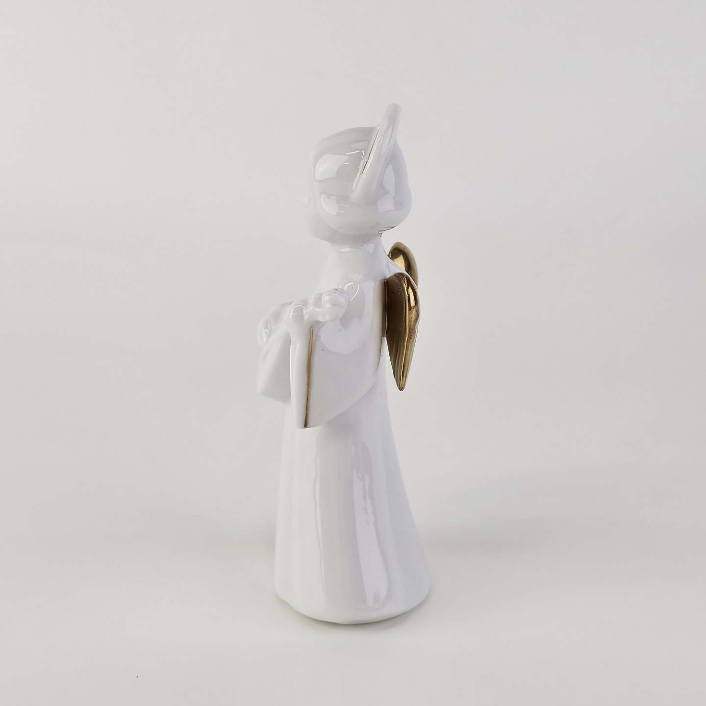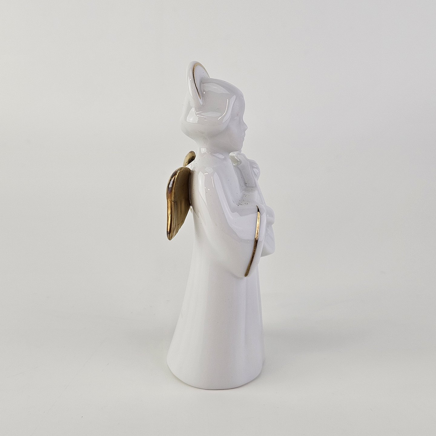 Text available in Danish: Figur med motiv af en engel som spiller på mandolin. Figuren er i hvidt porcelæn med forgyldte vinger og detaljer i 24 karat guld.