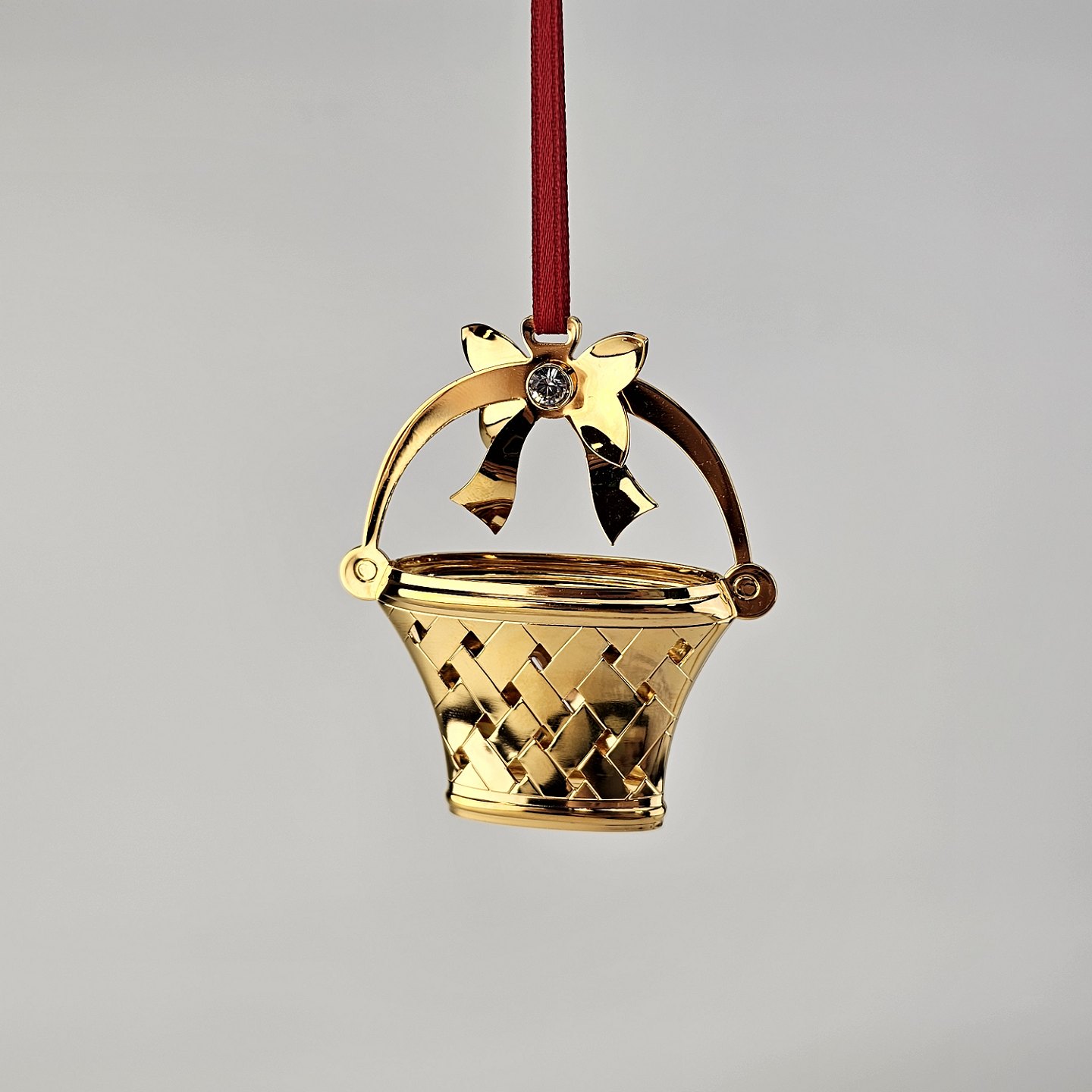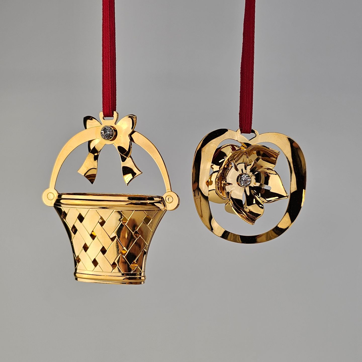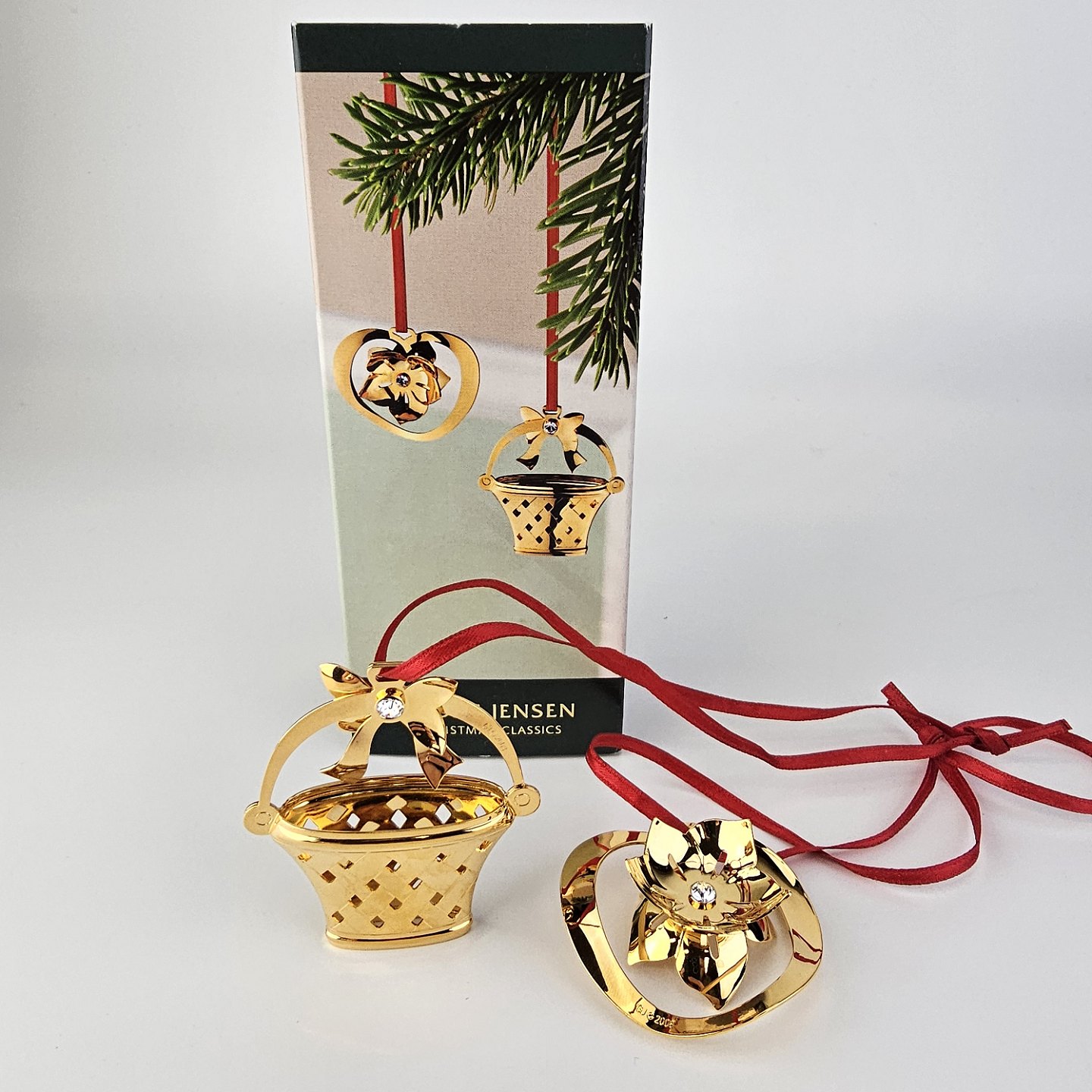 Text available in Danish: To juleornamenter til ophæng med form af en kurv og en julerose i messing forgyldt med 24 karat guld