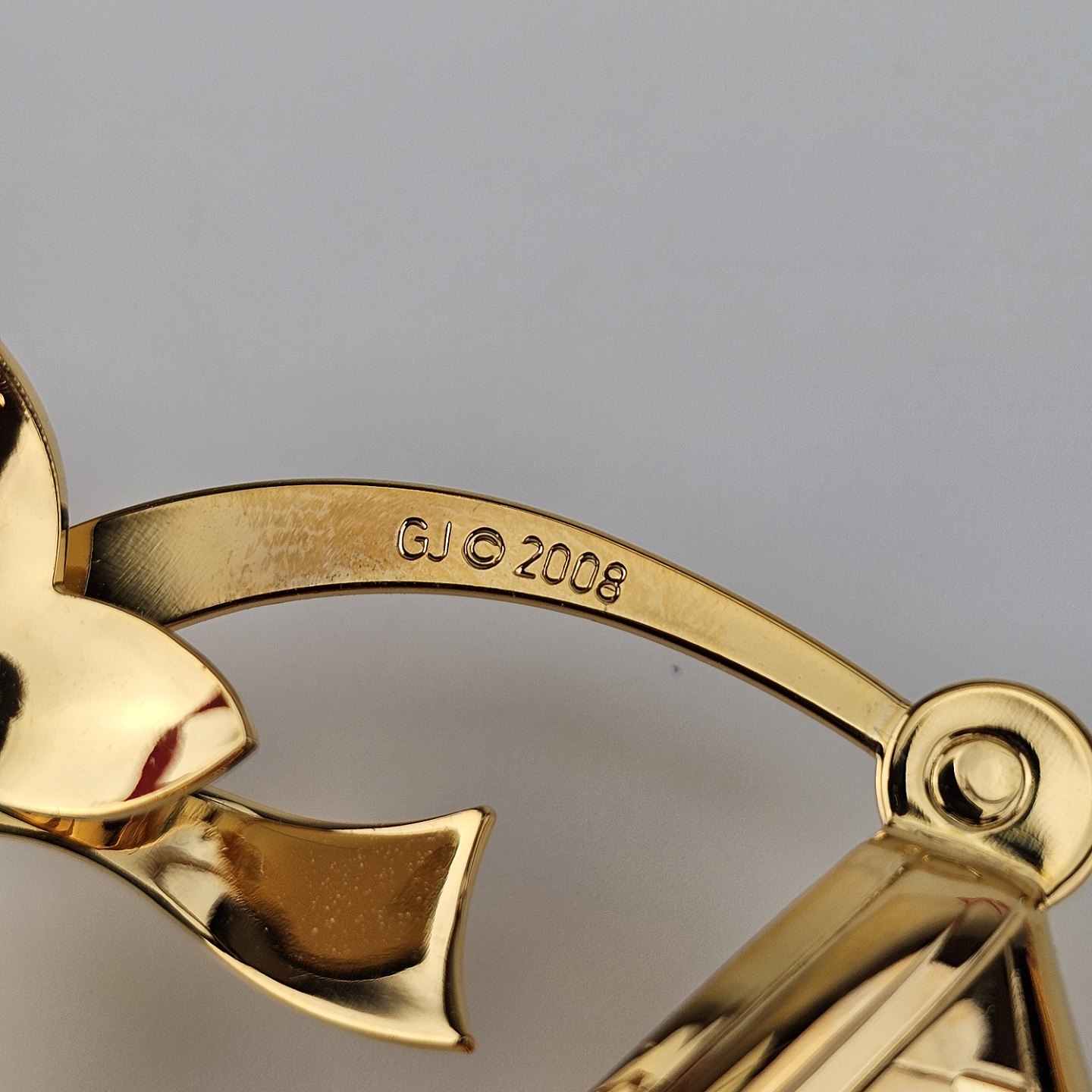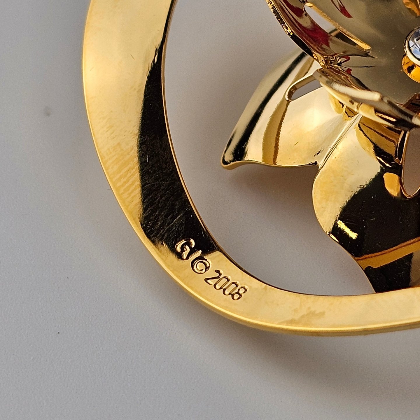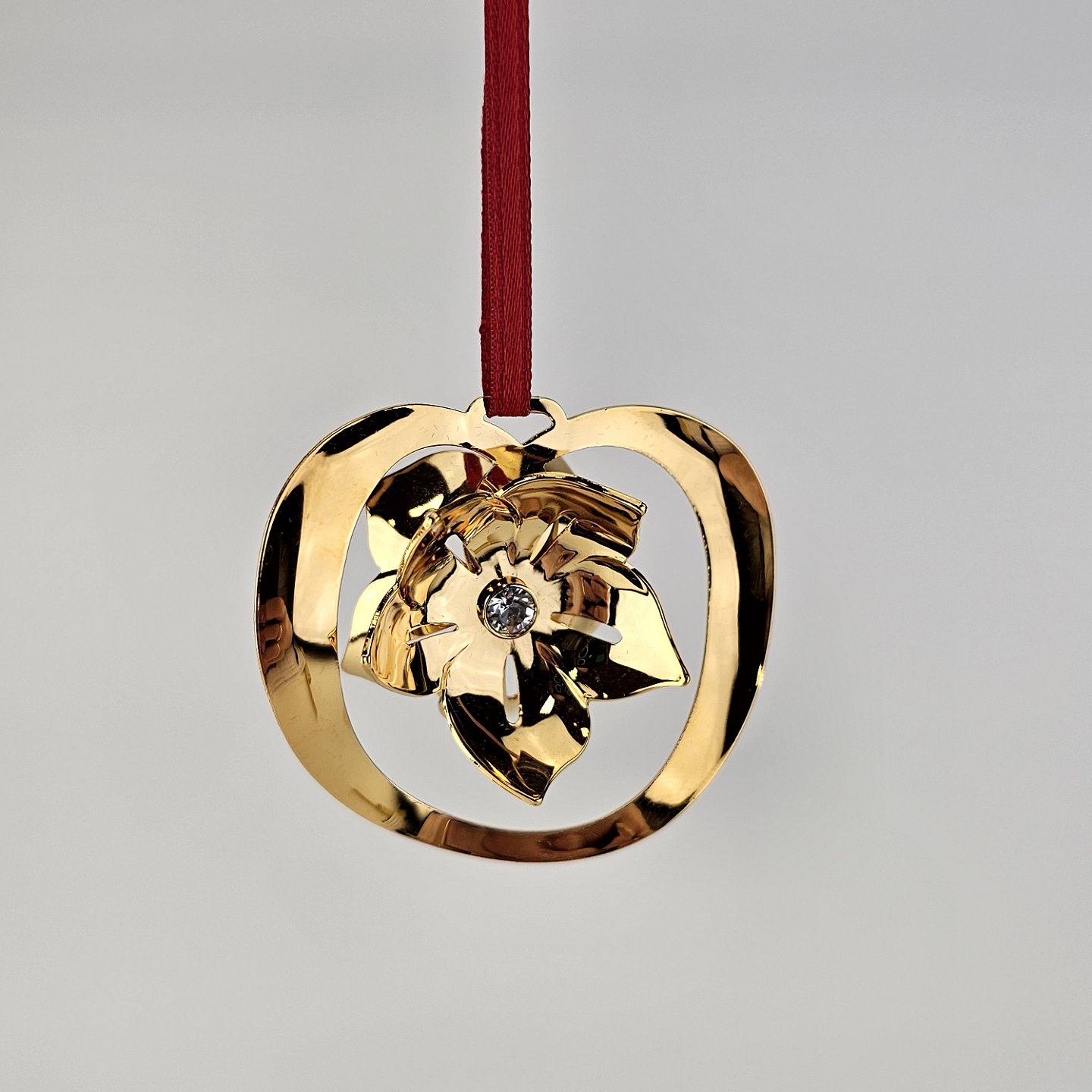 Text available in Danish: To juleornamenter til ophæng med form af en kurv og en julerose i messing forgyldt med 24 karat guld