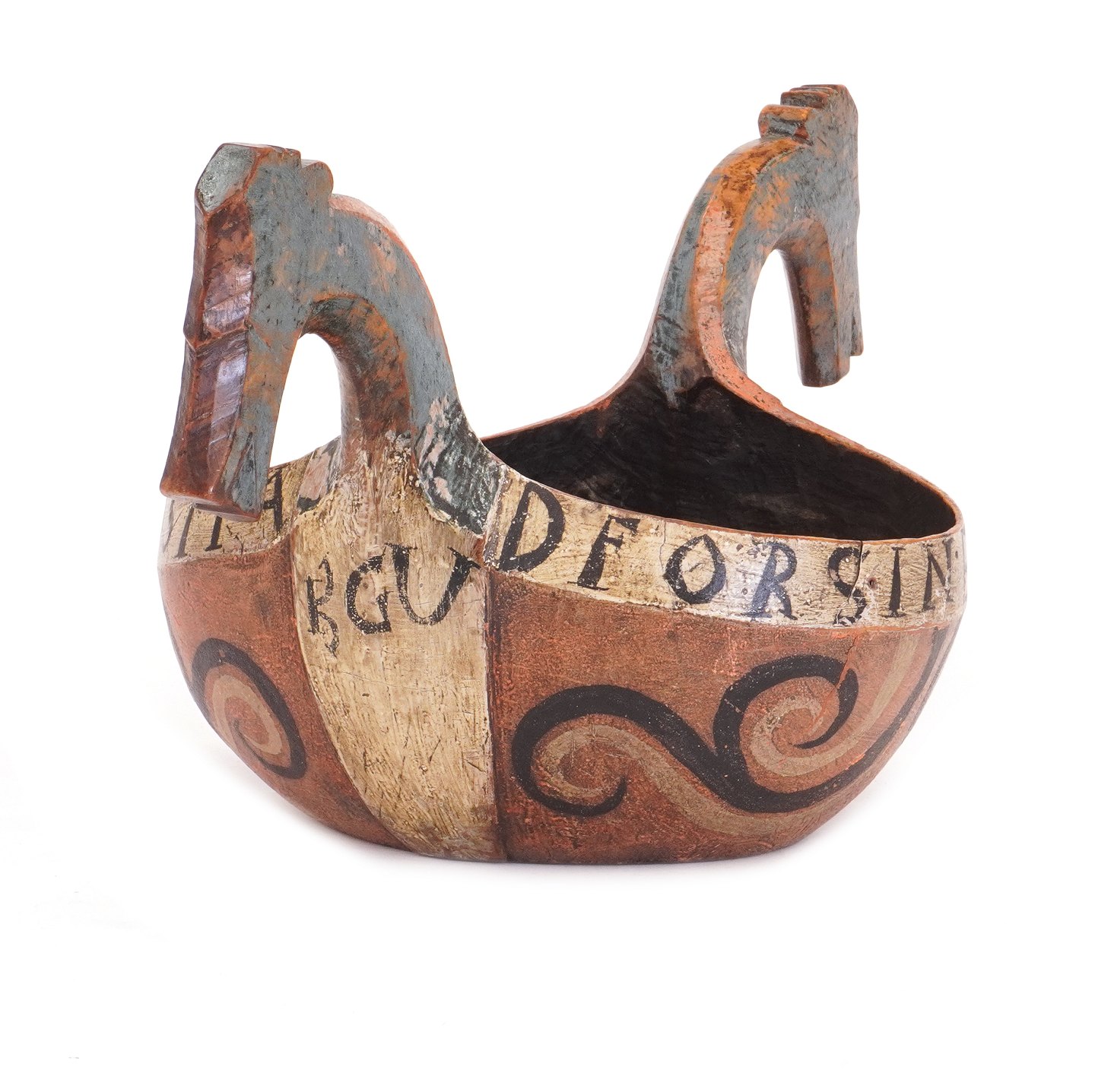 Norwegian early 19th century wood cut drinking bowl dated 1803. H: 21cm. L: 41cm