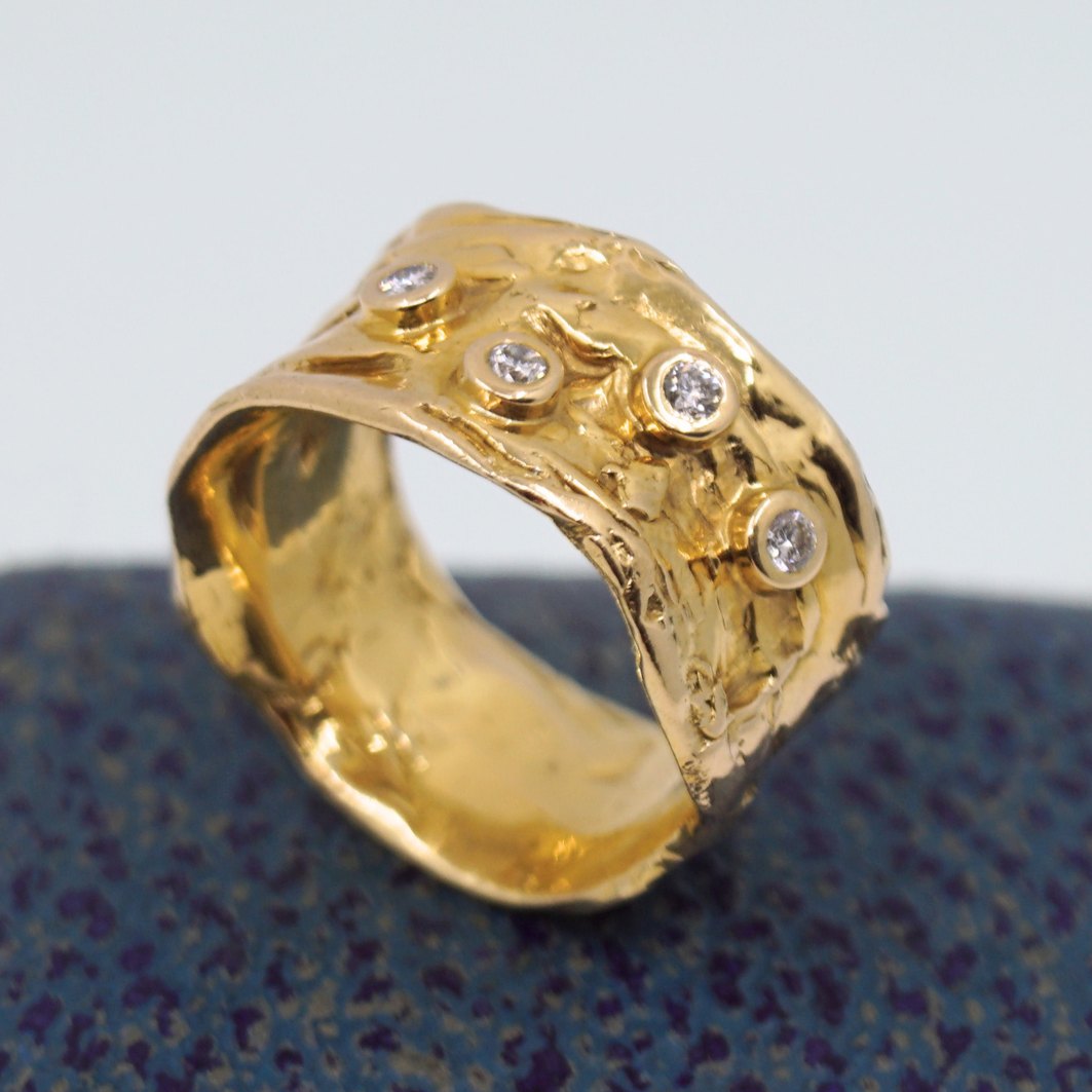 Henning Skovgaard; Wide ring in 14k gold, set with four diamonds, total 0.20 ct. Ring size 53. Stamped "585 GIG".