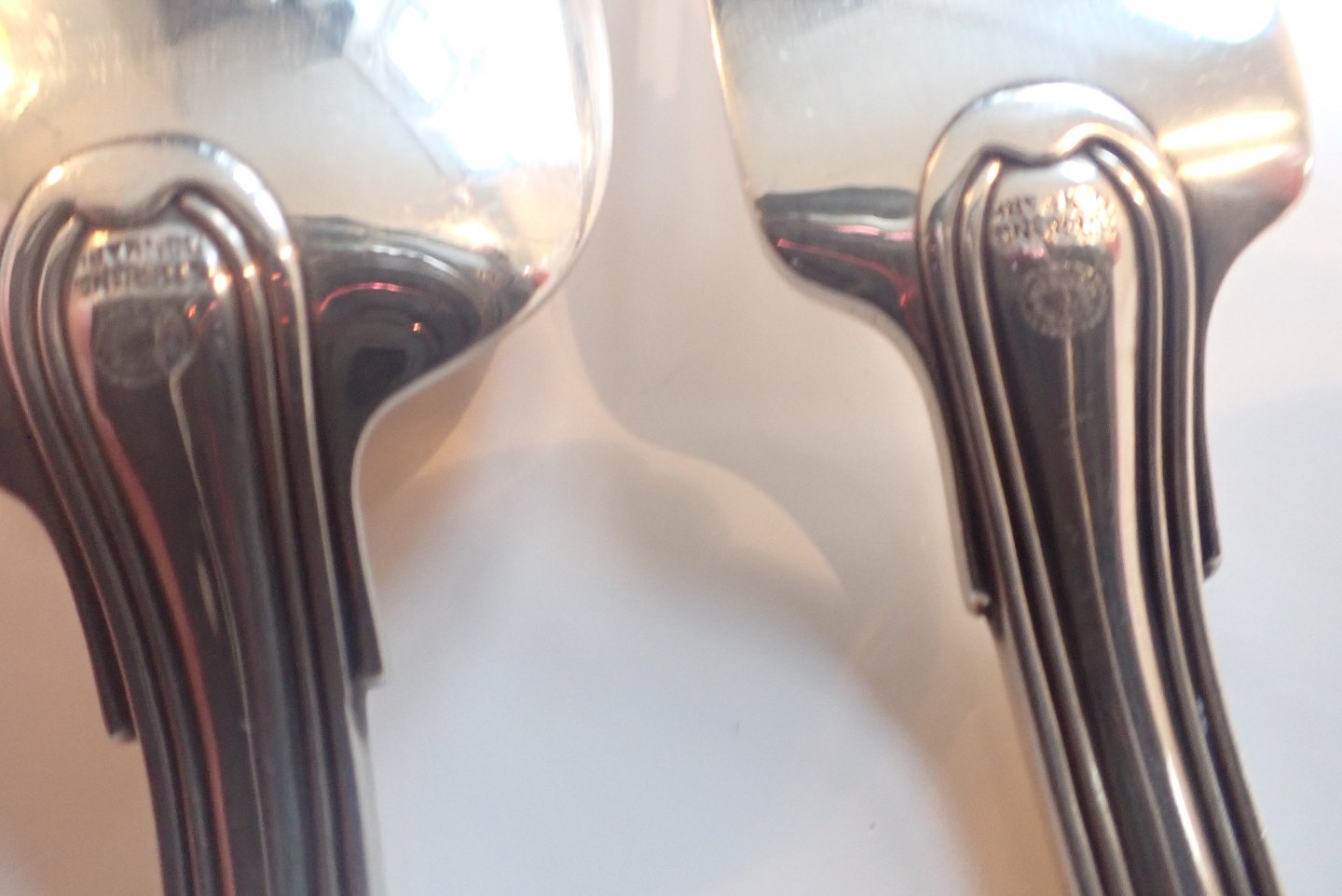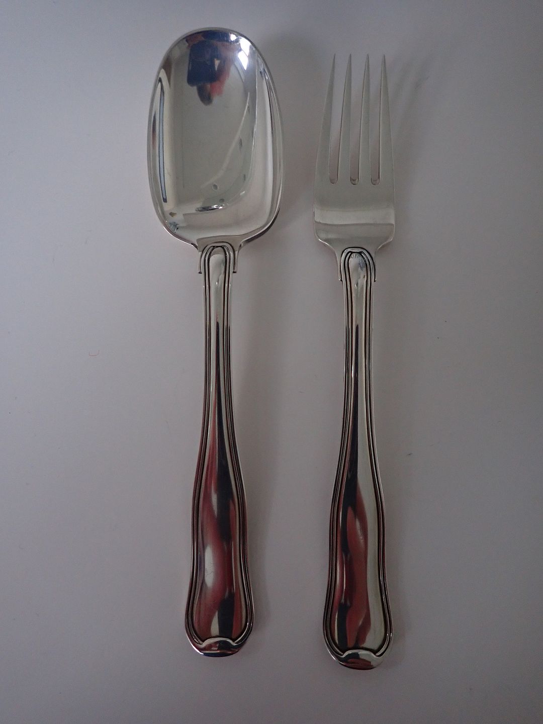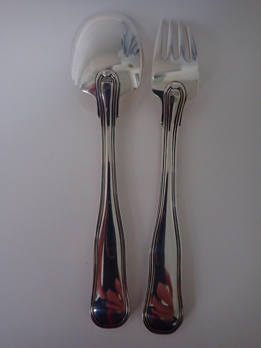 Text available in Danish: Georg Jensen -dobbeltriflet barnesæt med ske og gaffel i sterling sølv. Efter 1945. Samlet vægt: 79,5 gram. Længde på ske: 15,4 cm. Længde på gaffel 15,2 cm. I fin nærmest ubrugt stand.