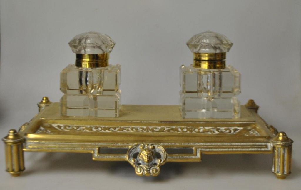 Antique writing set in brass with crystal containers, 19th century Germany.