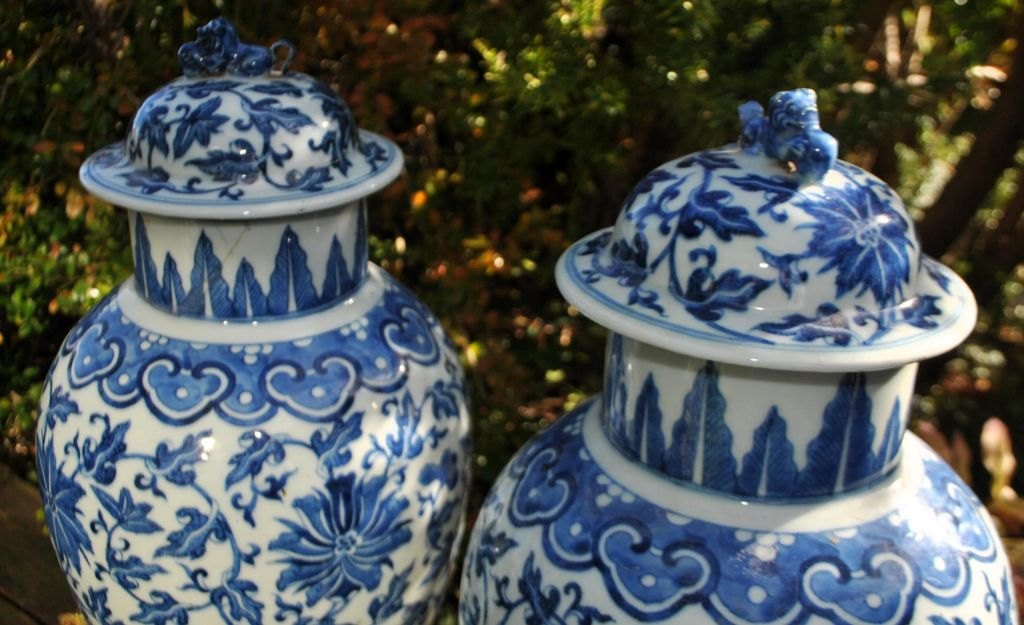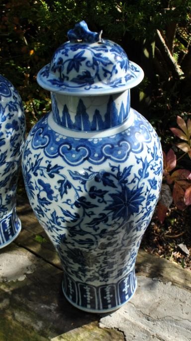 Pair of Chinese lidded jars, blue/white porcelain, 19th century.
