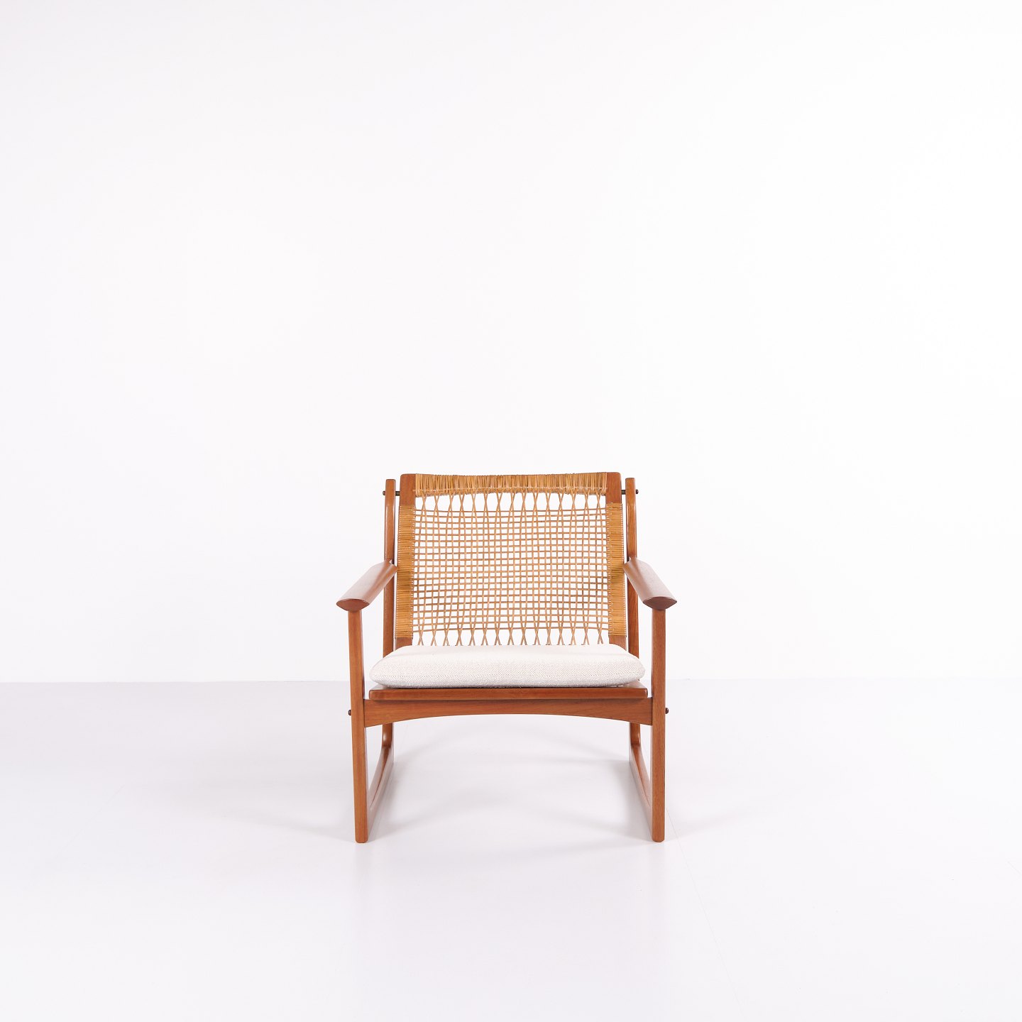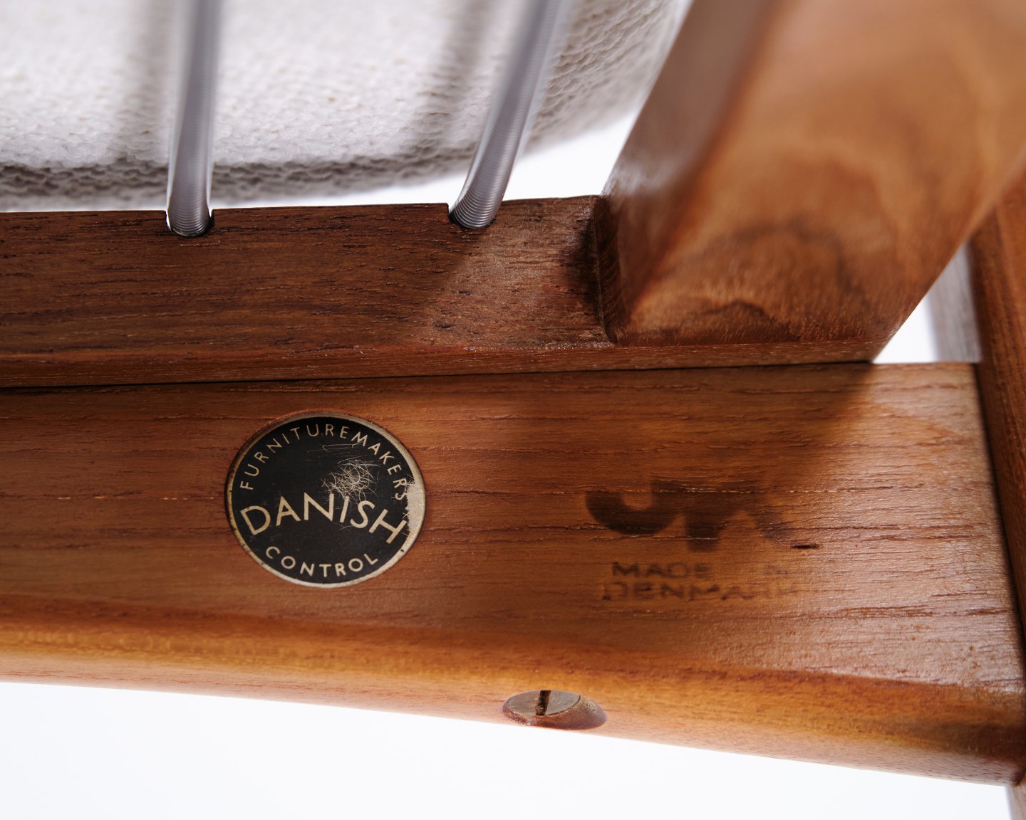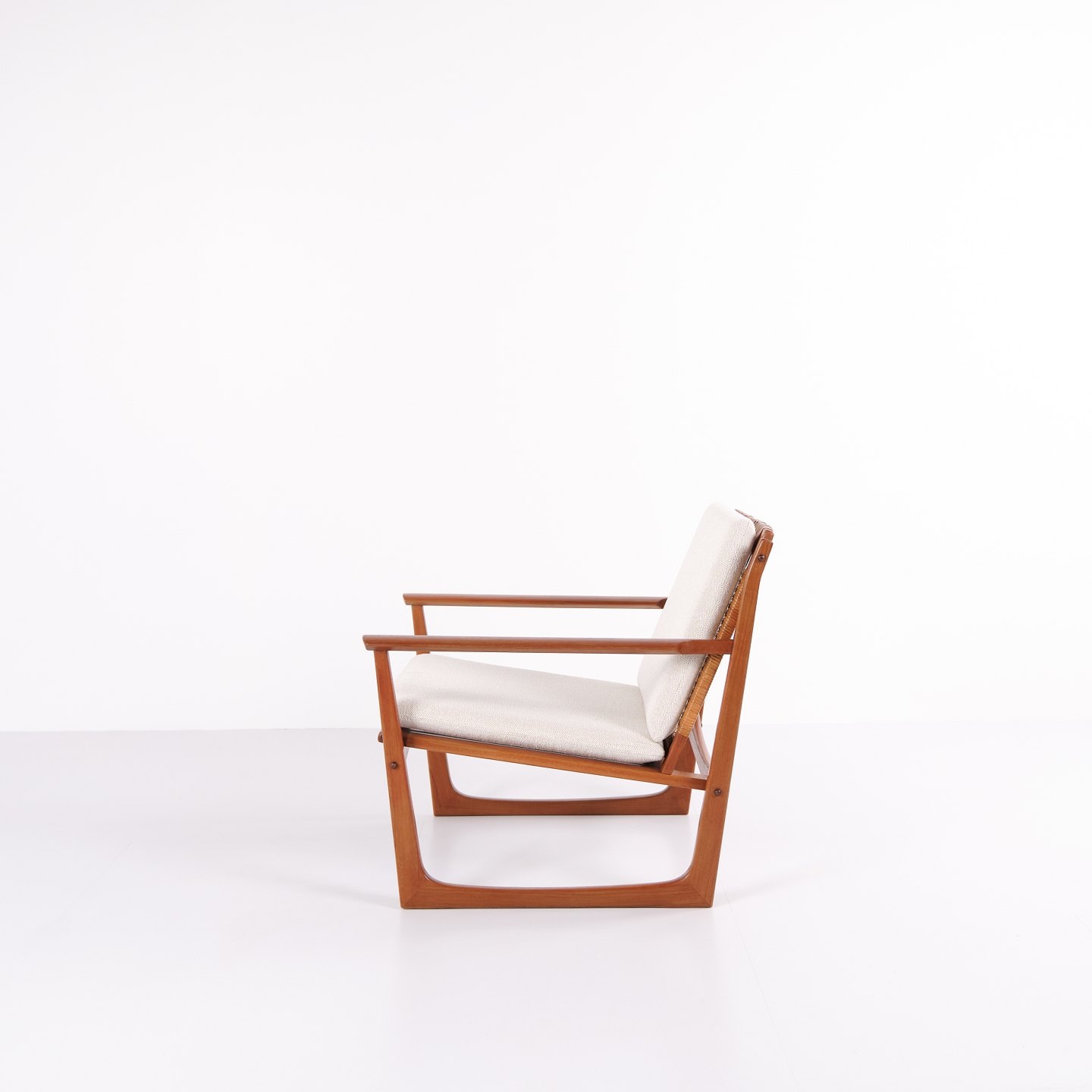 Lounge/Armchair designed by Hans Olsen and produced by Selig in the 1960s. The chair is made of solid teak with beautifully shaped armrests and legs, upholstered in light fabric that highlights the warm wood and the harmonious design.