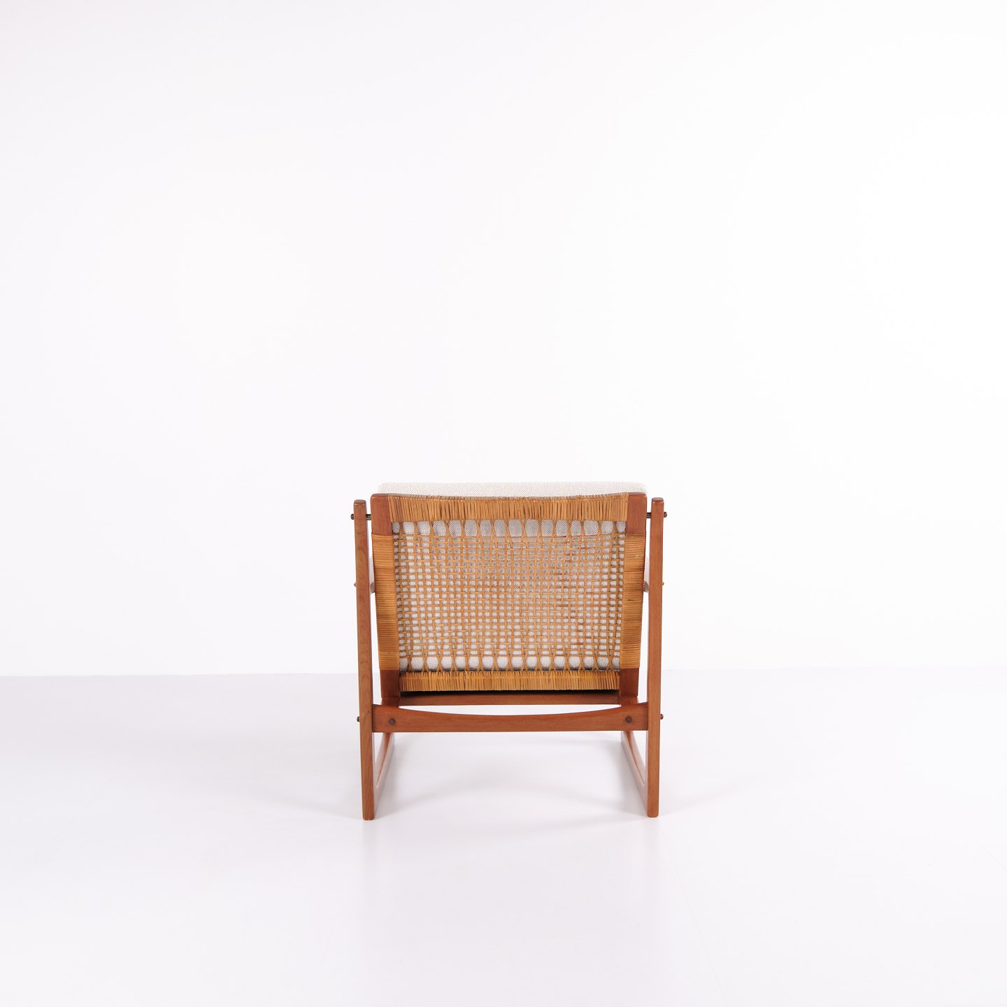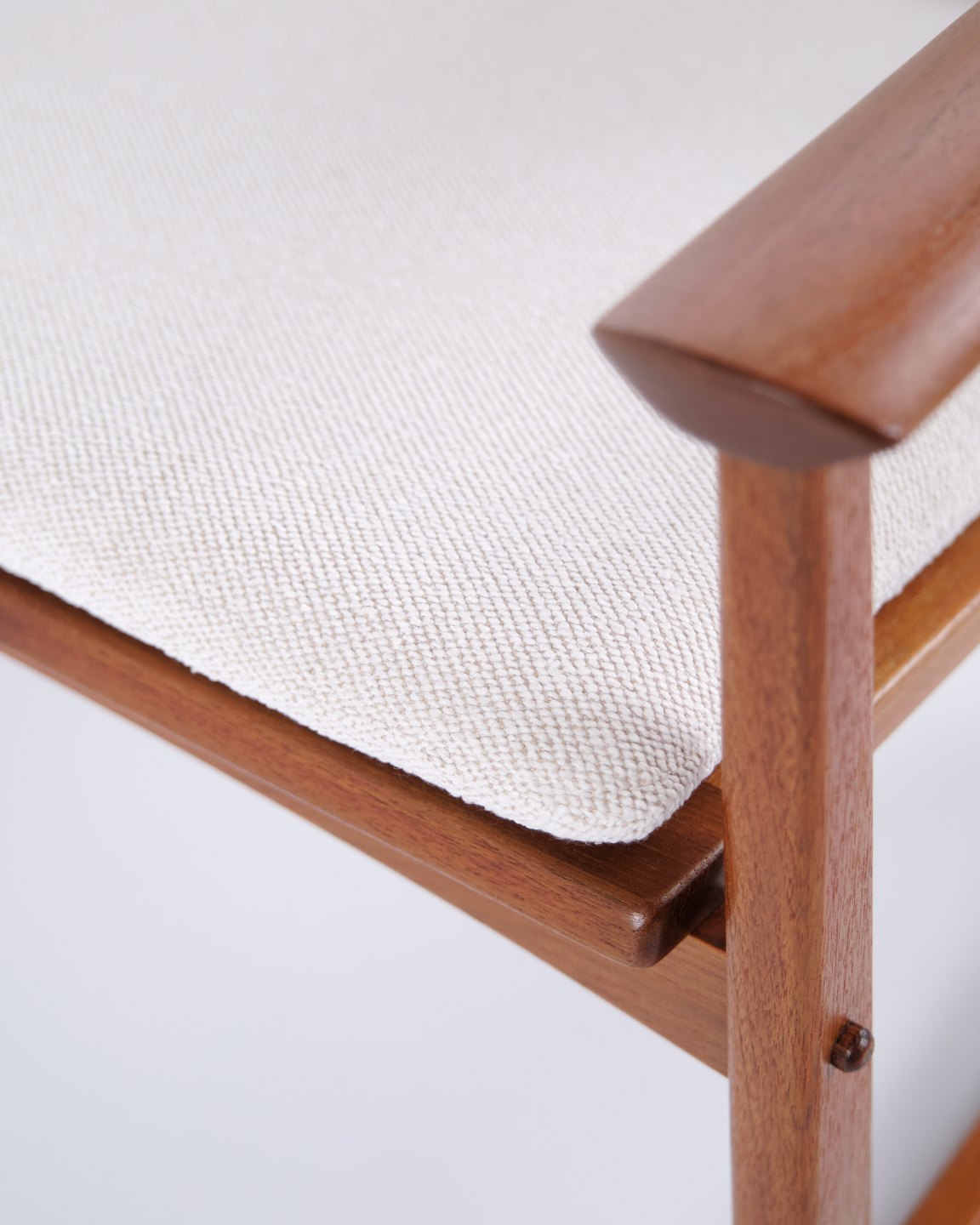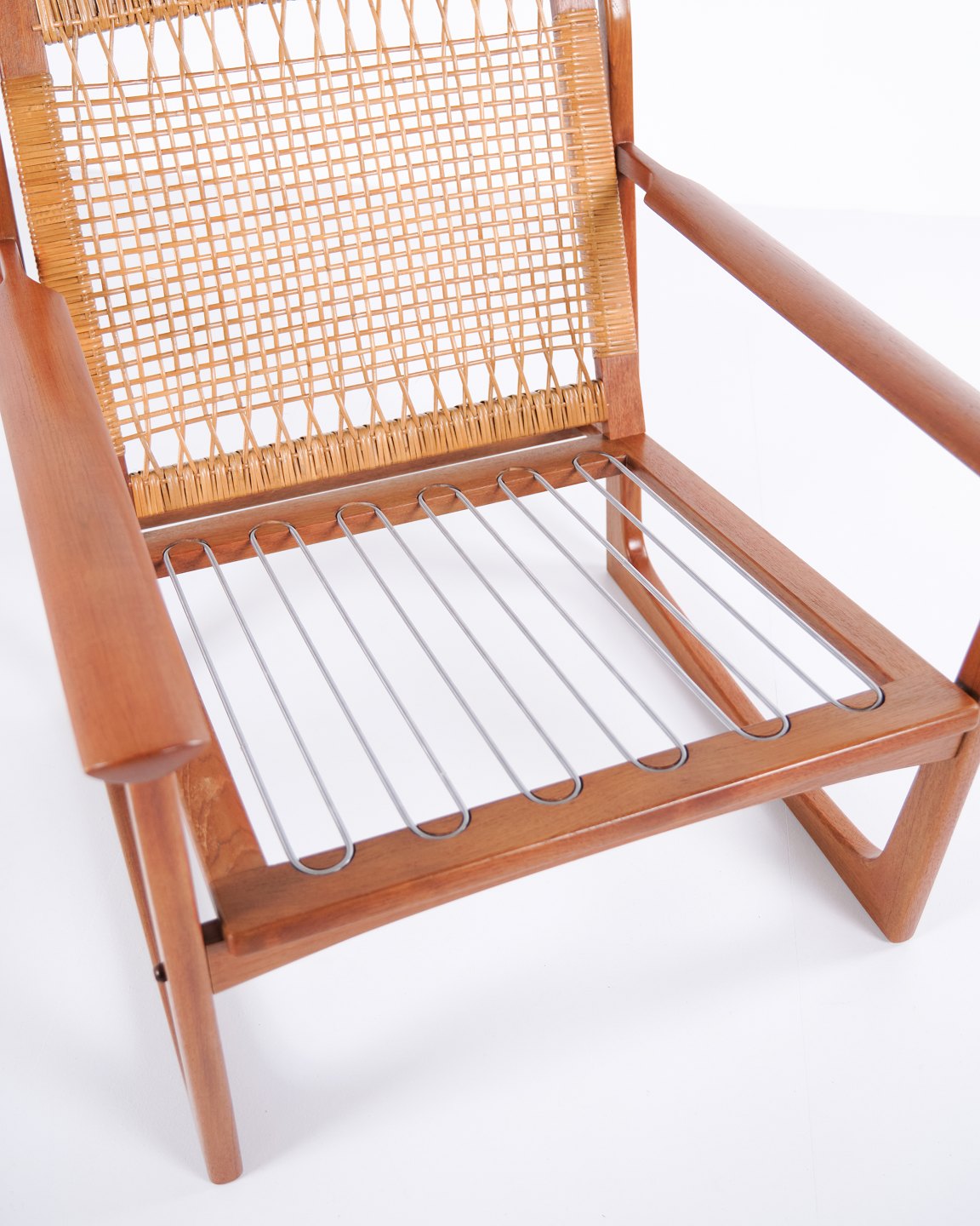 Lounge/Armchair designed by Hans Olsen and produced by Selig in the 1960s. The chair is made of solid teak with beautifully shaped armrests and legs, upholstered in light fabric that highlights the warm wood and the harmonious design.