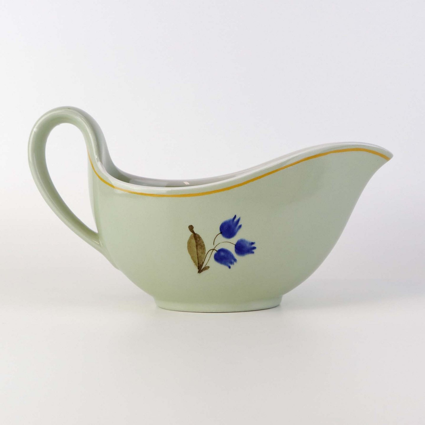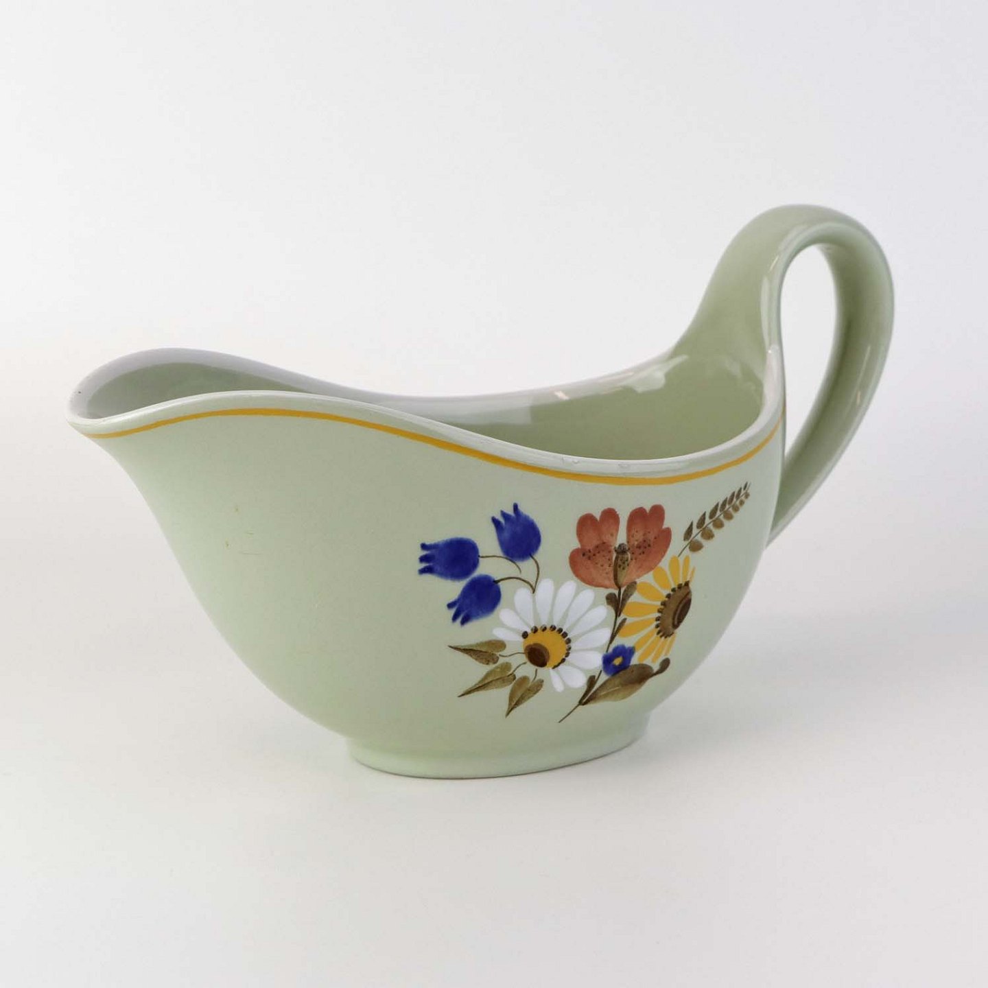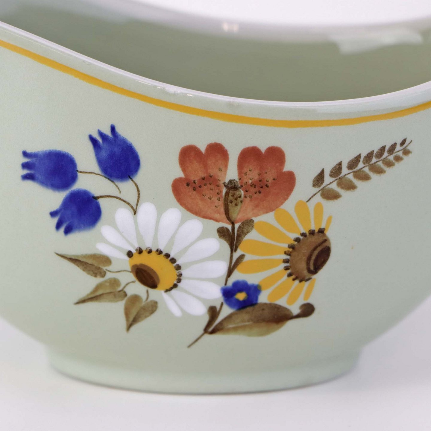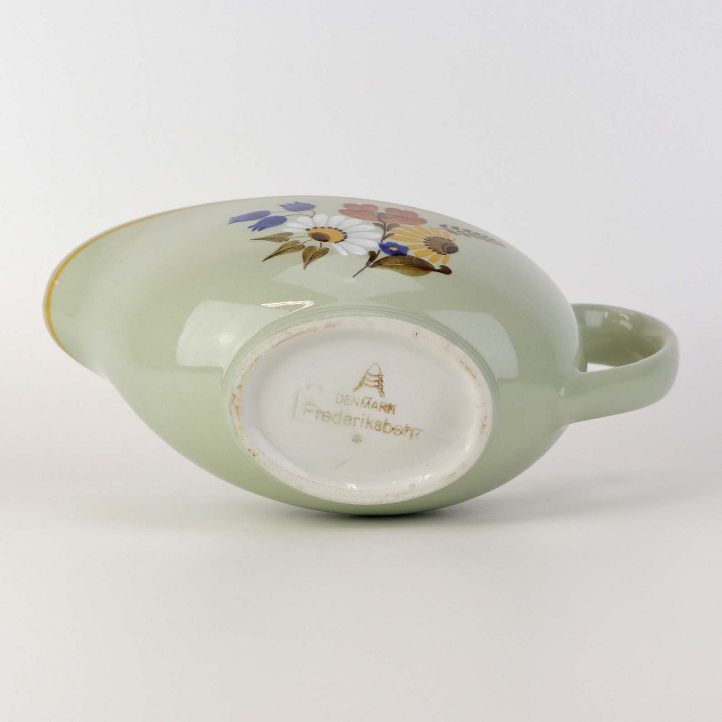 Stellet er fremstillet i perioden 1934-1963 i stelform E. Fajancestel i lys grøn farve dekoreret med forskelligfarvede blomster og gul bort.