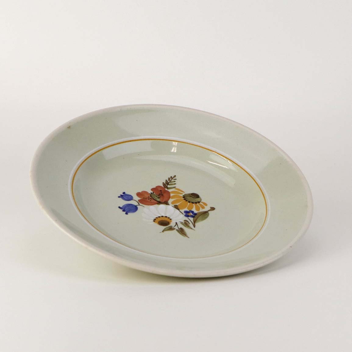 Fremstår med mindre sorte nister og mørkning under glasuren på tallerkens frontside.