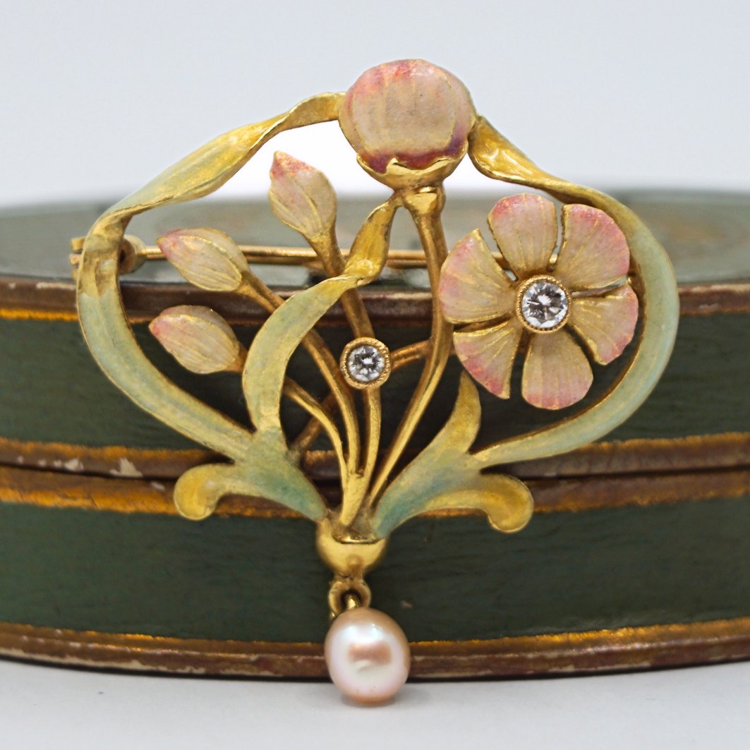 An Art Nouveau brooch in 18k gold with enamel, diamonds and pearl |