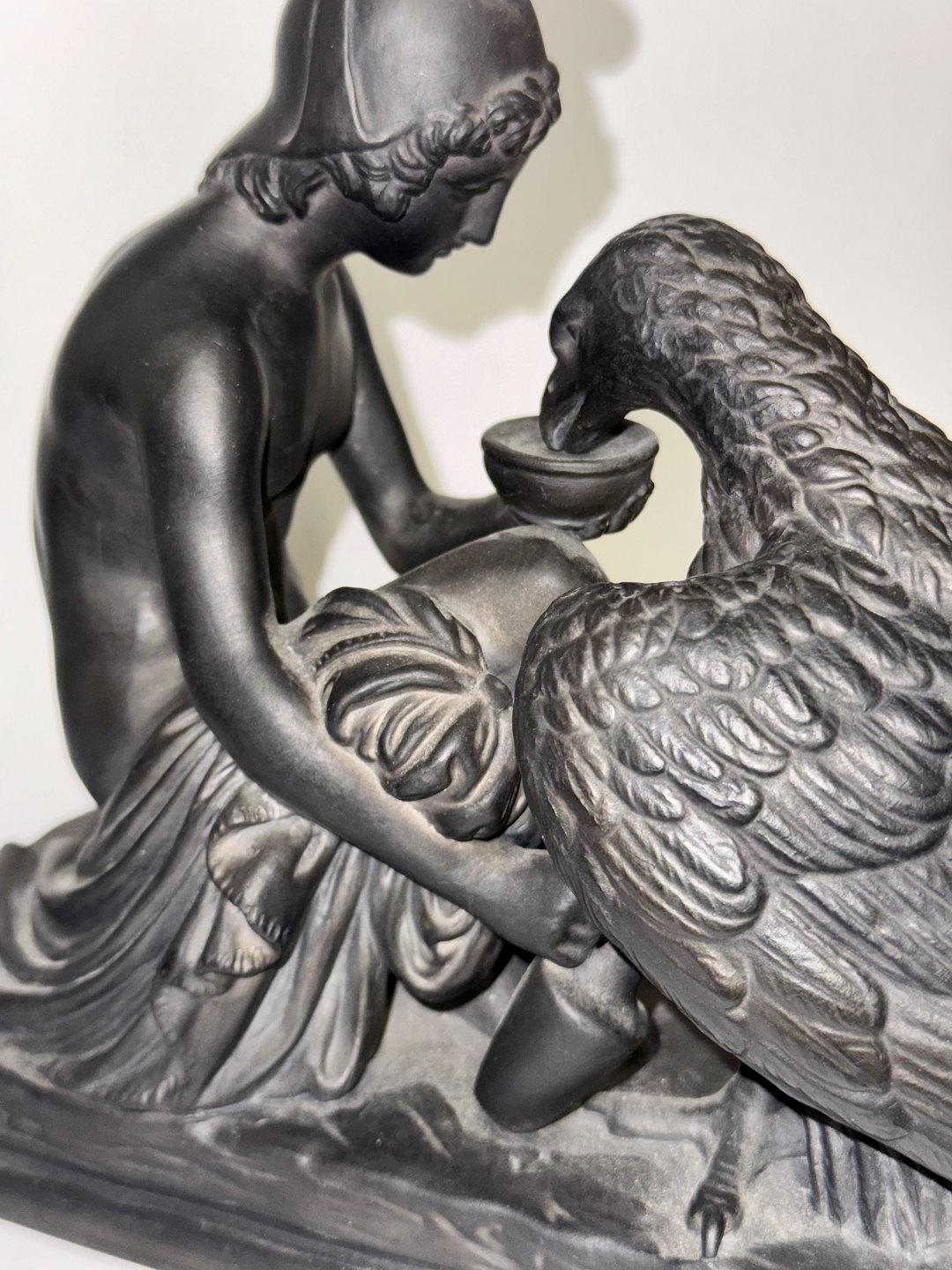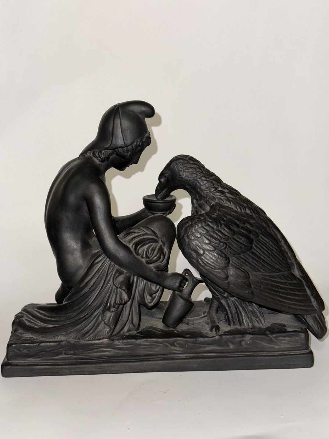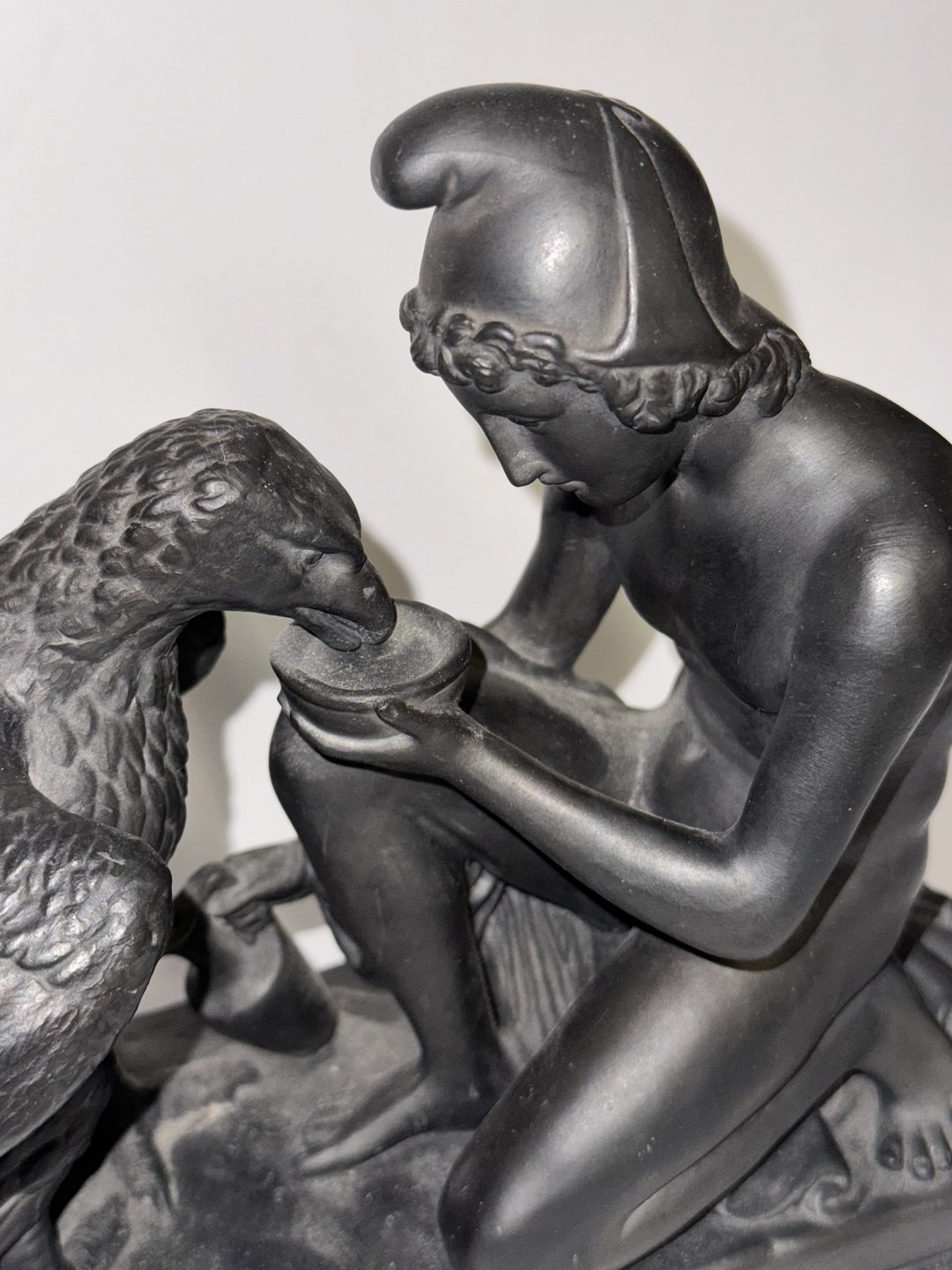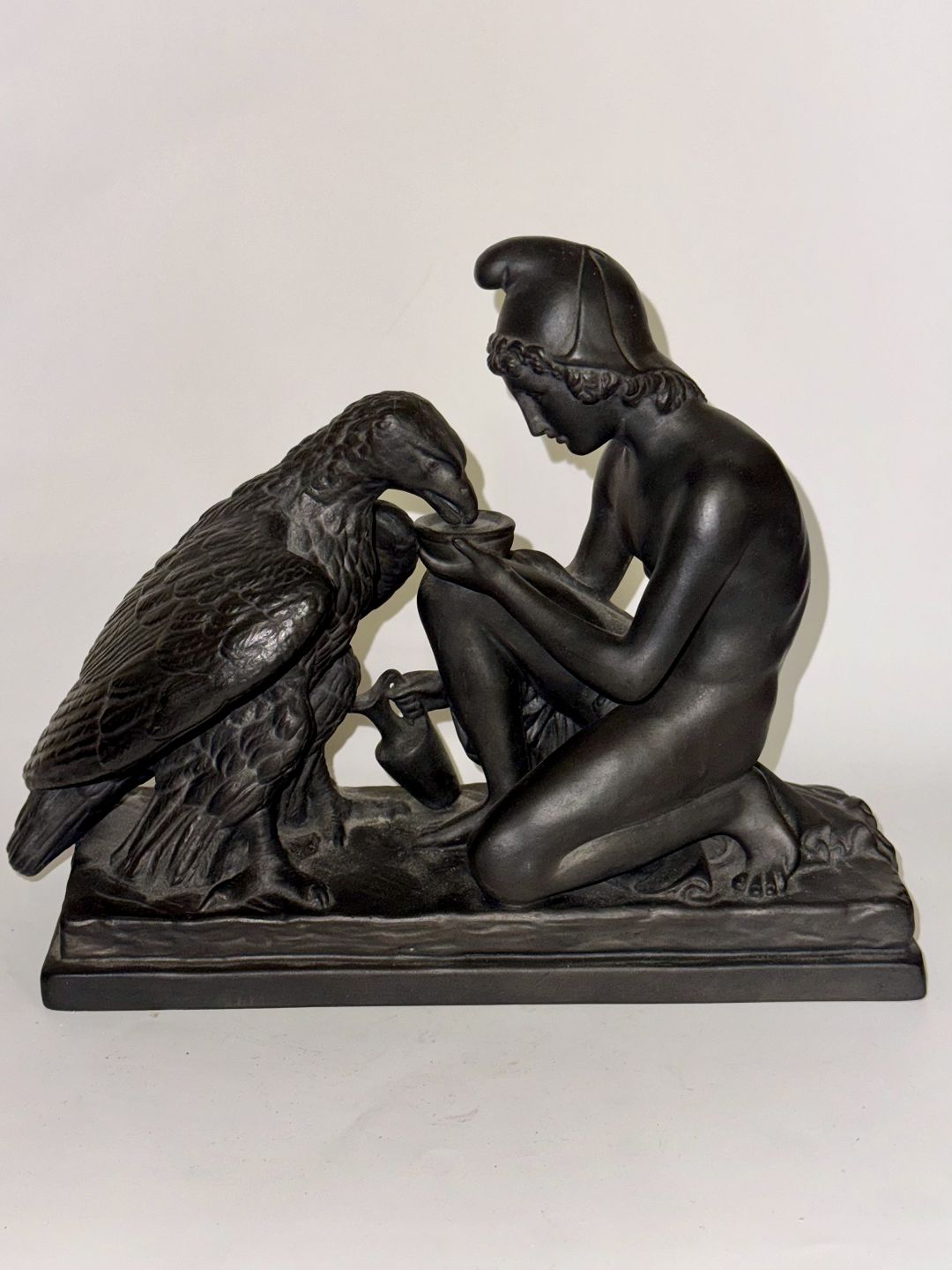 Ceramic figurine (black basalt) depicting Ganymede with Jupiter's eagle by Bertel Thorvaldsen (1770-1844) Designed in Rome 1817-18. This copy from the Copenhagen pottery factory Peter Ipsen was made around 1900. According to Greek mythology, Jupiter's eagle abducts Ganymede in order to make him the cupbearer (servant) of the gods. Factory mark on the bottom with P. Ipsen, KJØBENHAVN ENERET and model number 349. Dimensions: H. 19 cm. The base measures 9 x 22.5 cm