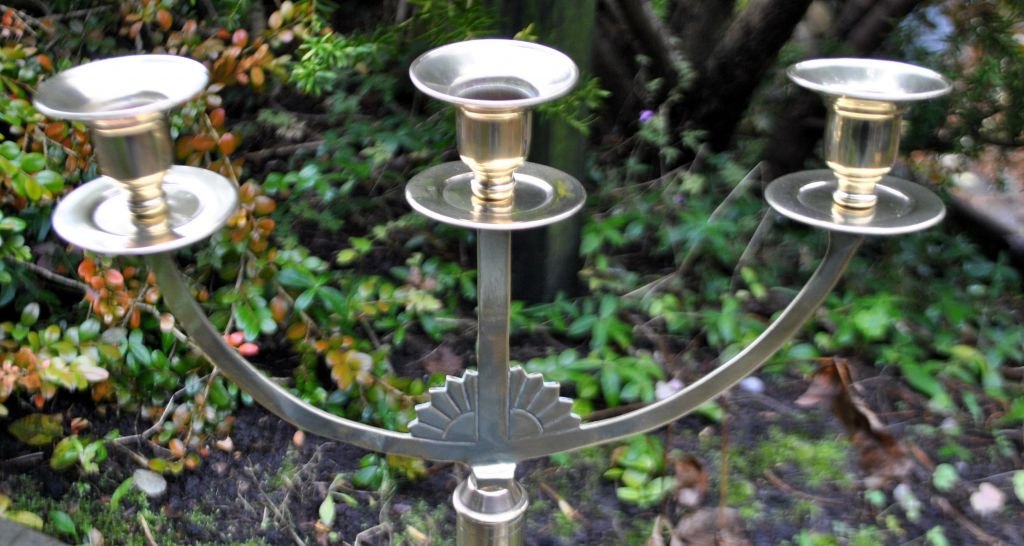 Pair of Danish Jugend three-armed candlesticks in brass, circa 1900.