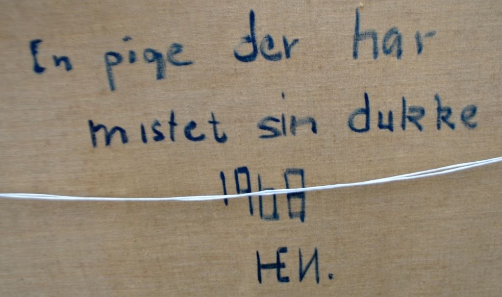 Danish artist (20th century): A girl who has lost her doll. Oil on canvas. Verso text and monogram 1968. 66 x 100 cm. Framed: 85 x 120 cm. Given as a gift to art dealer Hans Erik Nielsen, Aarhus. Presumably a work by Kaj Christensen.