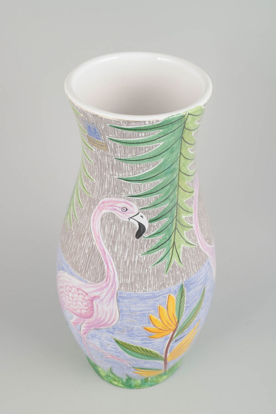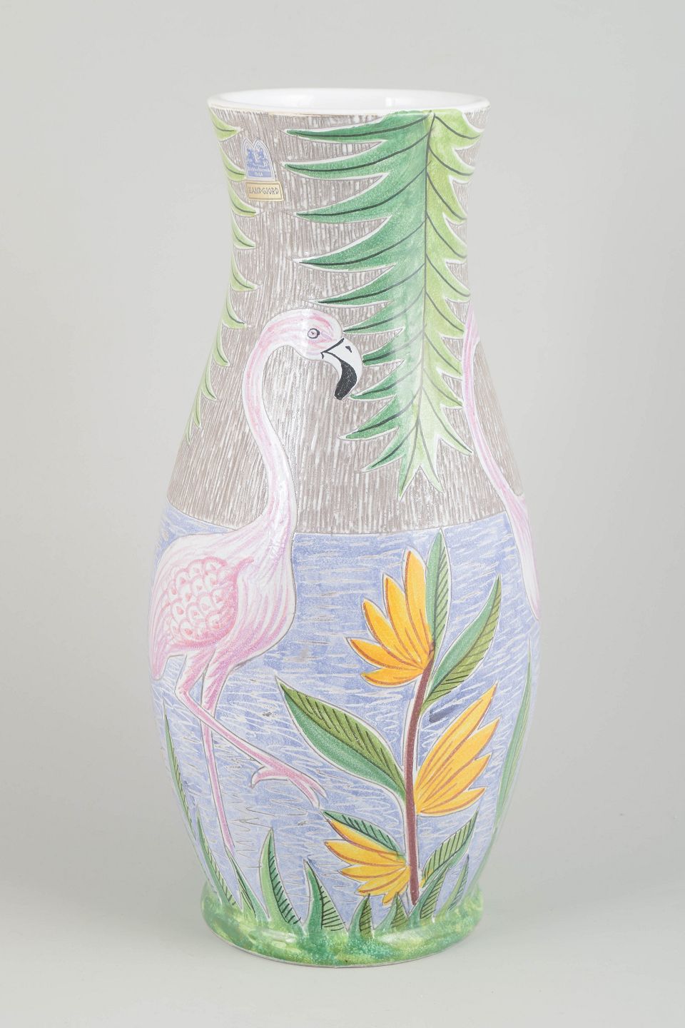 Decorative hand-painted ceramic vase featuring tropical motifs of flamingos and exotic flowers in pastel tones. Signed “Holmén” and F. Johansson at the base. A striking example of Holmén’s colourful and figurative style from Kloster Keramik.